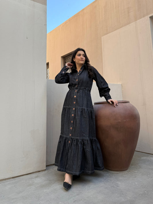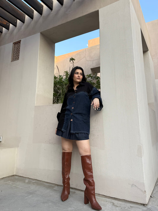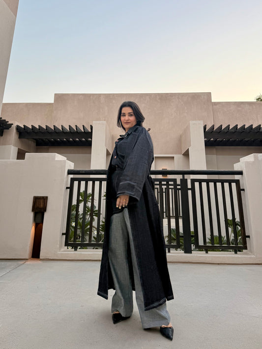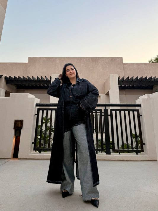 Rich, deep blue denims are layered with contrast structured details—sharp seams, sculpted panels, and reinforced silhouettes—that bring warmth, strength, and definition to every piece. Heavier fabrics, compact weaves, and precise tailoring create a sense of protection against the cold, while contrasting stitching, and architectural overlays add visual depth and modern edge.