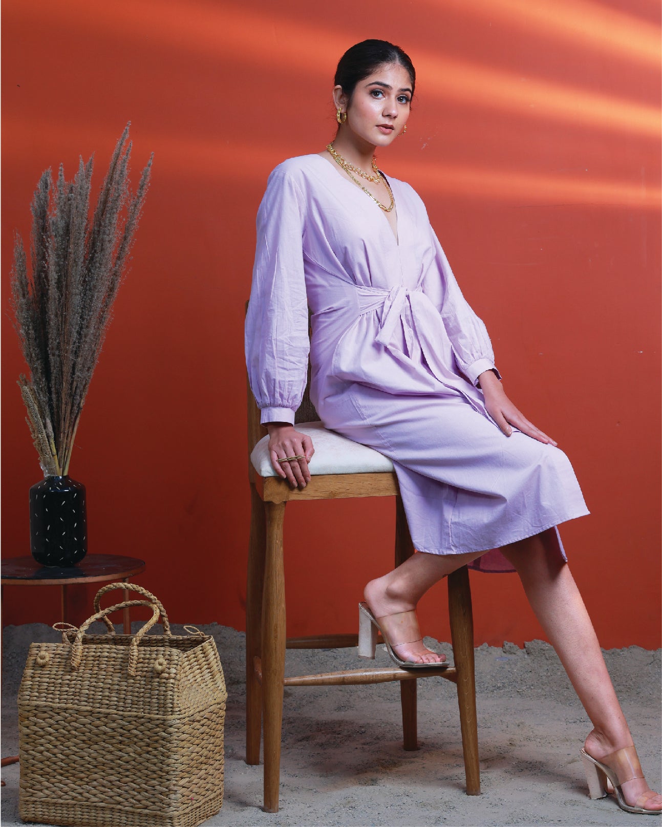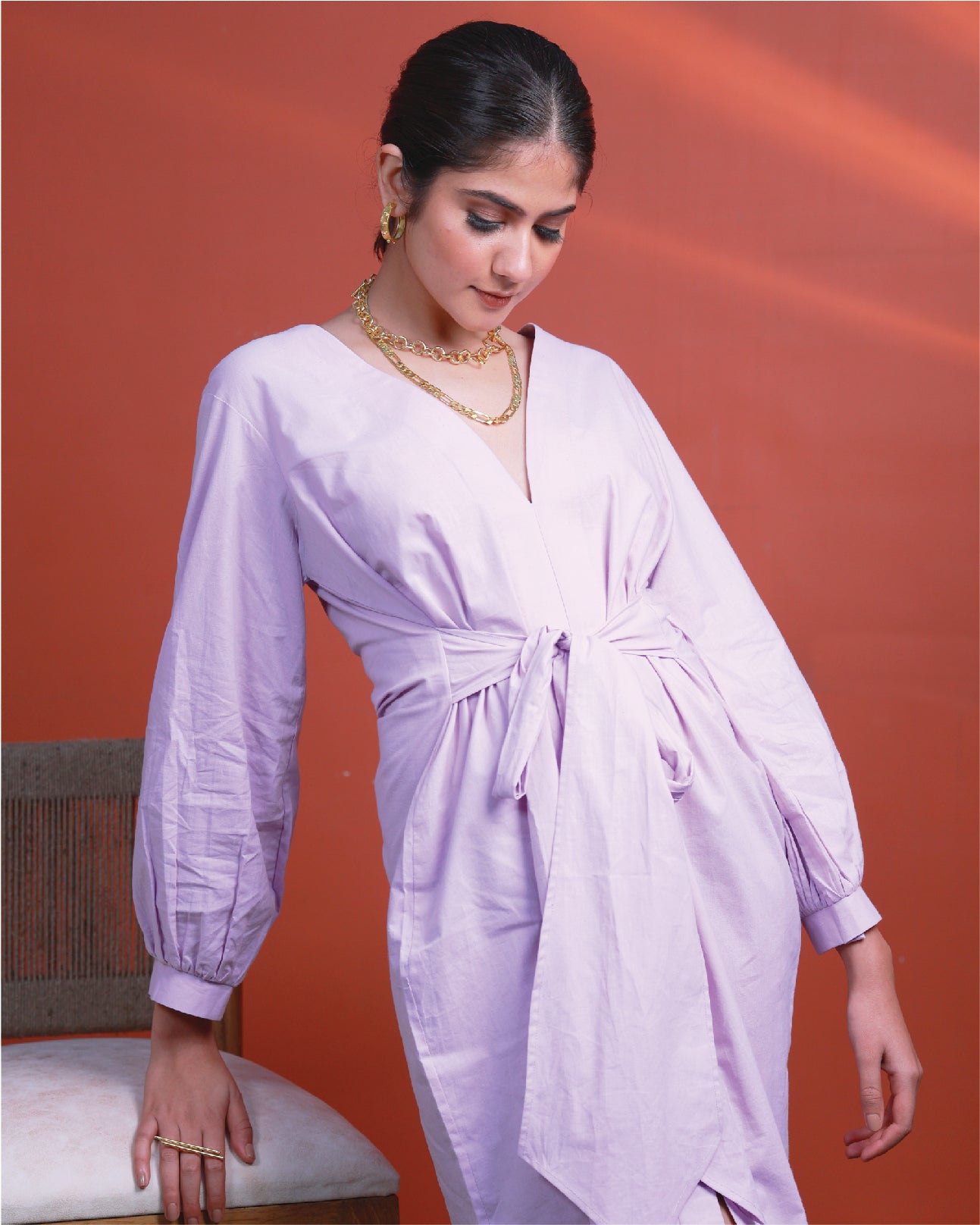Long dress featuring a V neck and cuffed sleeves .Front tie fastening in matching fabric.