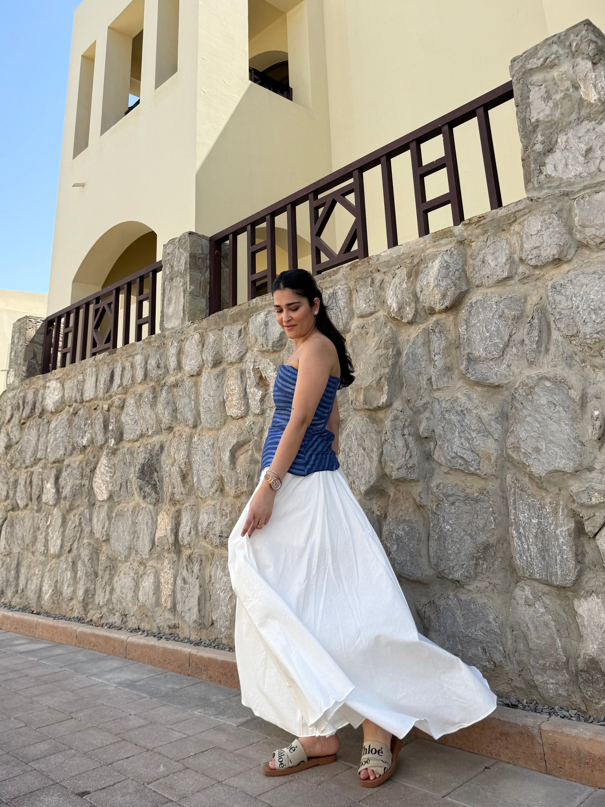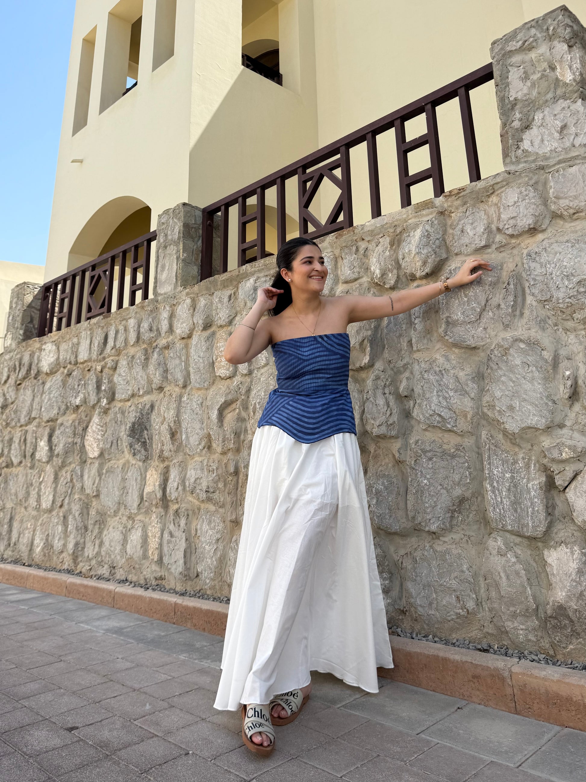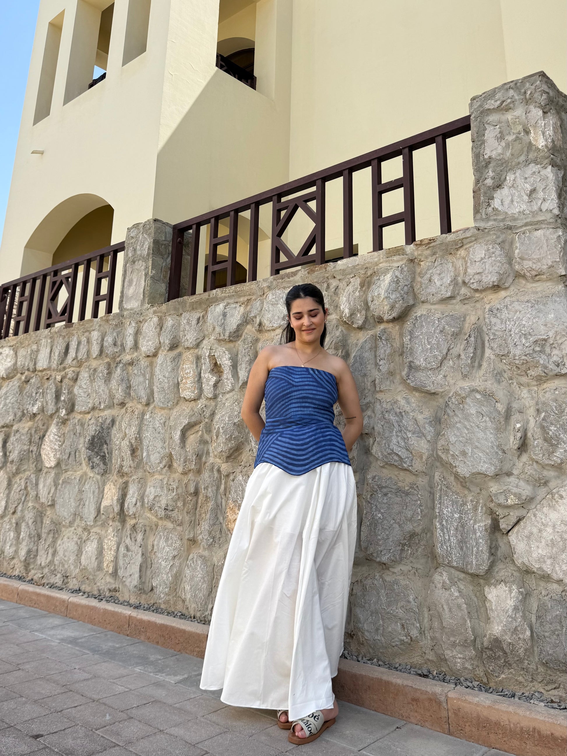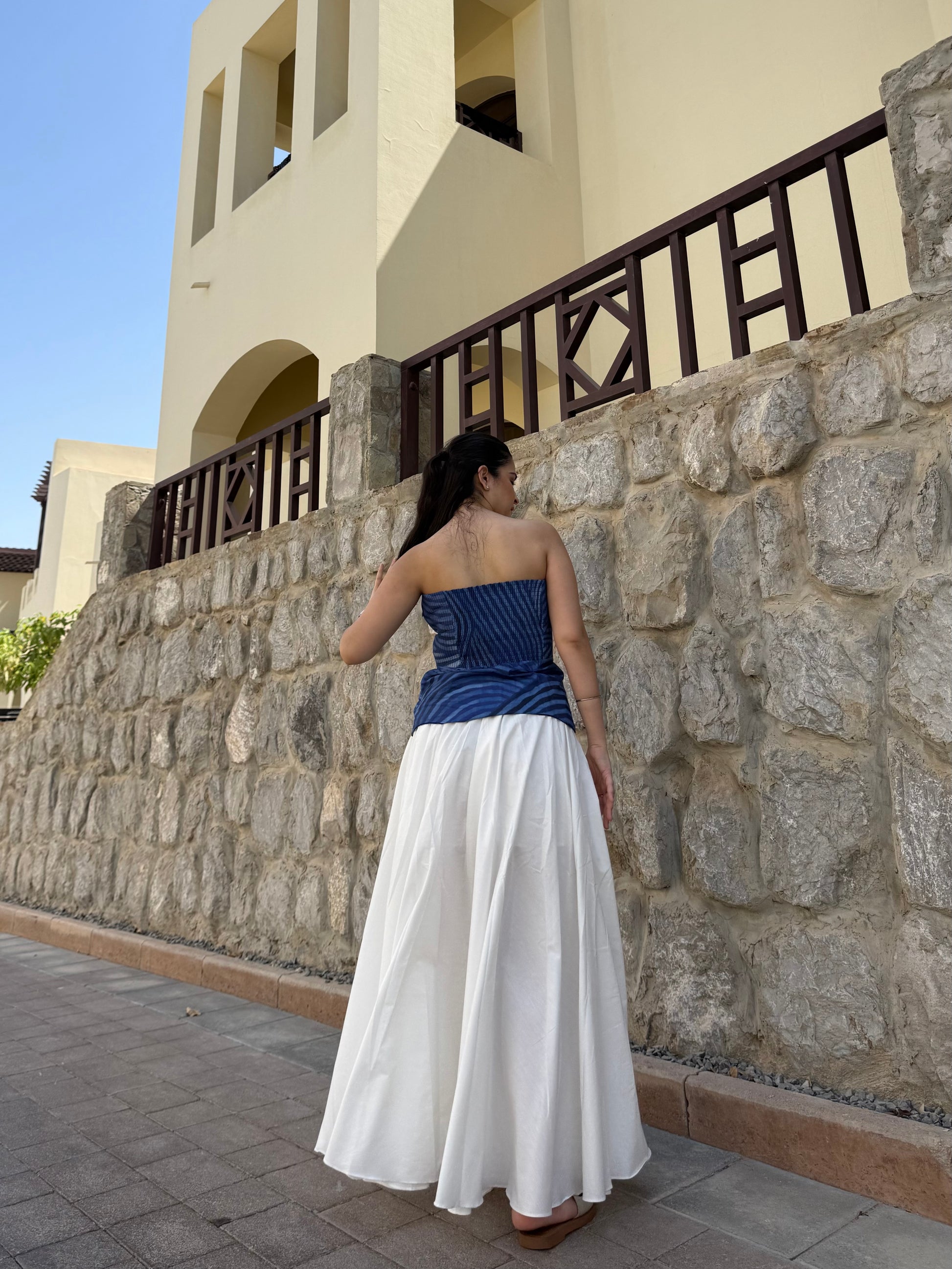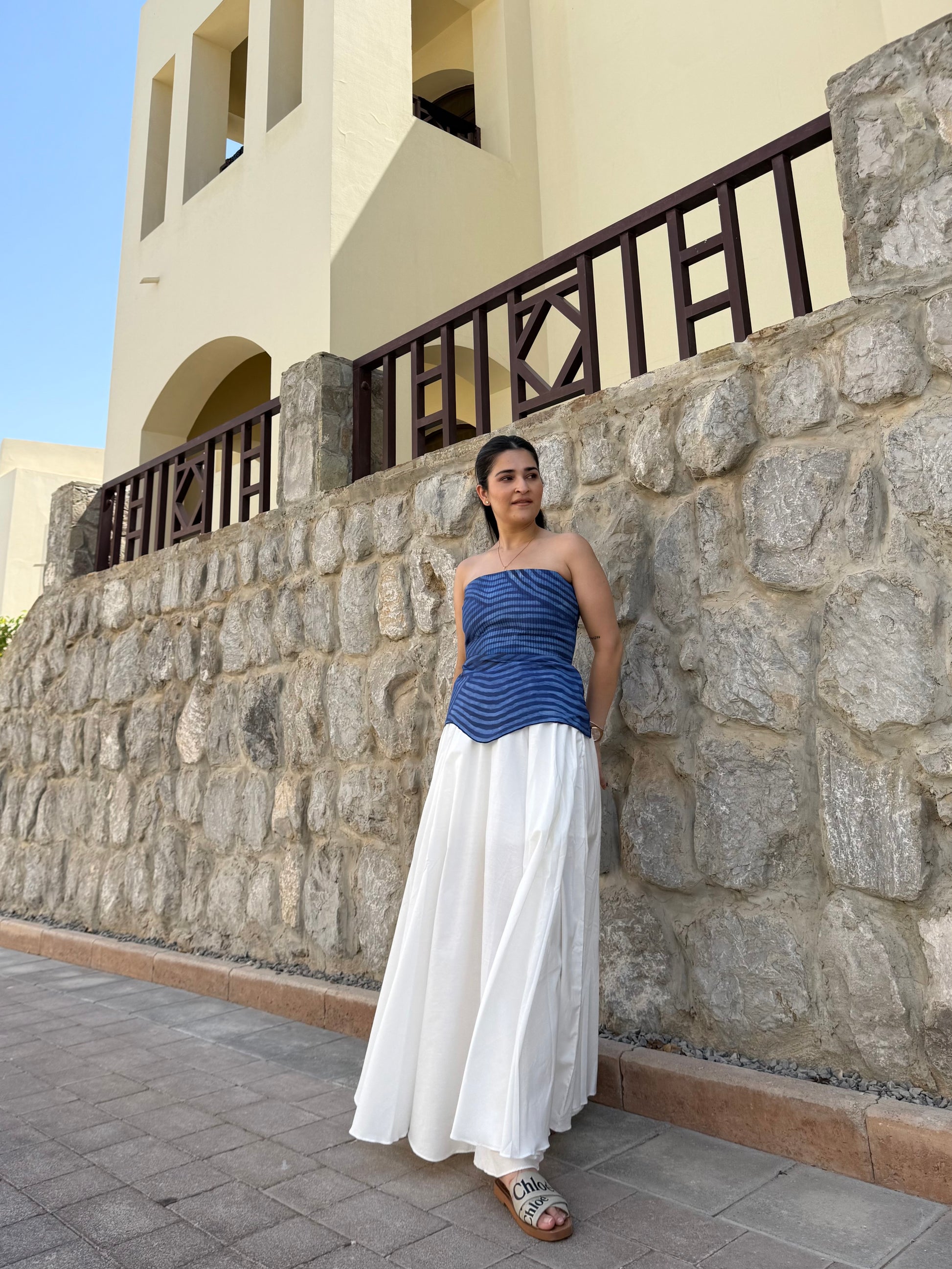 This two-piece set is all about effortless elegance with a modern twist. The corset is crafted from vibrant printed cotton, detailed with delicate cutwork at the hem for a subtle, feminine touch. Its structured shape is enhanced by stylish quilted stitching, giving you a flattering fit that holds its form beautifully. The long skirt flows with a full flare, creating a graceful silhouette that moves with every step. Together, they make a perfect combo for occasions where you want to feel confident, chic, and effortlessly put together.