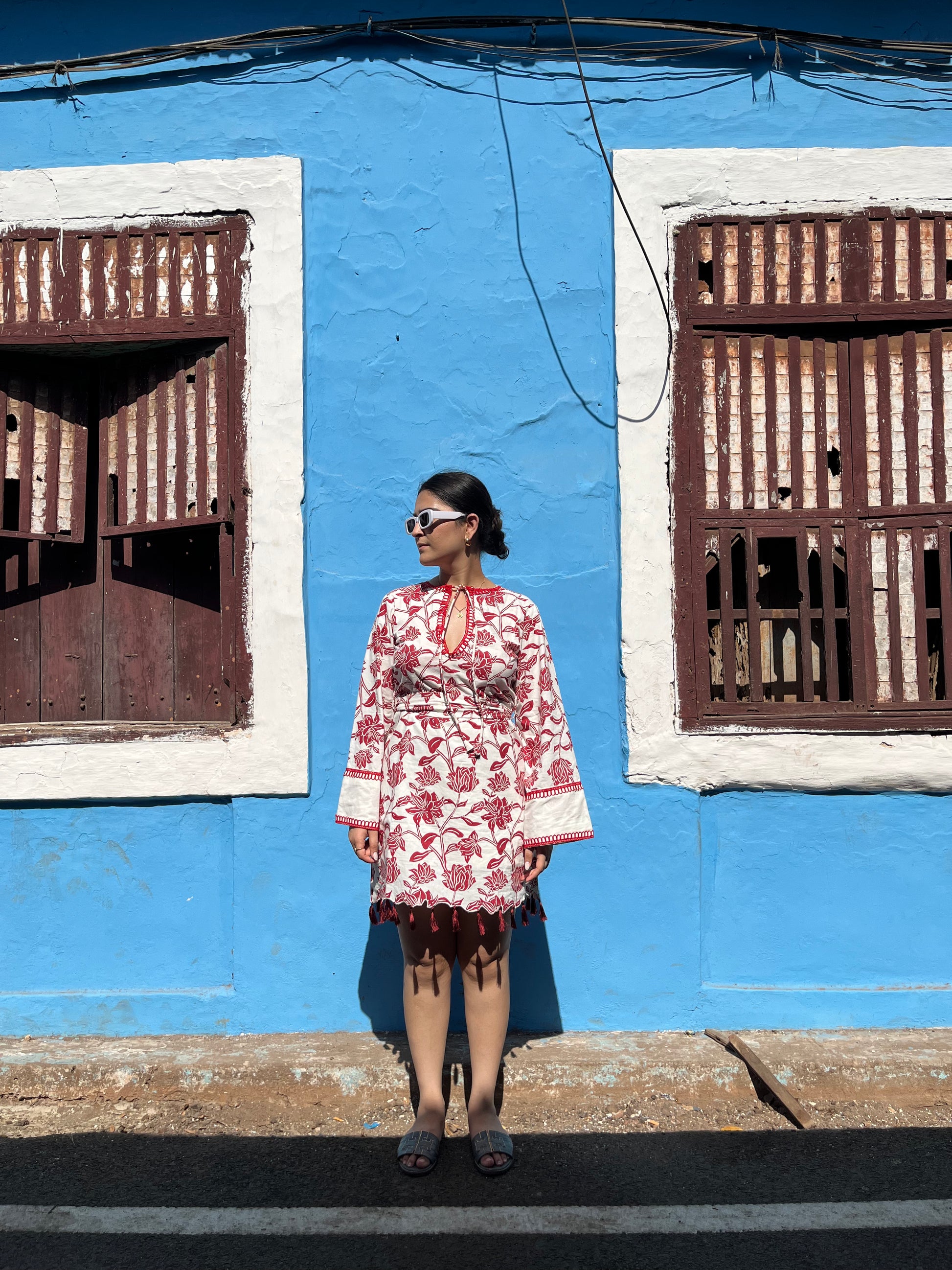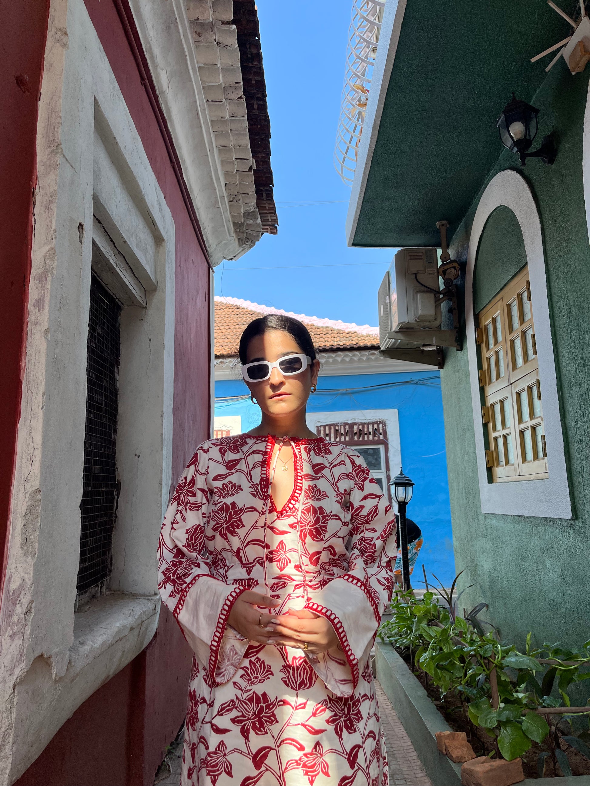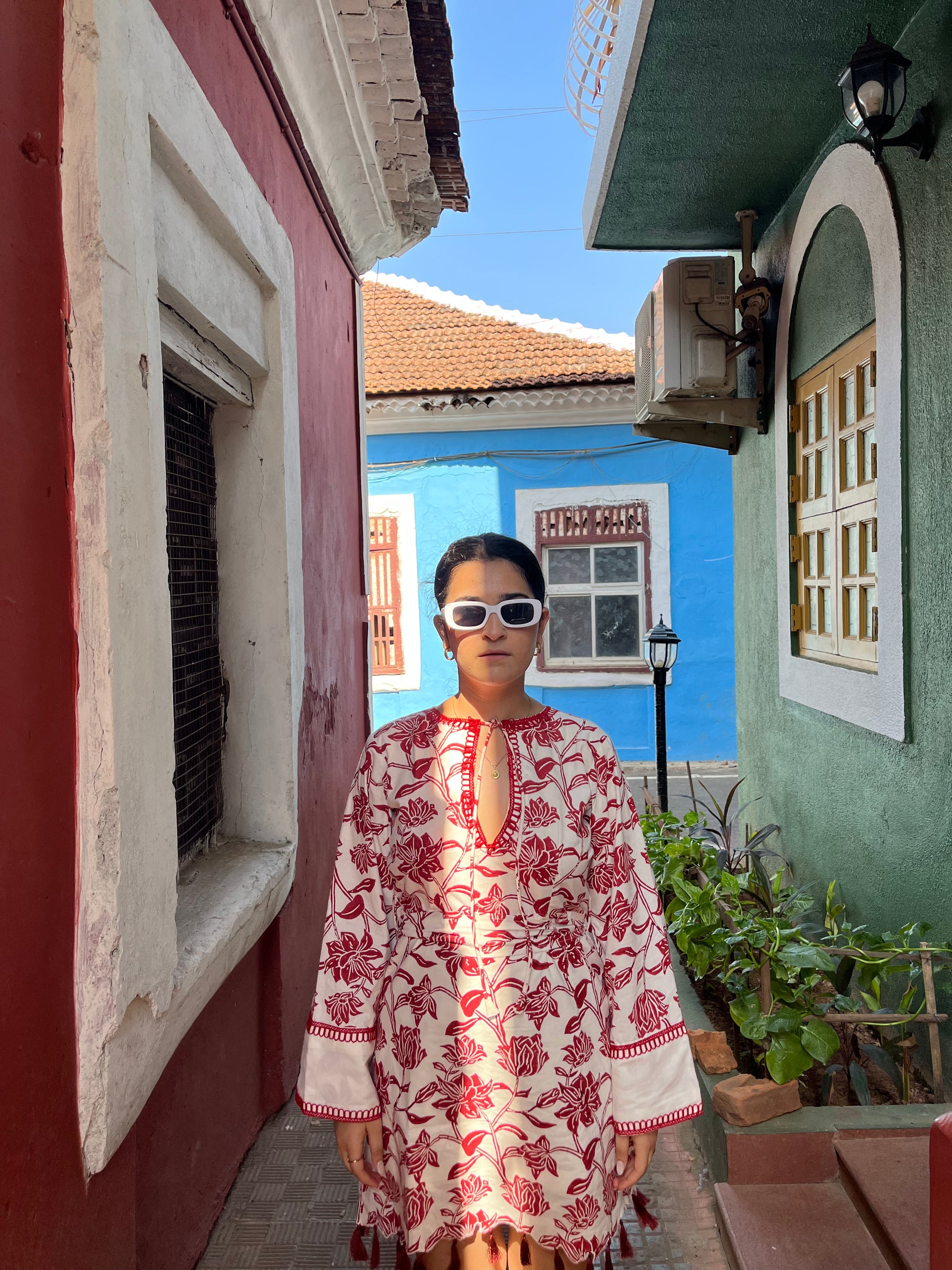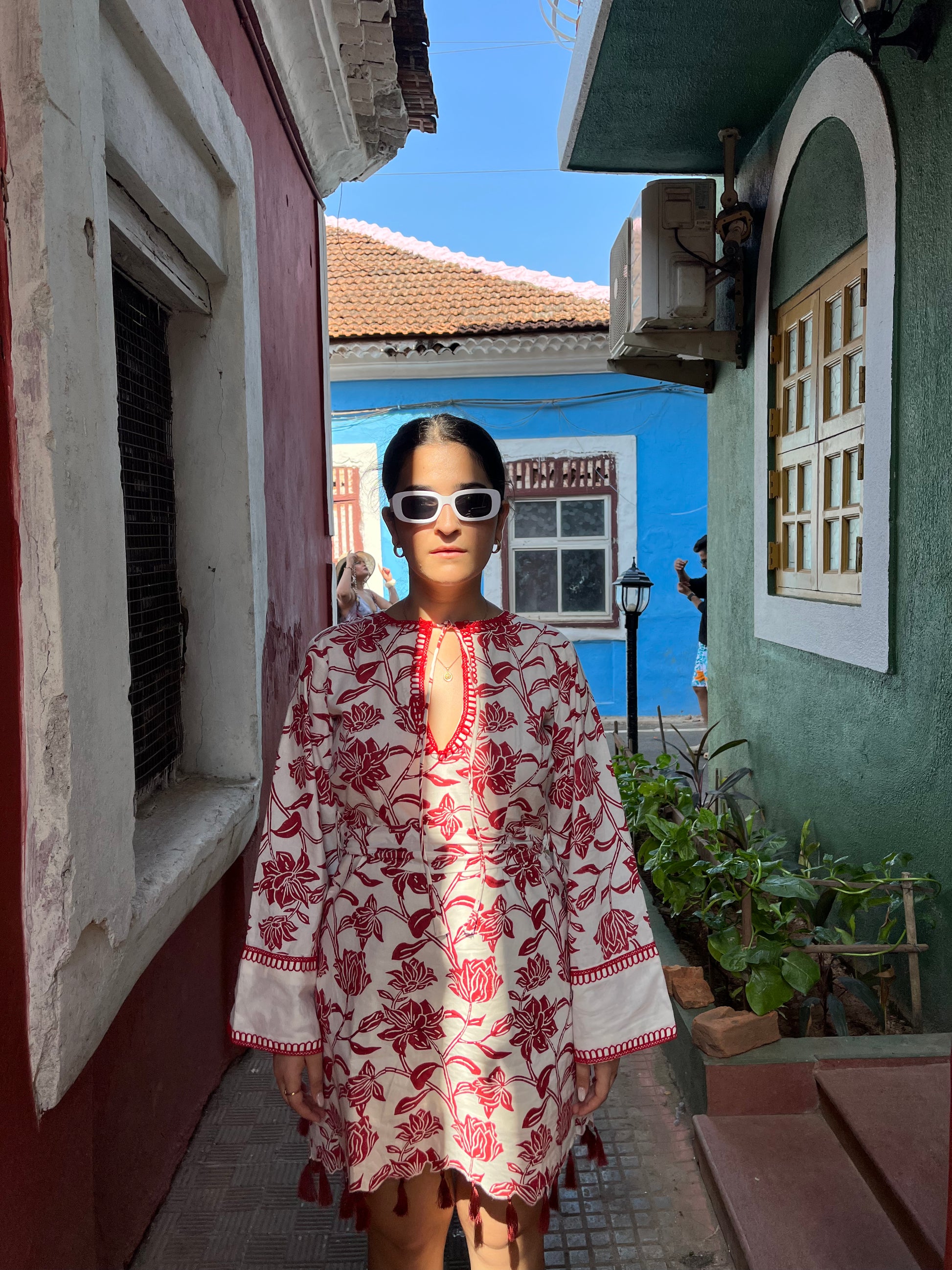 Immerse yourself in the carefree spirit of summer with our stunning bohemian white dress adorned with a vibrant red floral print. This dress captures the essence of boho-chic fashion, combining free-spirited charm with timeless elegance. The dress features lace detailing at the sleeves & neckline. The hem of the dress is crafted with machine embroidery & hand made tassels.