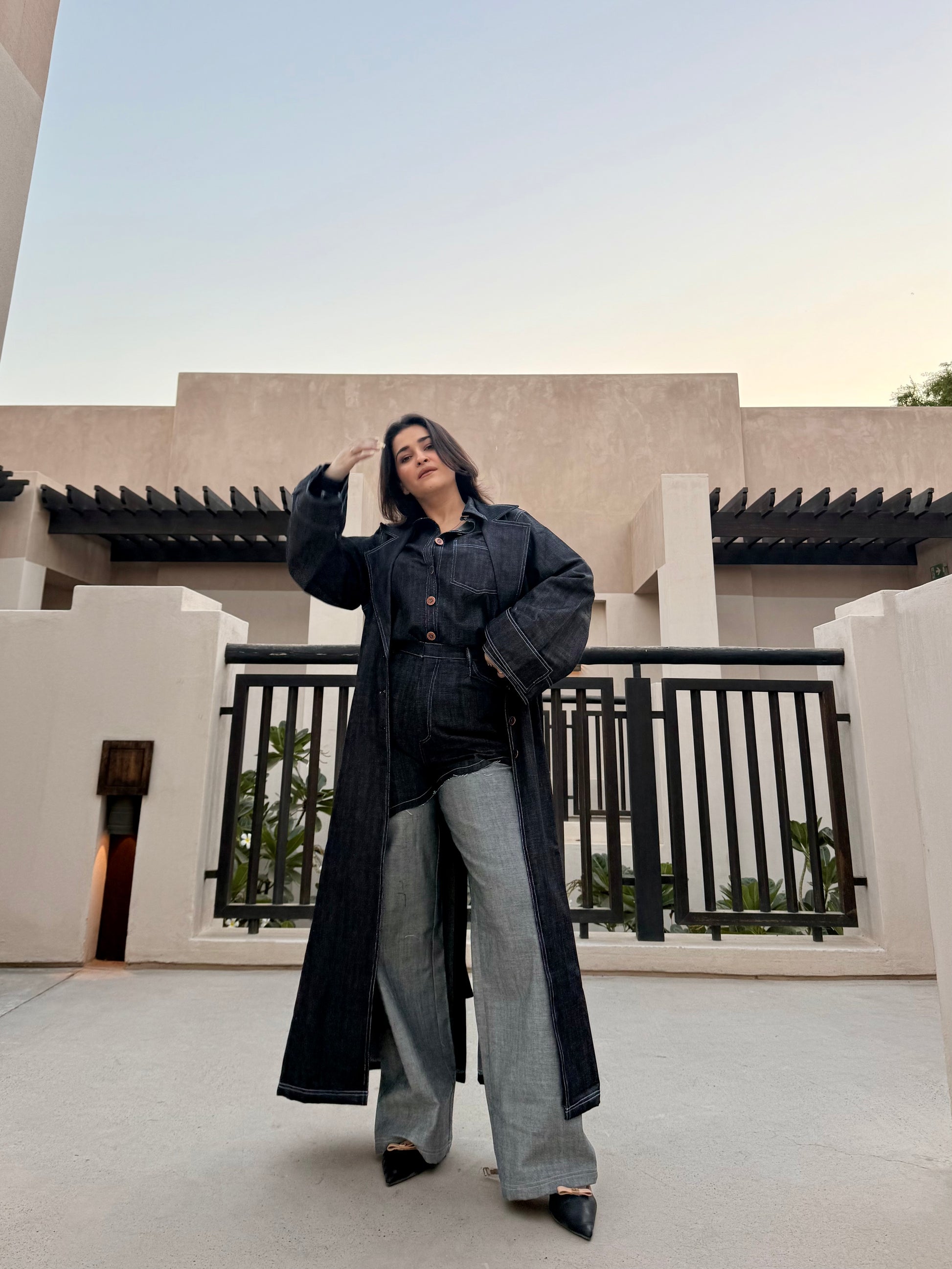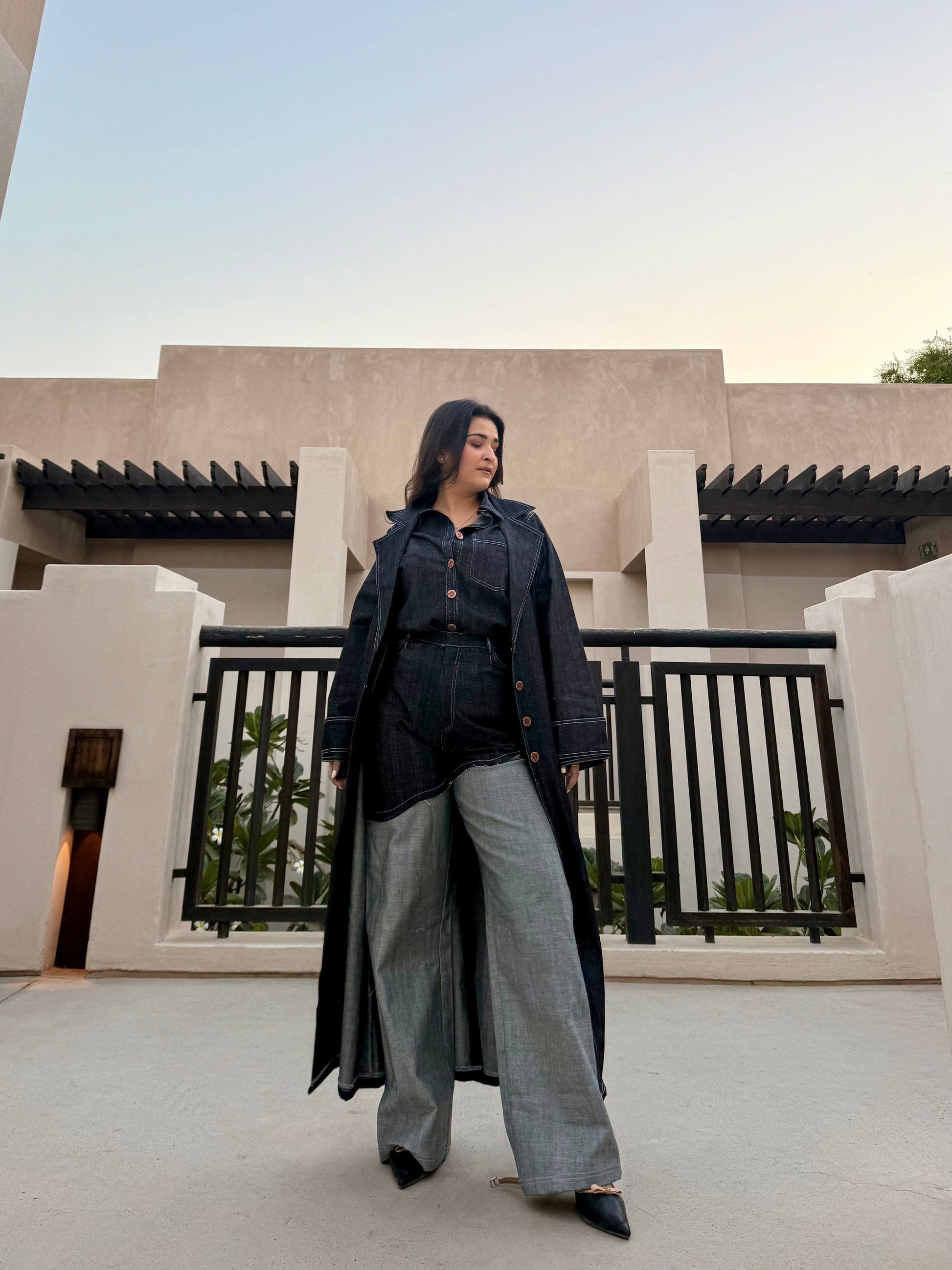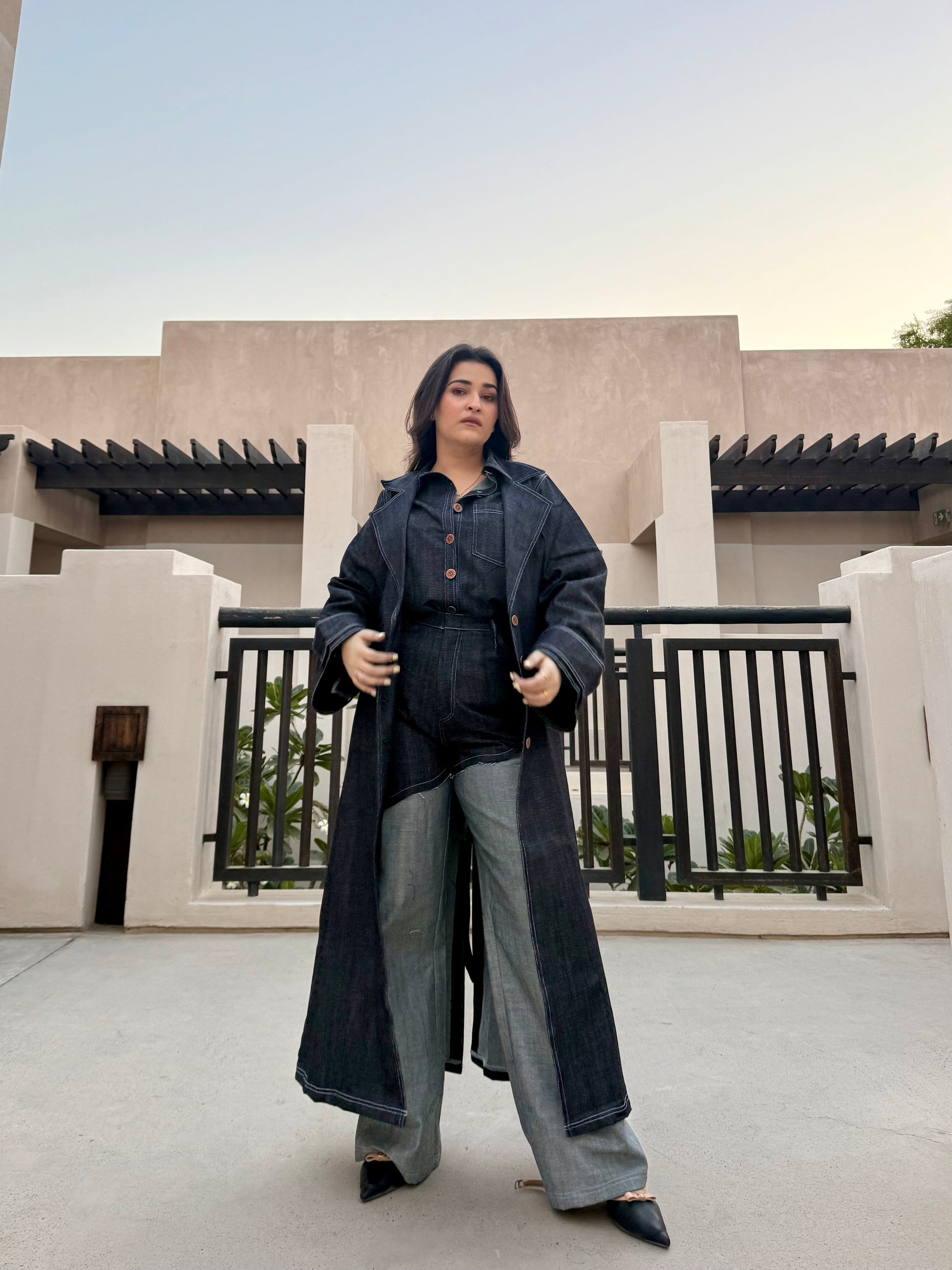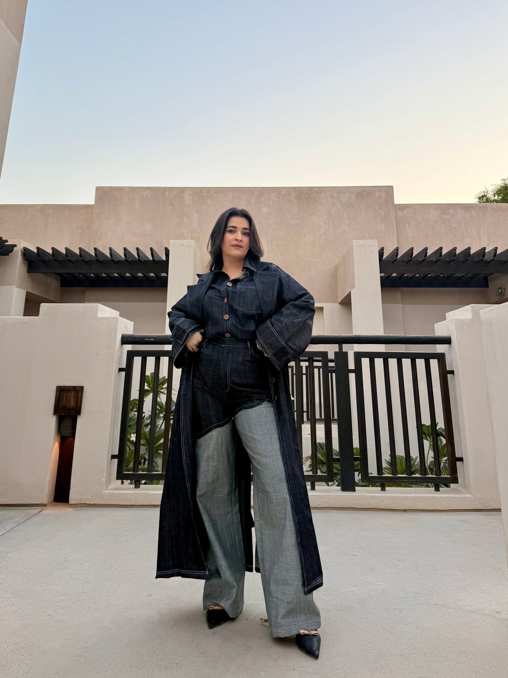 Denim lovers, meet your ultimate overload. This set pairs a crisp shirt with the statement trench coat (yes, the one with thread detailing and voluminous sleeves) and upside-down color-blocked wide-leg denim pants. It’s literally a denim-on-denim dream—bold, playful, and full-on main-character energy. Perfect for anyone who’s not afraid to go all in on denim drama.