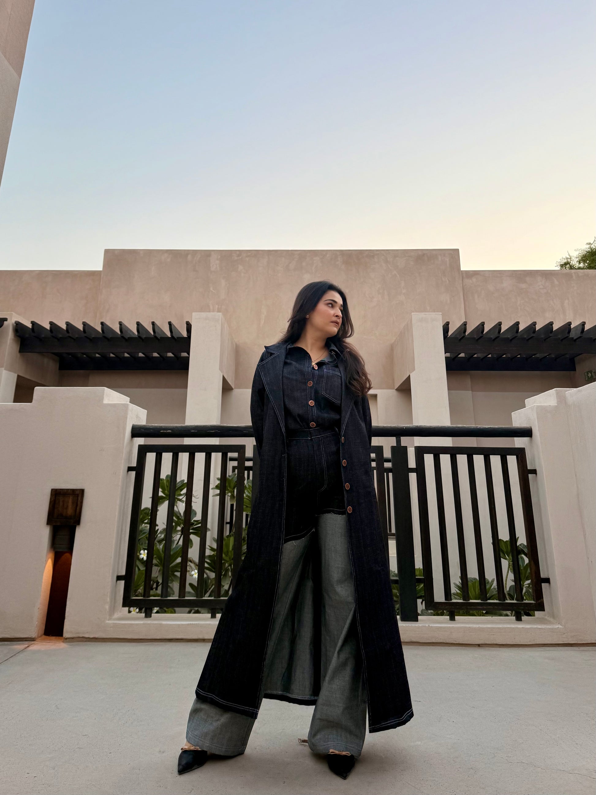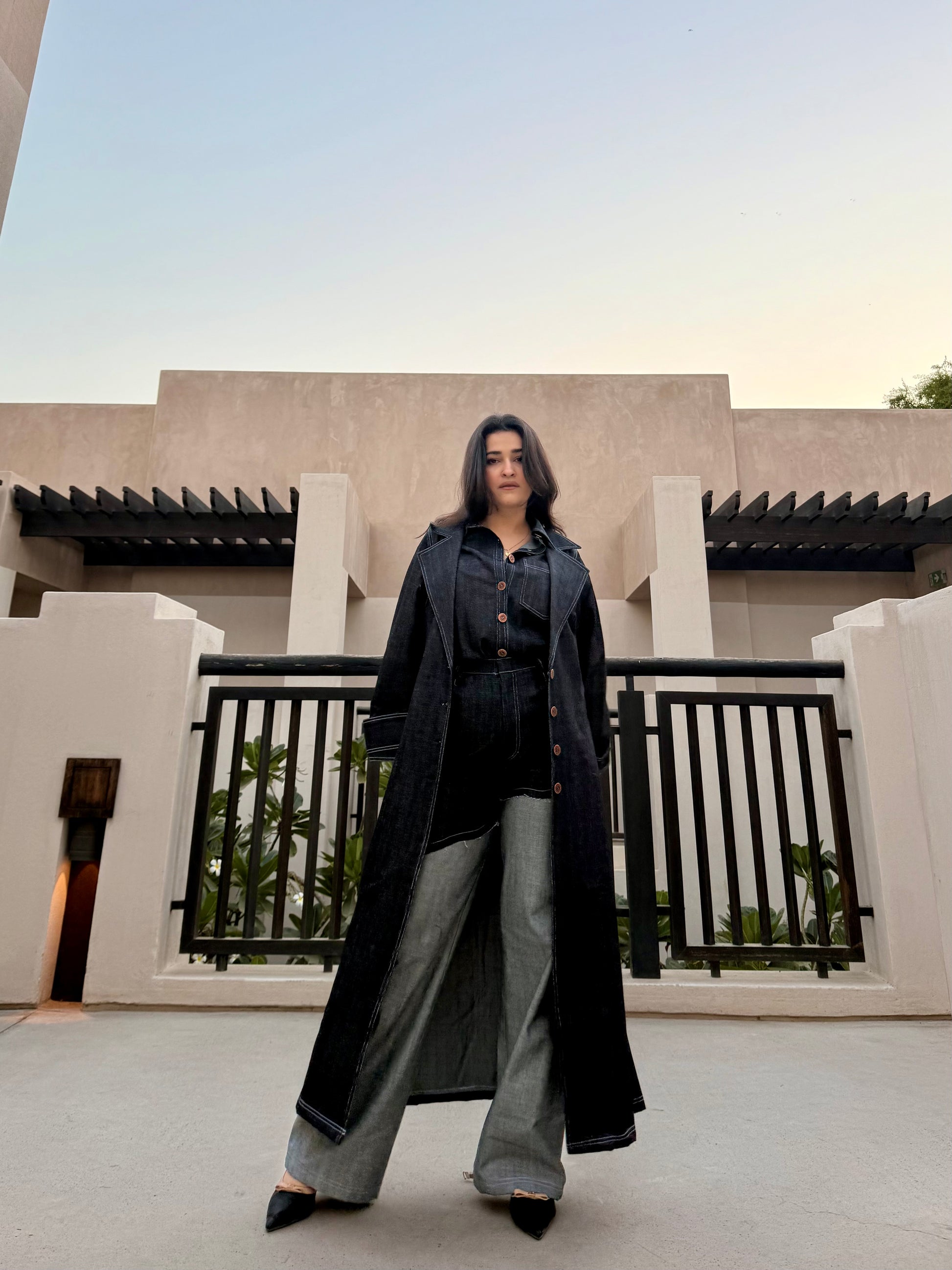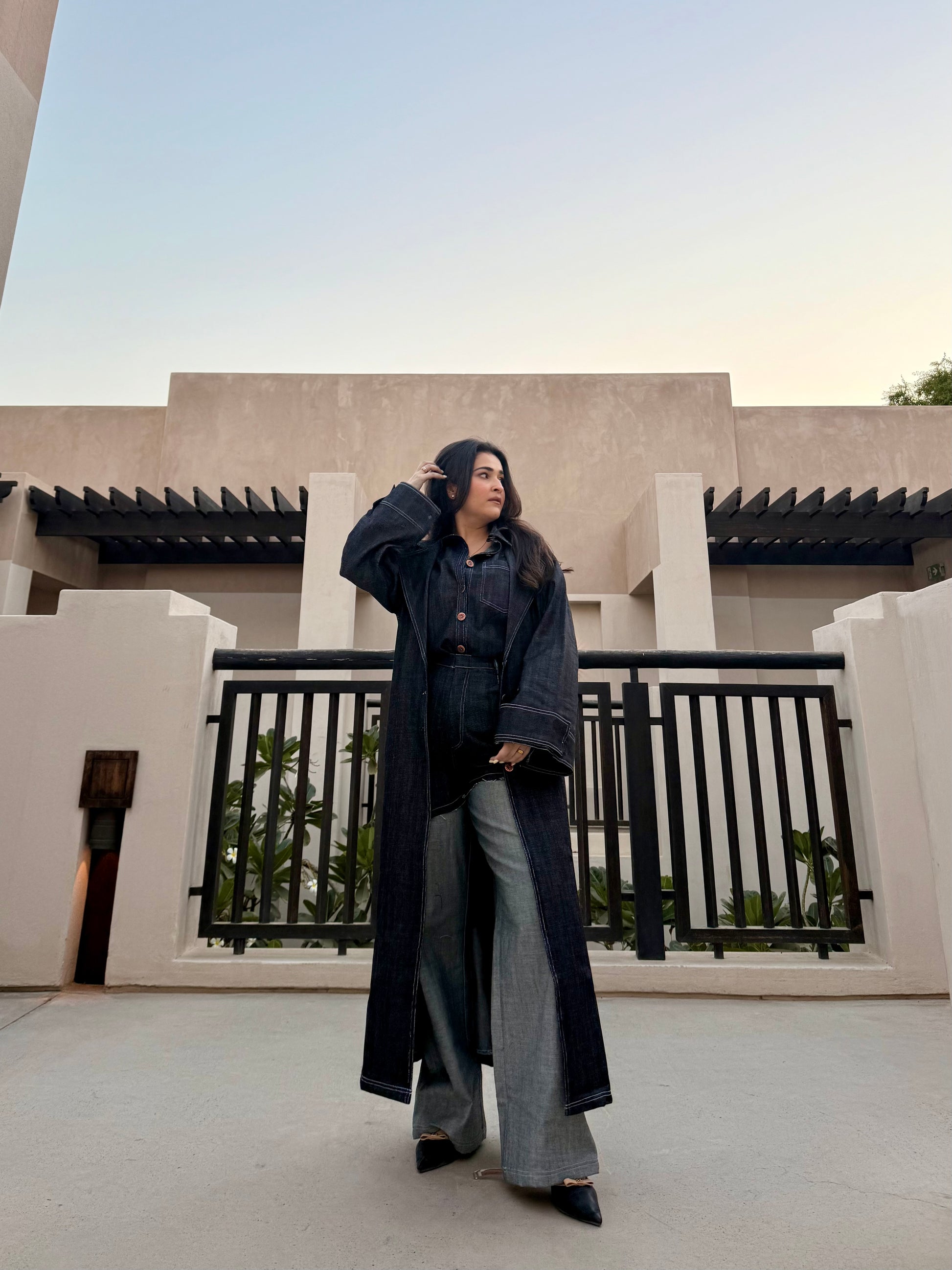 Denim lovers, meet your ultimate overload. This set pairs a crisp shirt with the statement trench coat (yes, the one with thread detailing and voluminous sleeves) and upside-down color-blocked wide-leg denim pants. It’s literally a denim-on-denim dream—bold, playful, and full-on main-character energy. Perfect for anyone who’s not afraid to go all in on denim drama.