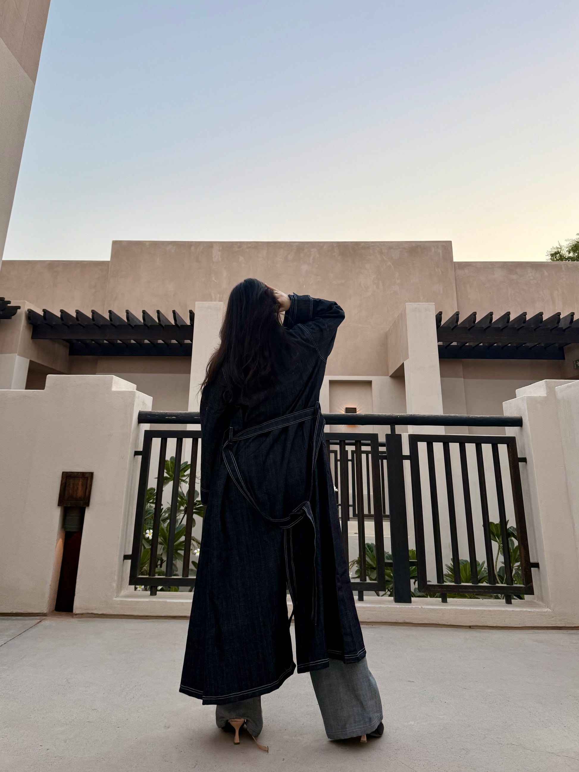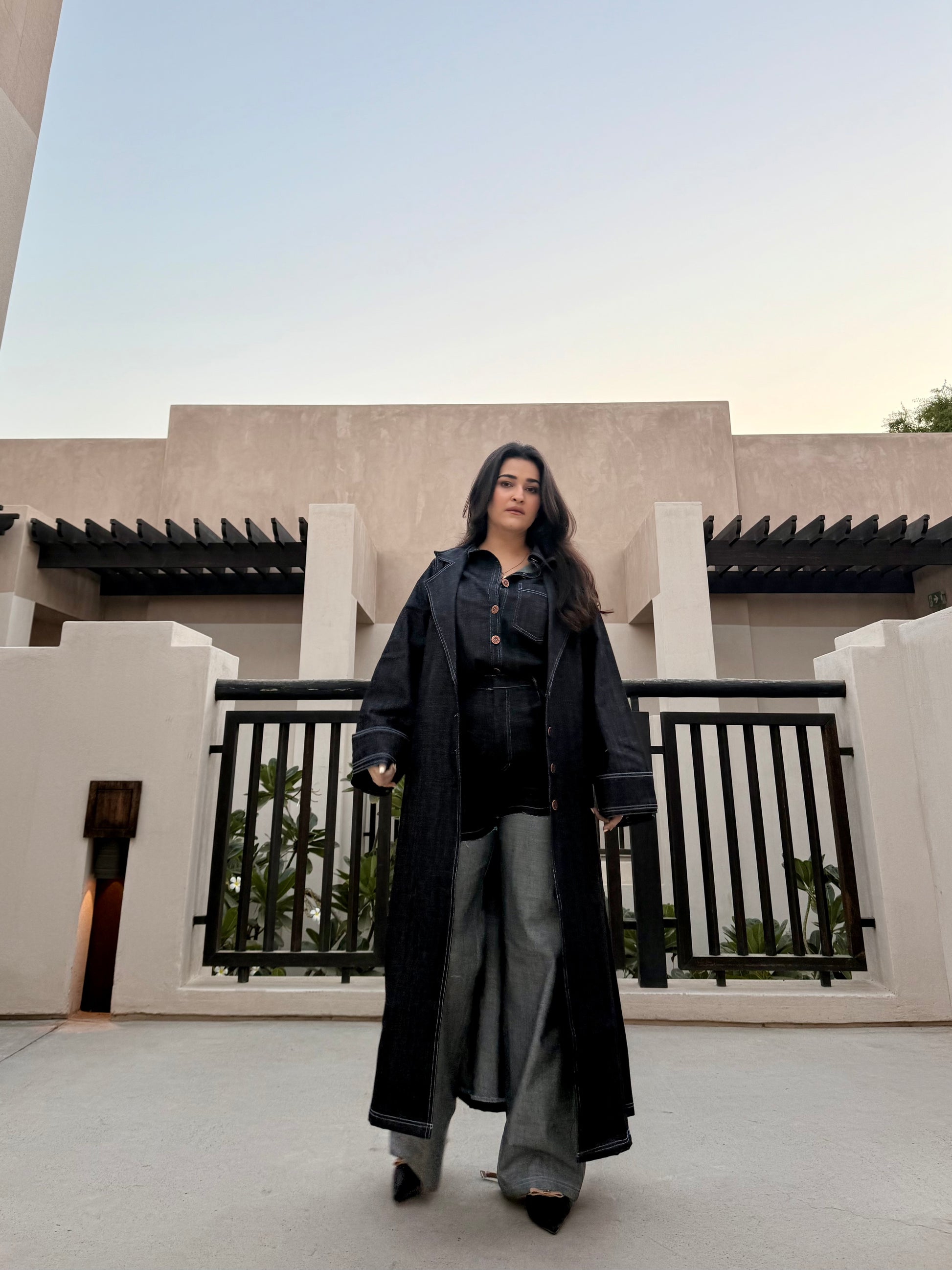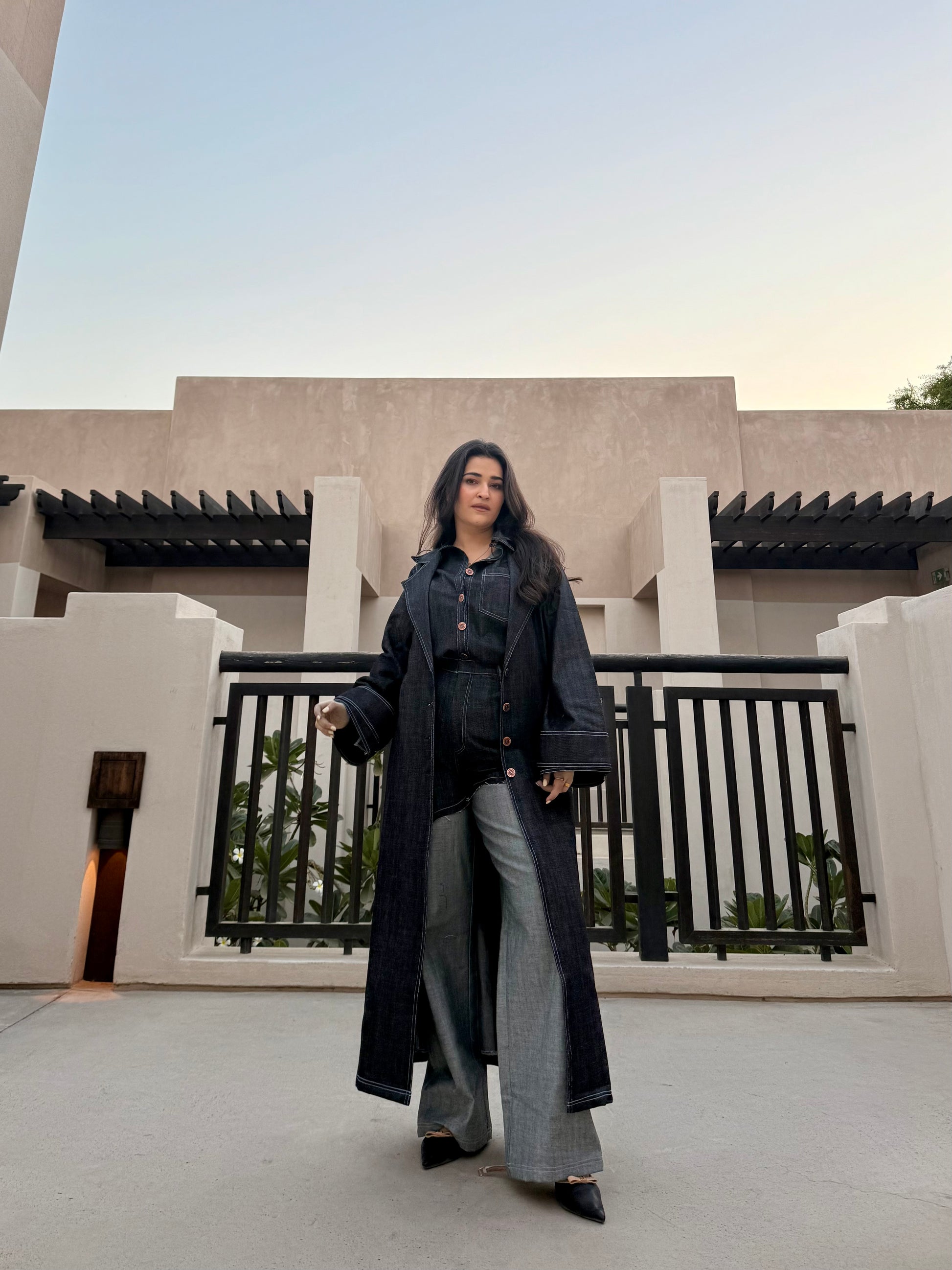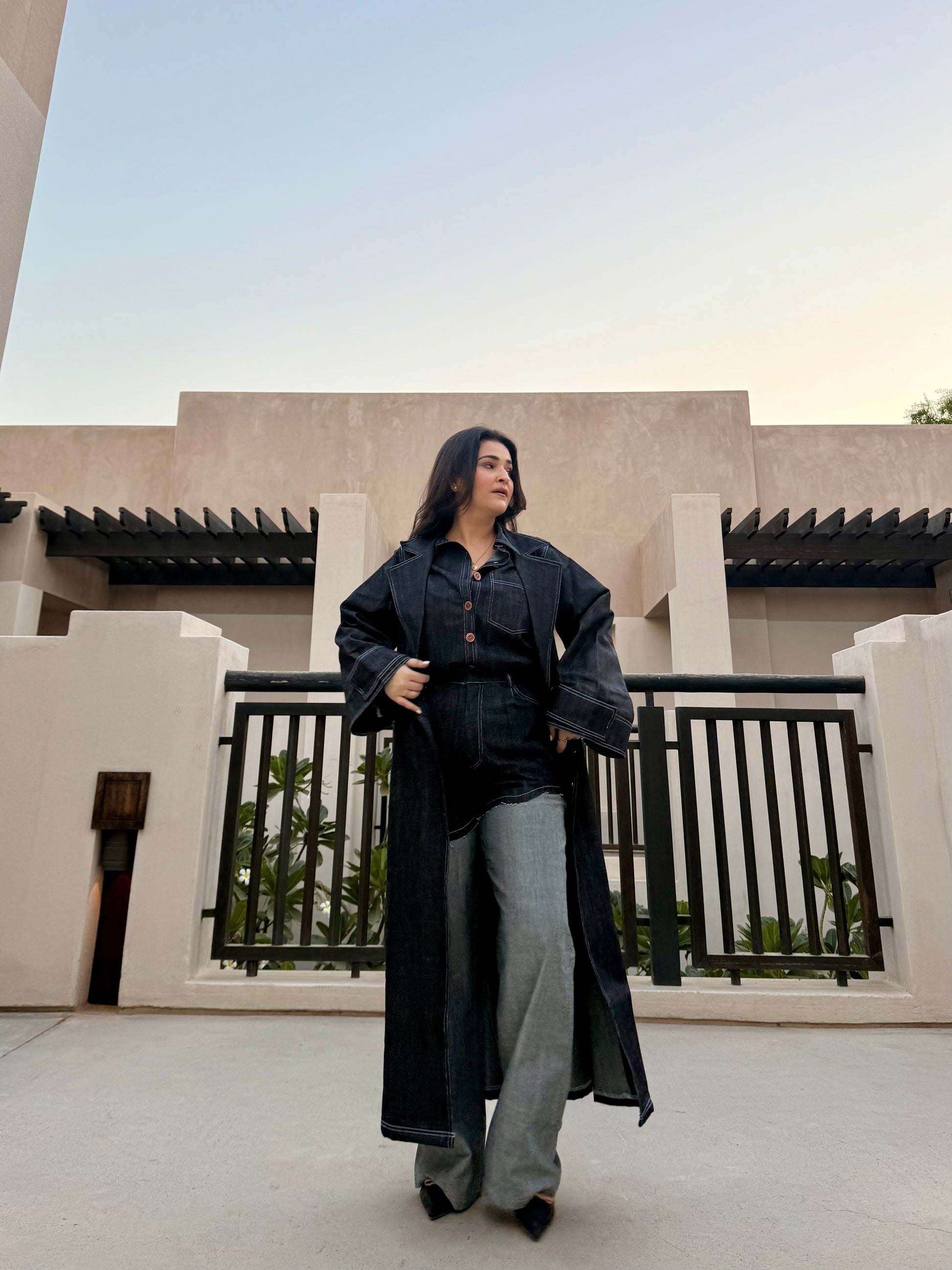 Denim lovers, meet your ultimate overload. This set pairs a crisp shirt with the statement trench coat (yes, the one with thread detailing and voluminous sleeves) and upside-down color-blocked wide-leg denim pants. It’s literally a denim-on-denim dream—bold, playful, and full-on main-character energy. Perfect for anyone who’s not afraid to go all in on denim drama.