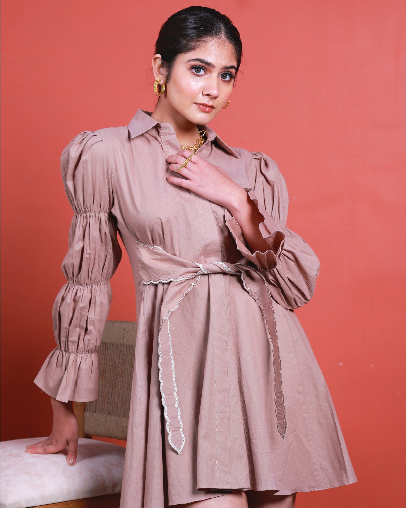 Short dress with a collar and our signature tiered balloon sleeves .Tied embroidered belt in matching fabric. Fastens at the  front with covered buttons.