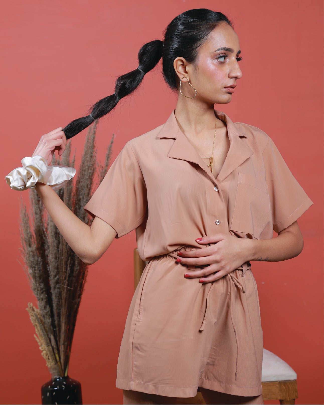 Collared short sleeves shirt. Asymmetric hem. Button up front.