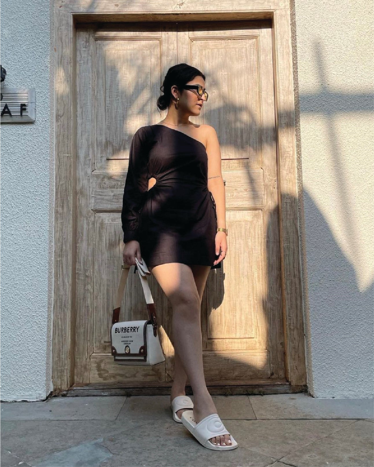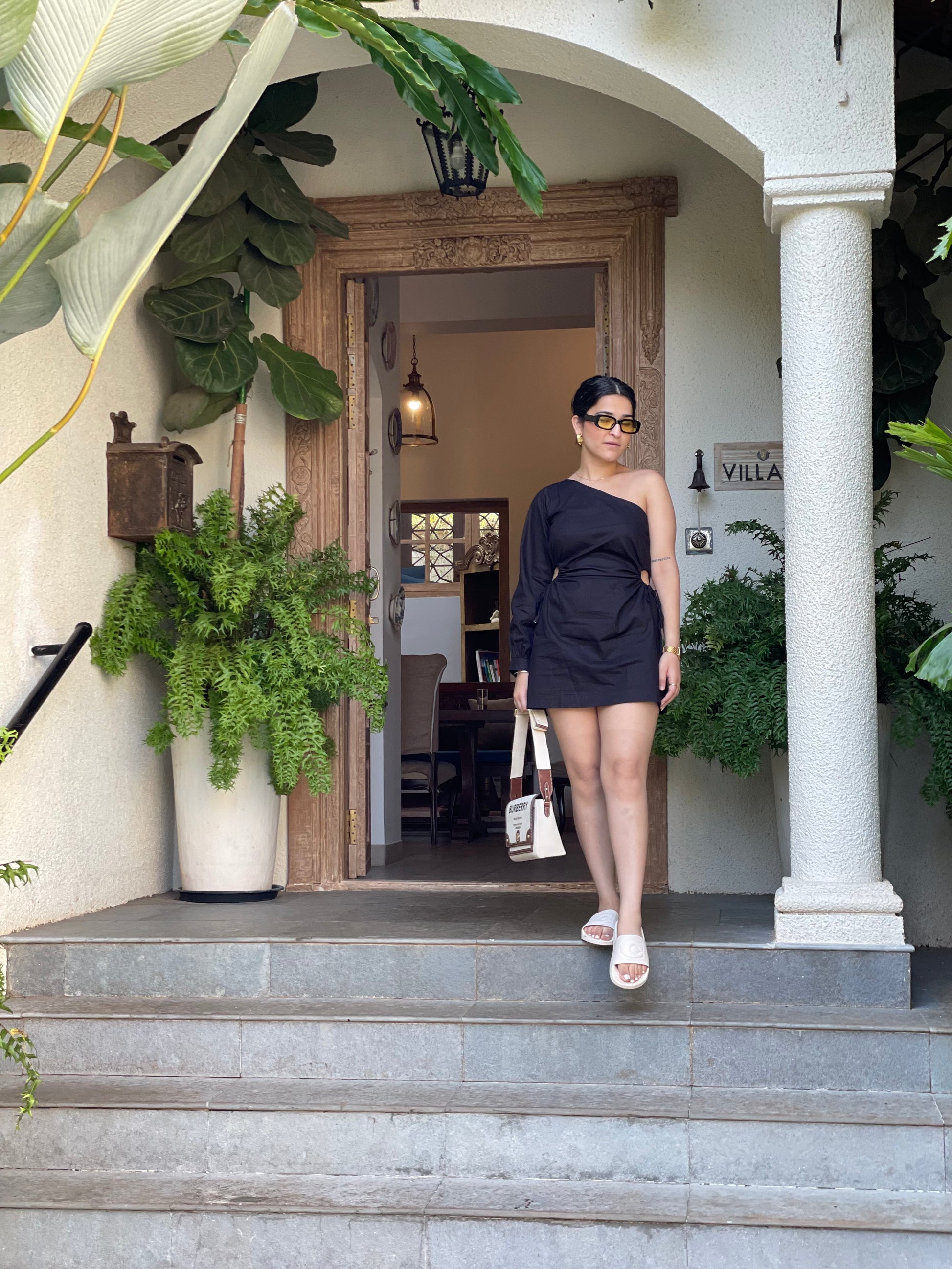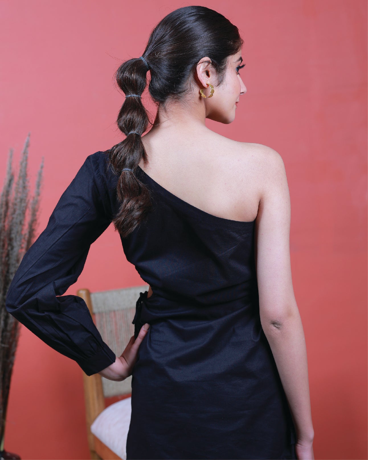 Short dress featuring off shoulder sleeves and vents at the waist with drawstring detail.