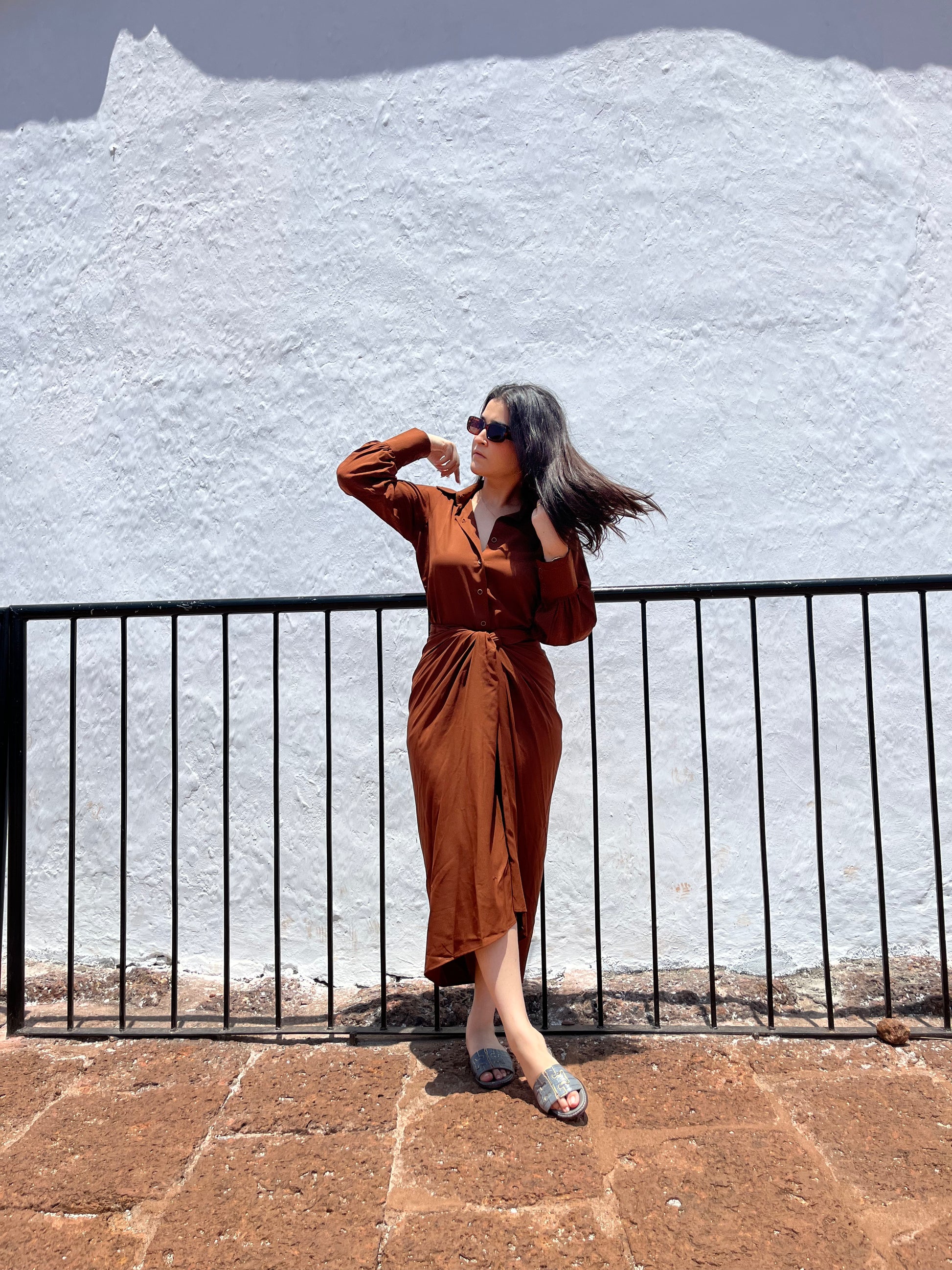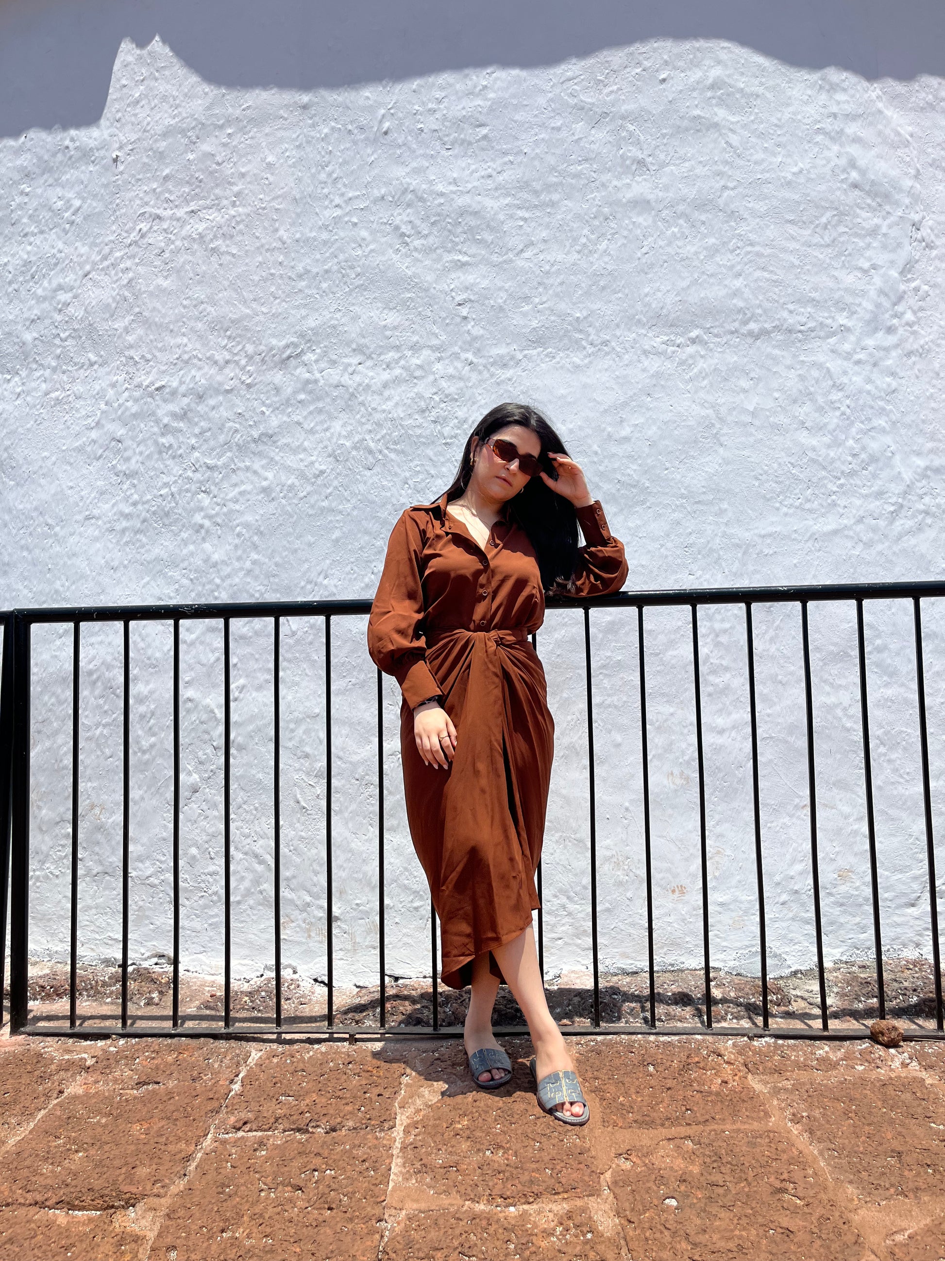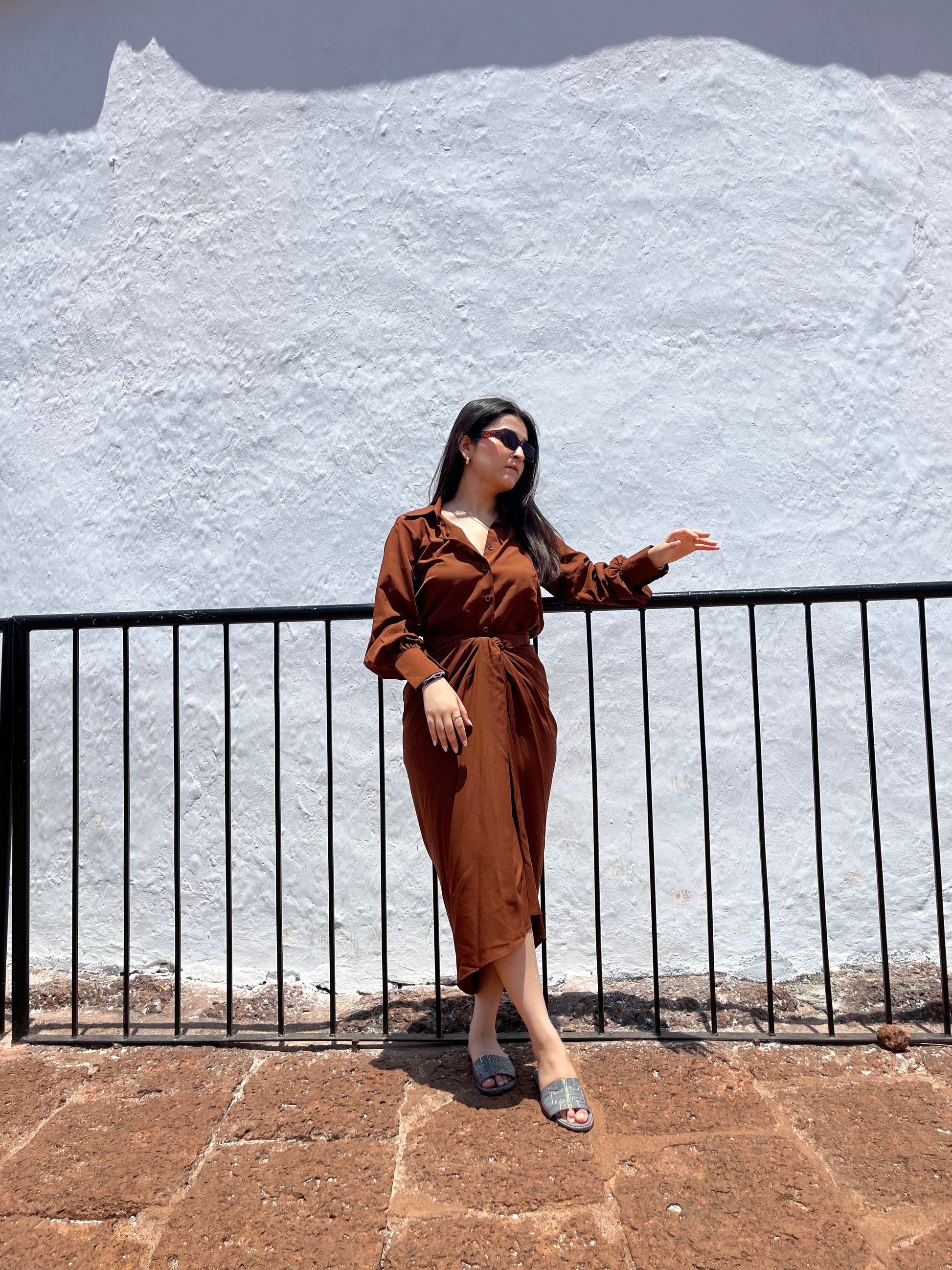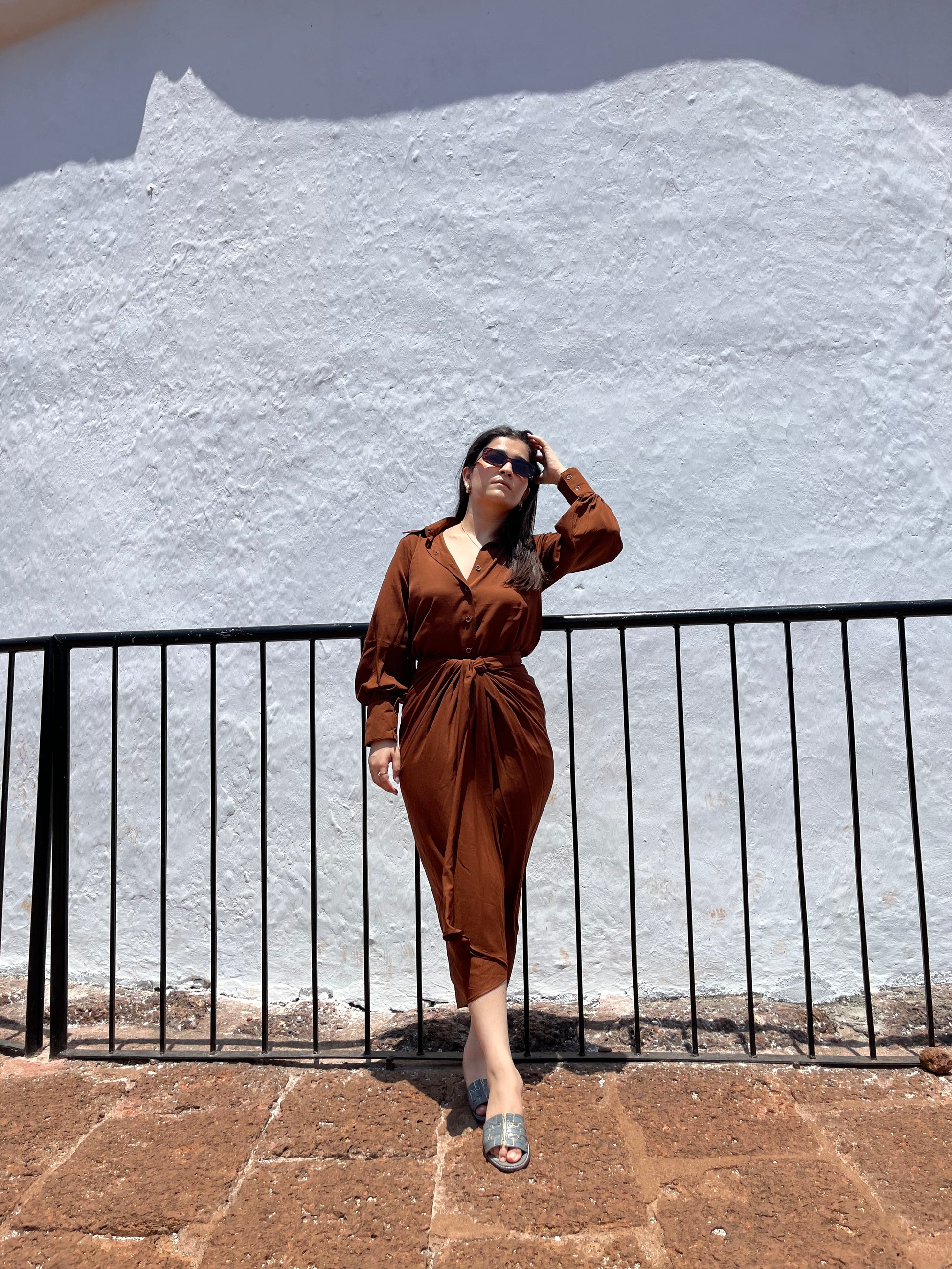 The solid brown color exudes warmth and classic charm, allowing you to transition seamlessly from daytime to evening events. The shirt offers a polished, yet relaxed look, while the drape skirt adds an element of grace and movement, enhancing your every step.