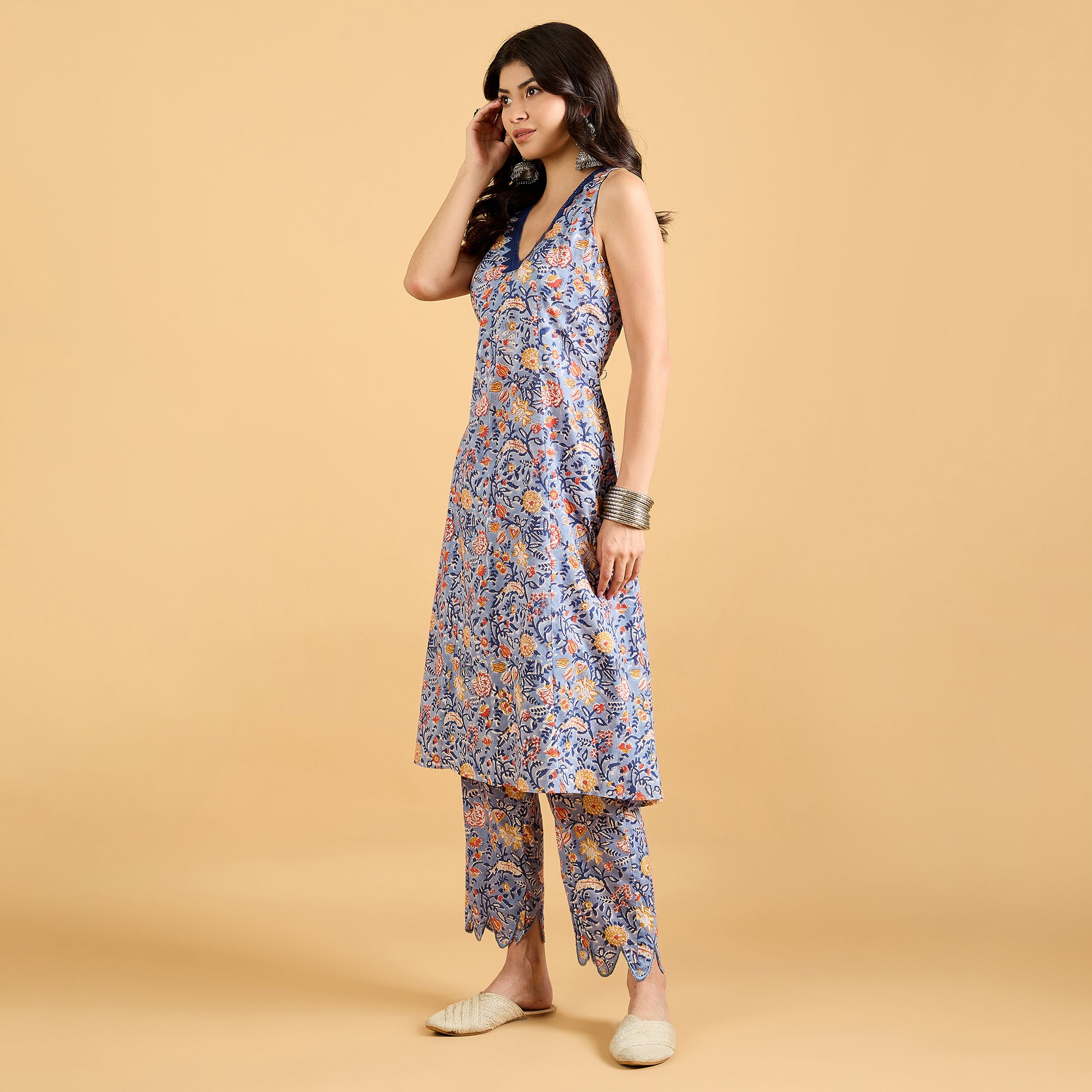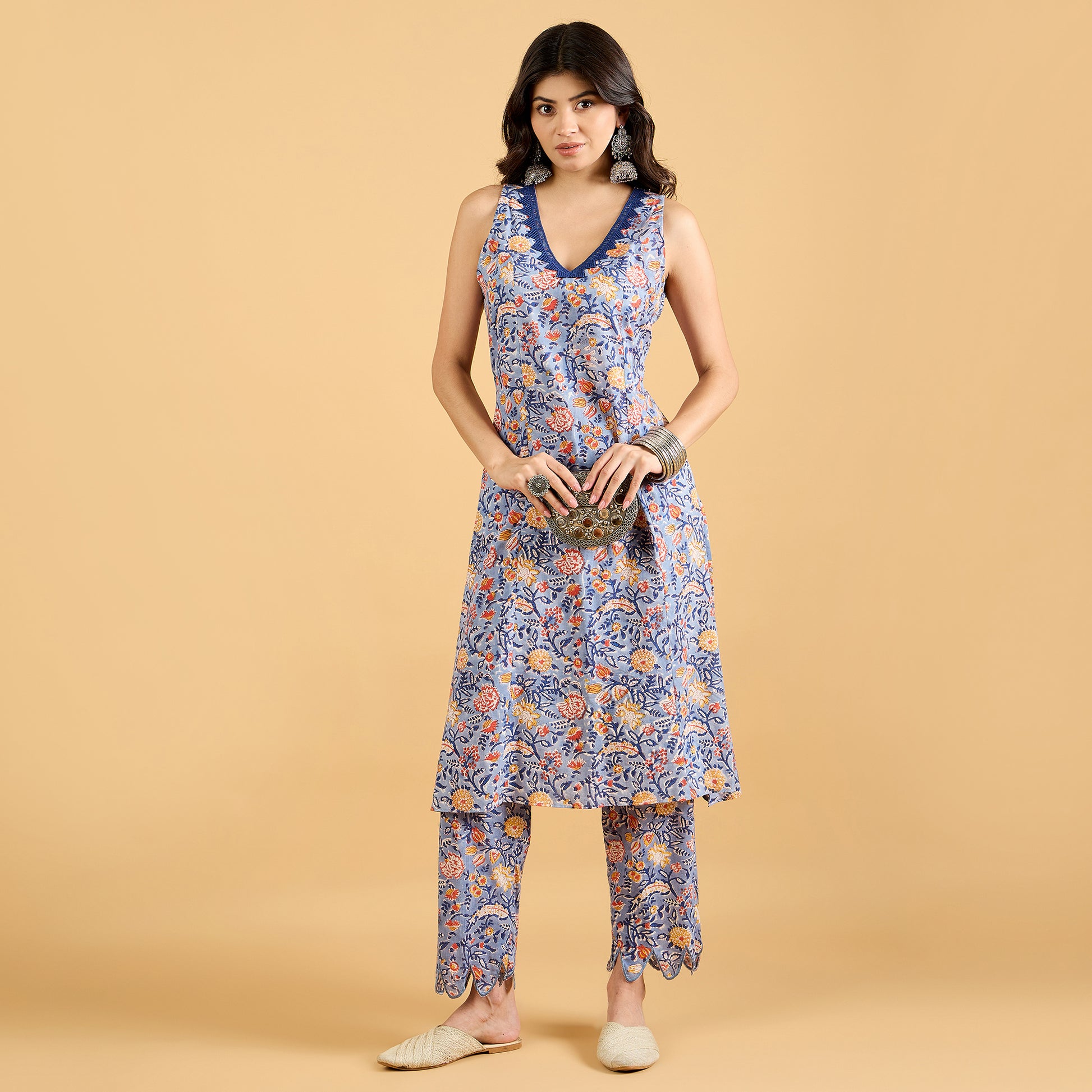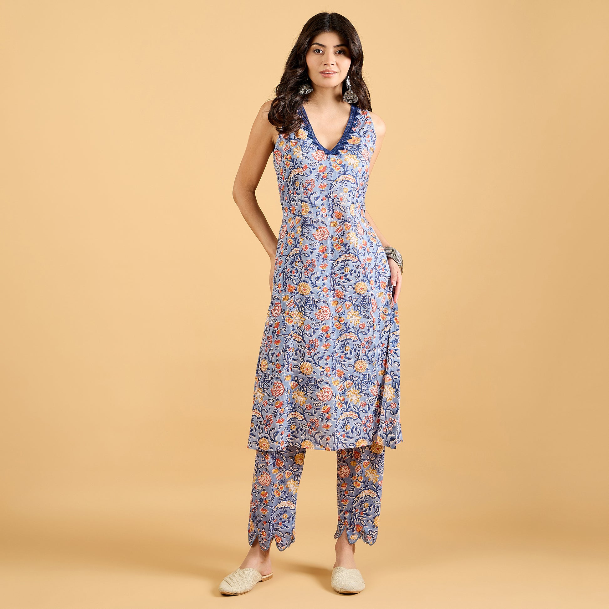 Say hello to easy elegance with this hand block printed suit set – perfect for those days when you want to look effortlessly put-together. The kurta comes with pretty lace detailing at the neck that adds a soft, feminine touch, while the embroidered scalloped pants bring in just the right amount of drama. Comfy, breathable, and super stylish – this one’s a go-to for brunches, coffee dates, or just feeling fancy on a regular day.