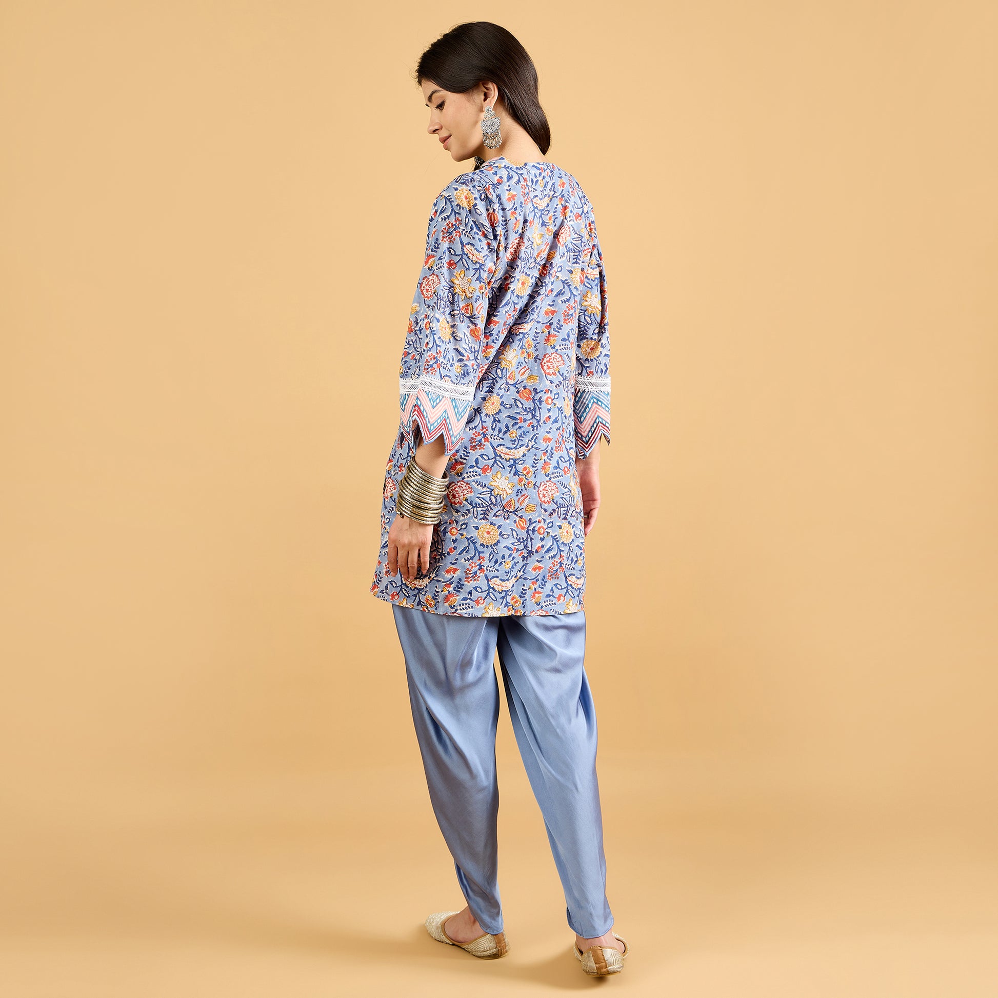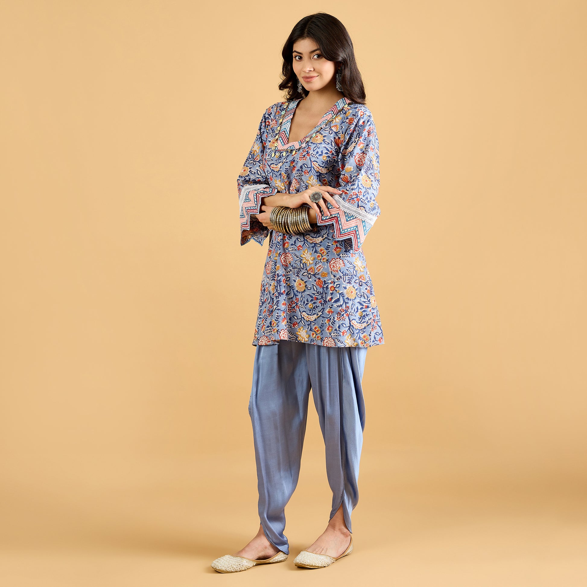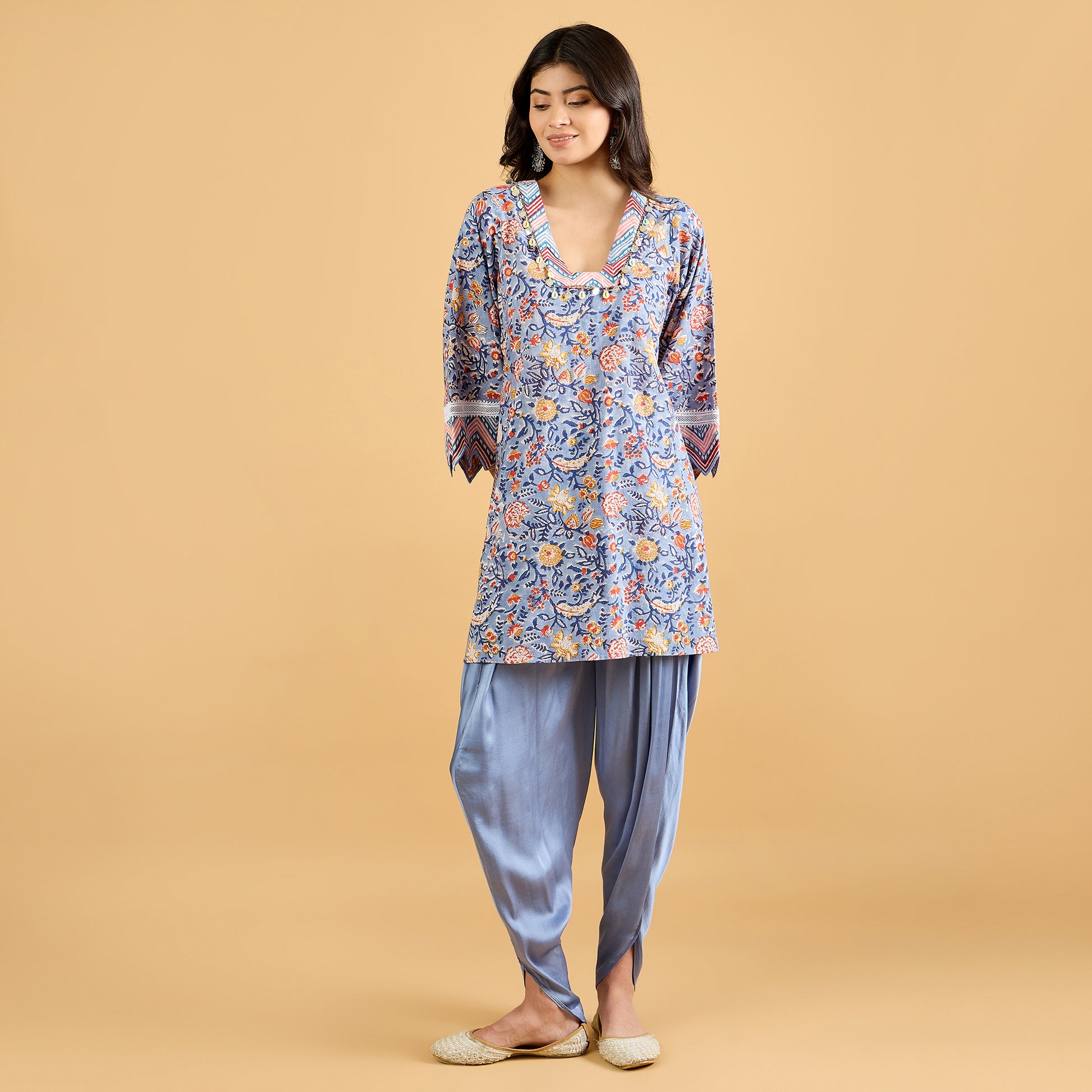 Give your ethnic wardrobe a fun twist with this dhoti suit set – a perfect blend of tradition and trend. The kurta is crafted in soft hand block printed cotton, finished with delicate lace detailing at the neckline and sleeves along with cut work embroidery detailing at the sleeves hem for that extra feminine touch. Paired with a flowy modal satin dhoti, it brings in just the right amount of drama and comfort.