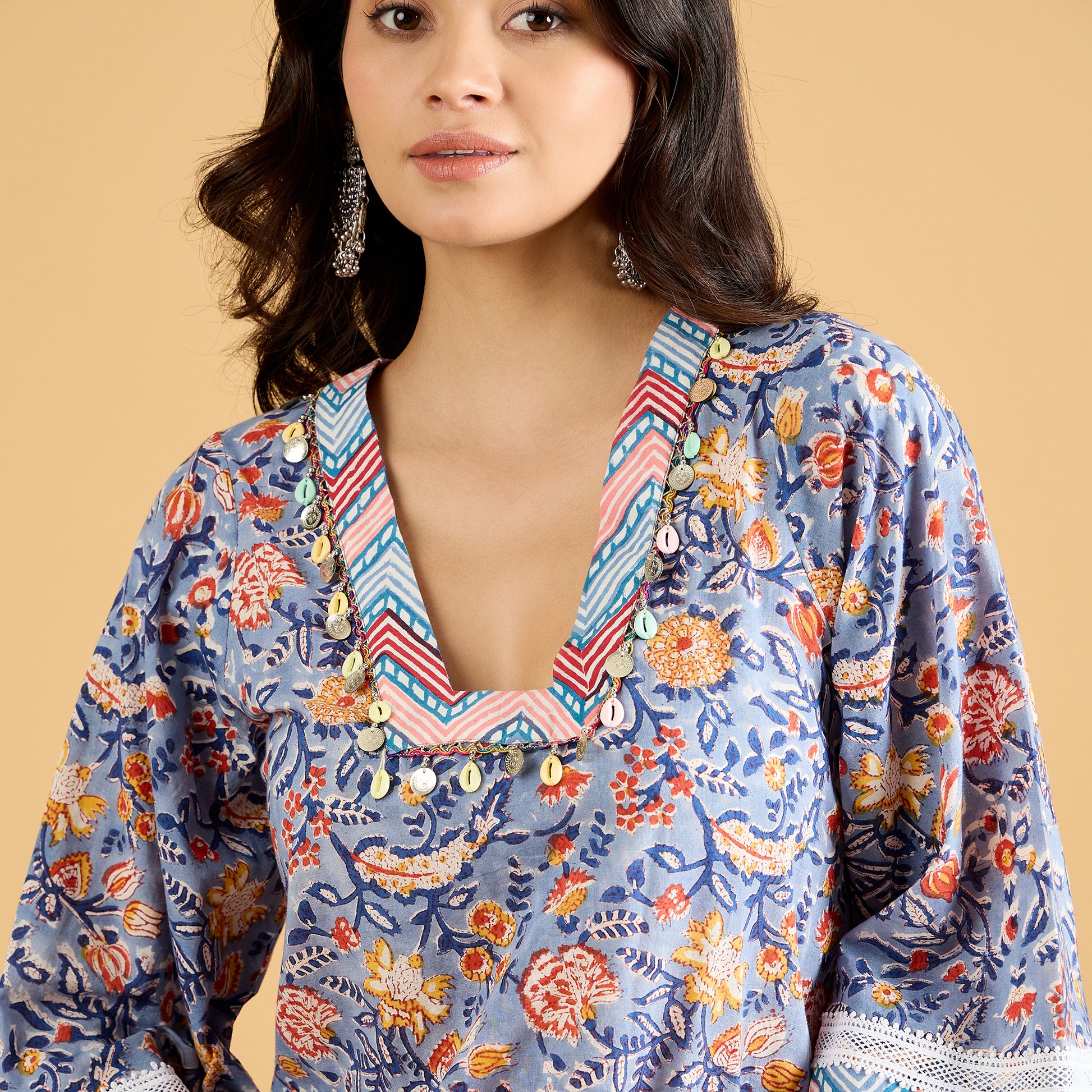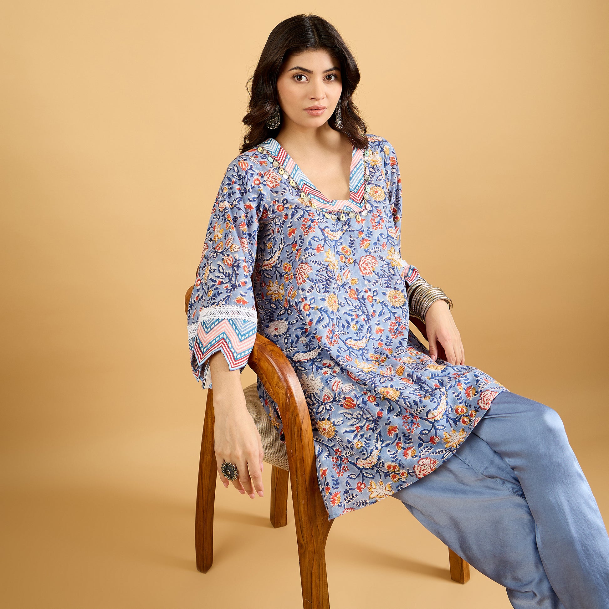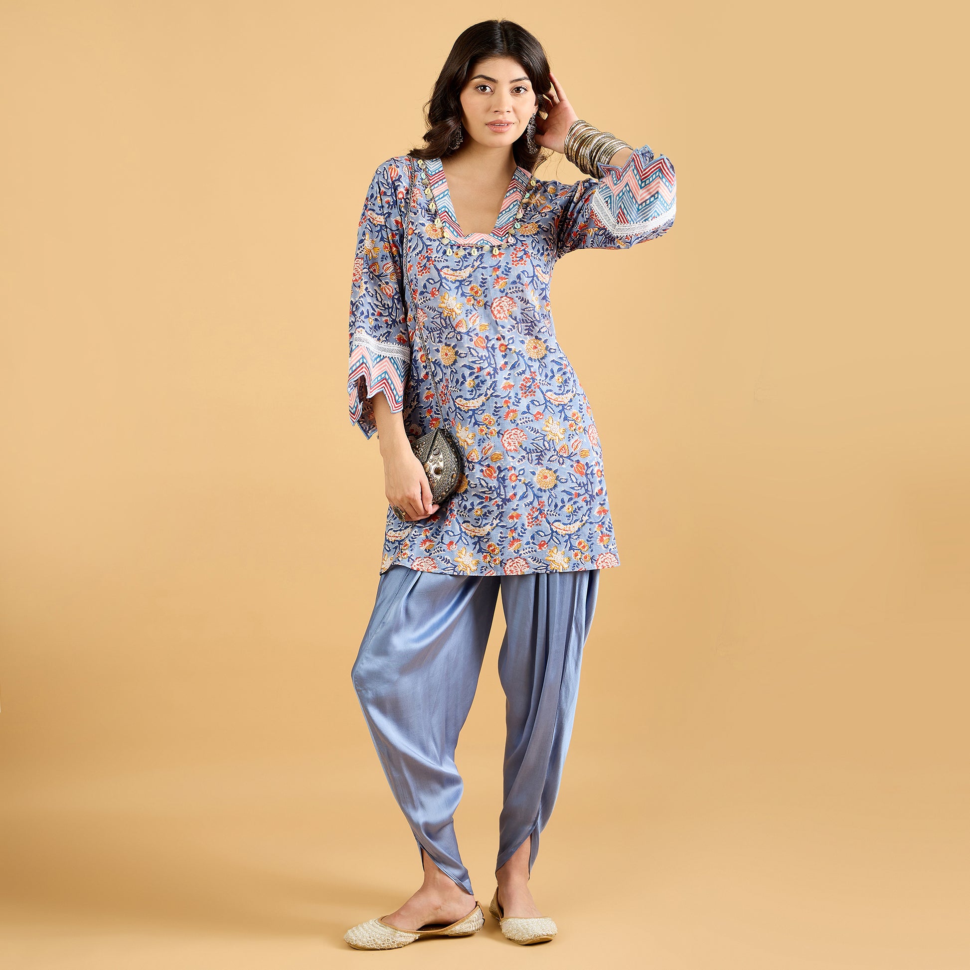 Give your ethnic wardrobe a fun twist with this dhoti suit set – a perfect blend of tradition and trend. The kurta is crafted in soft hand block printed cotton, finished with delicate lace detailing at the neckline and sleeves along with cut work embroidery detailing at the sleeves hem for that extra feminine touch. Paired with a flowy modal satin dhoti, it brings in just the right amount of drama and comfort.