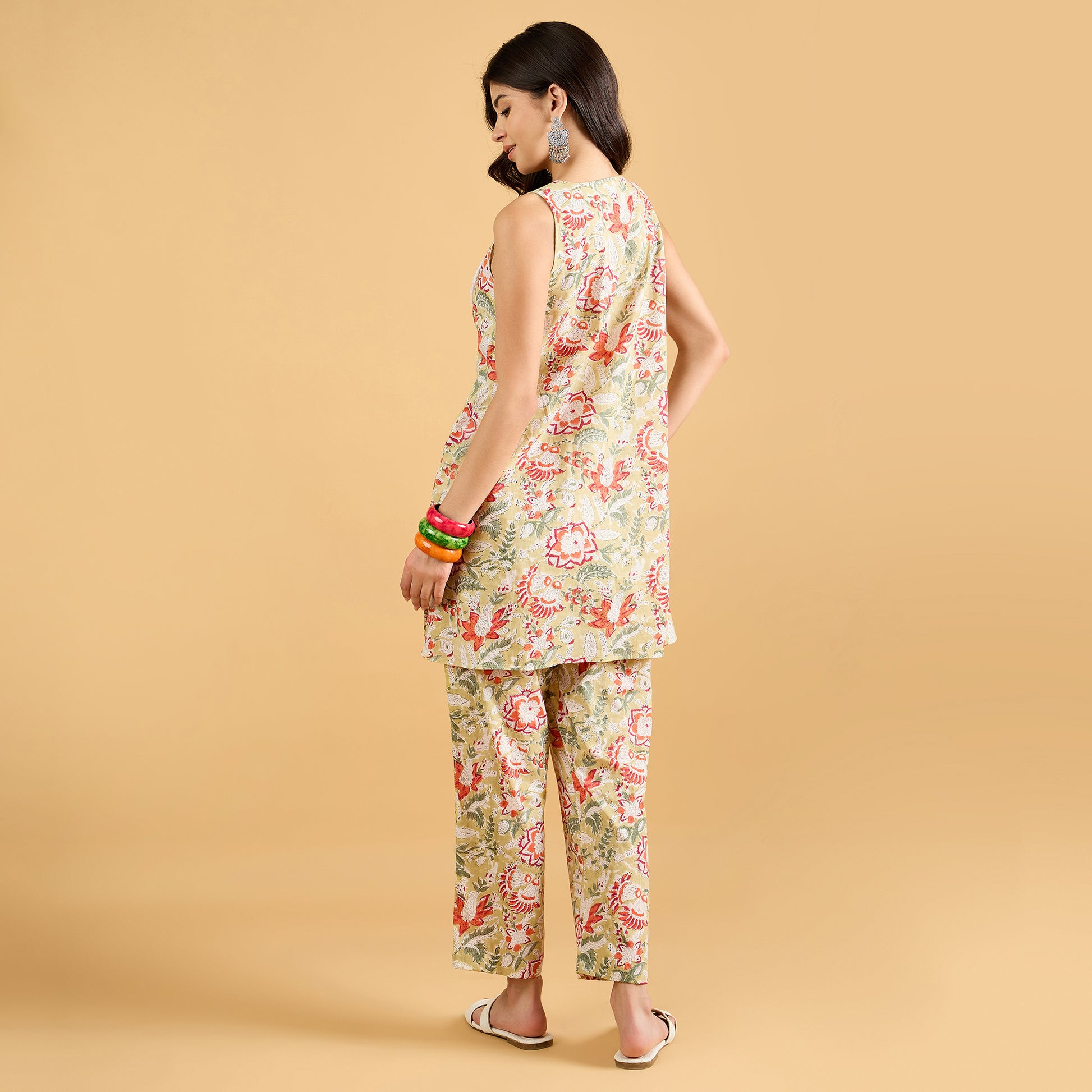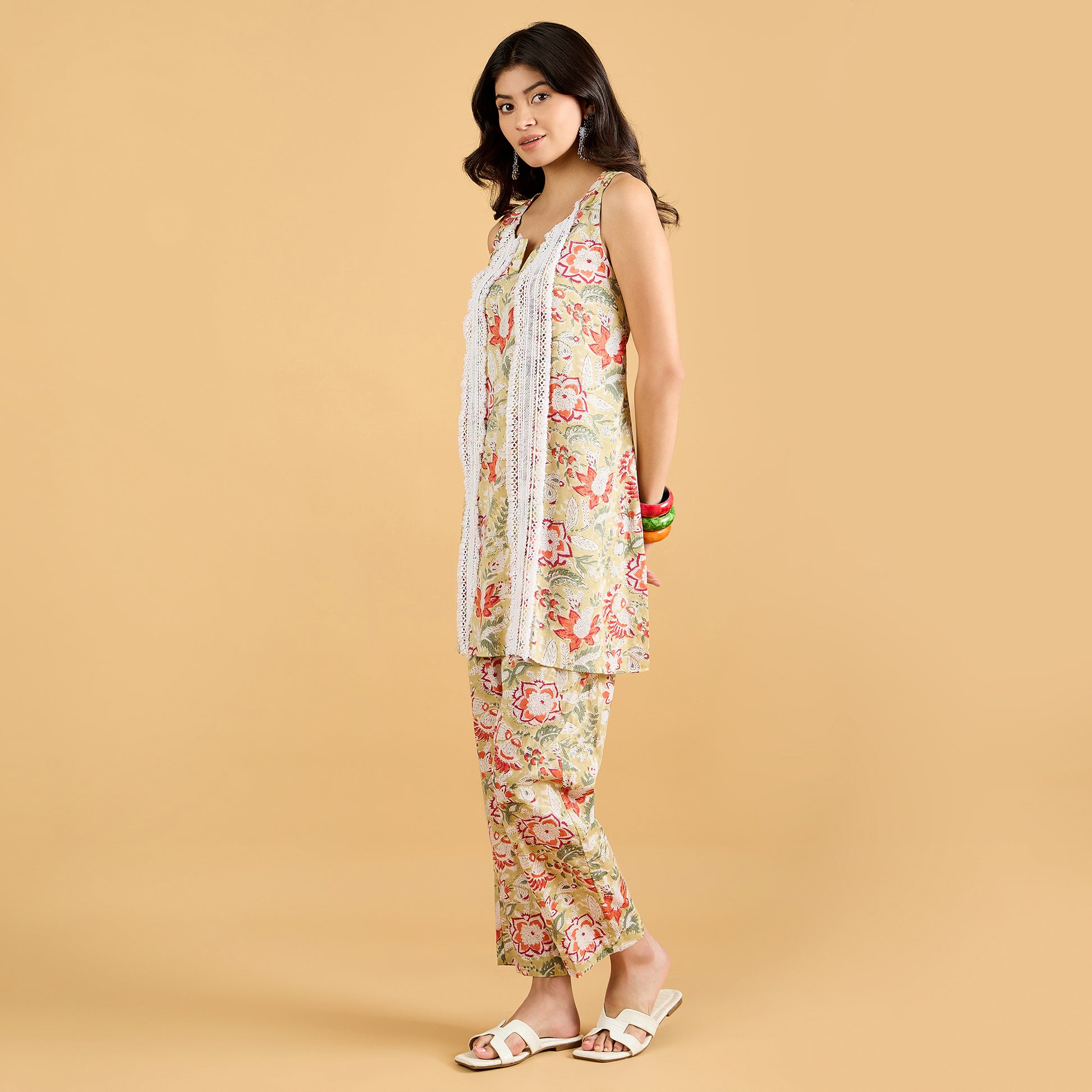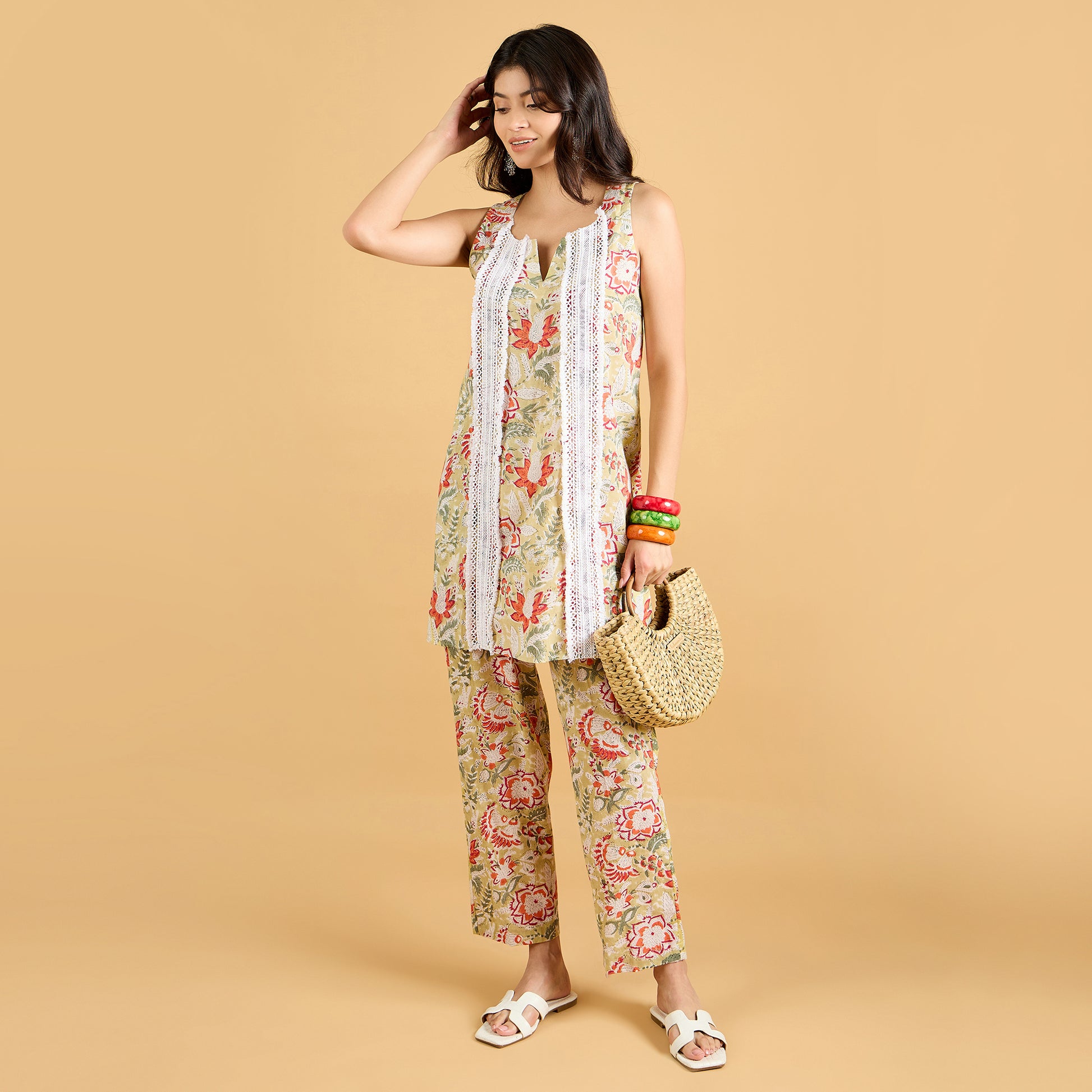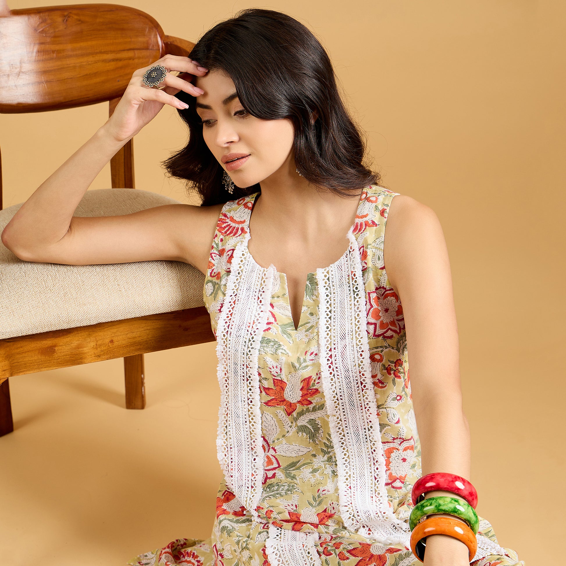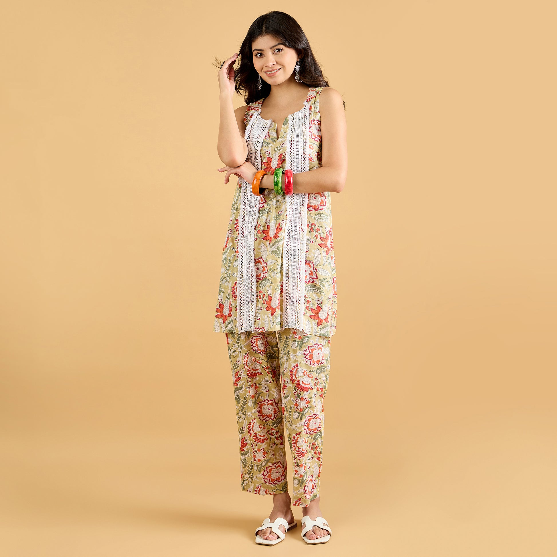 Easy, breezy, and full of charm – this co-ord style suit set in hand block printed cotton is your go-to for effortless everyday style. Made with soft, breathable fabric and finished with delicate lace detailing, it’s got that perfect balance of comfort and chic. Whether you’re heading out for errands or catching up over coffee, this set keeps you looking fresh and feeling great.