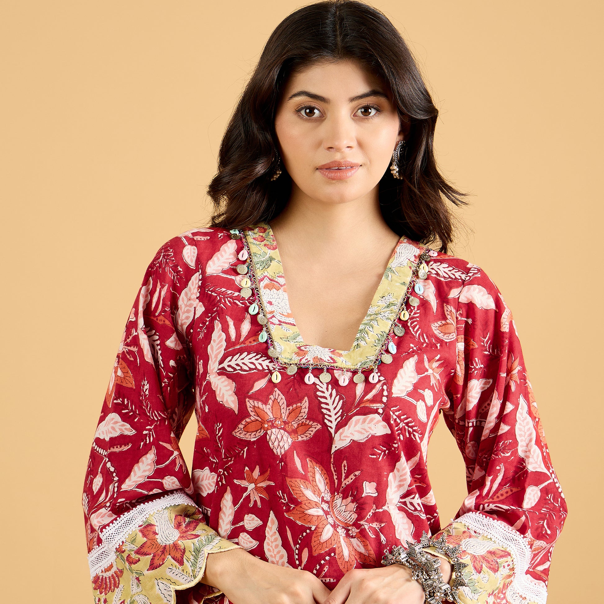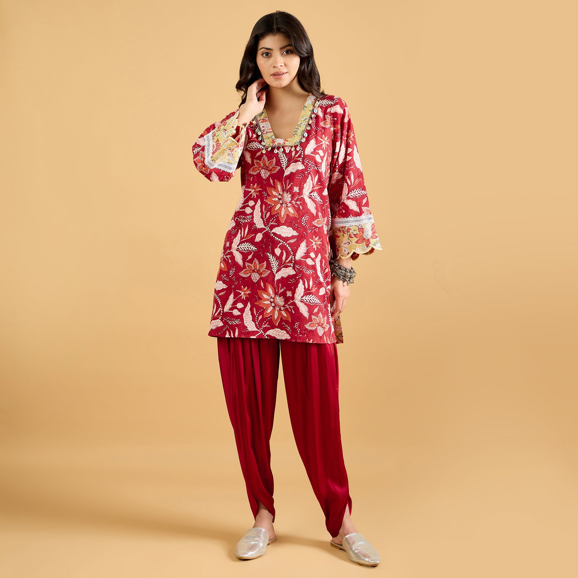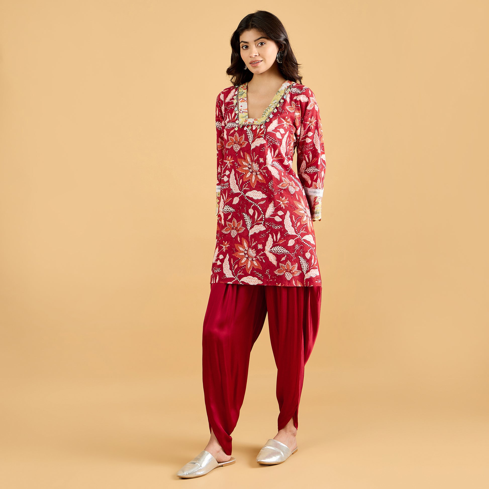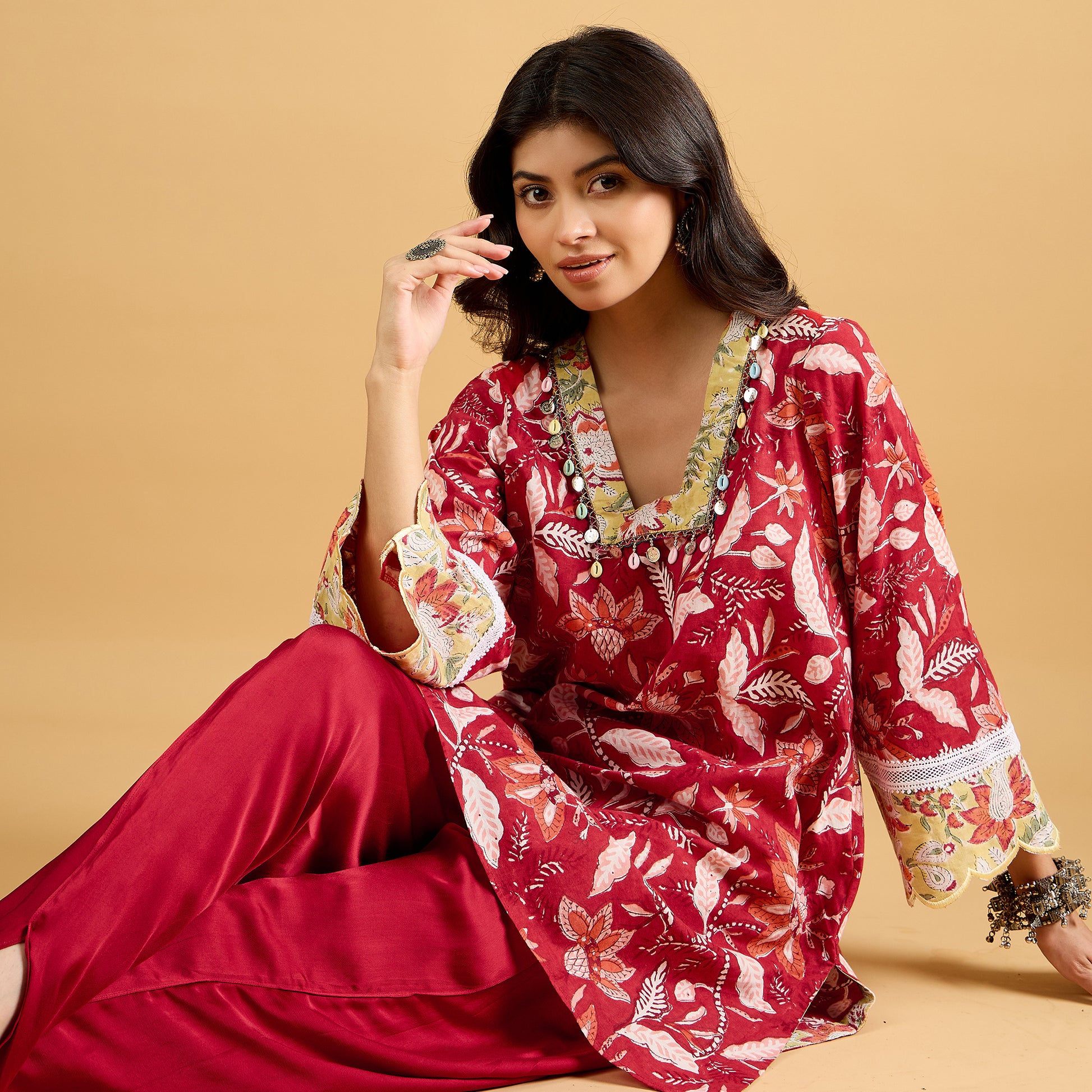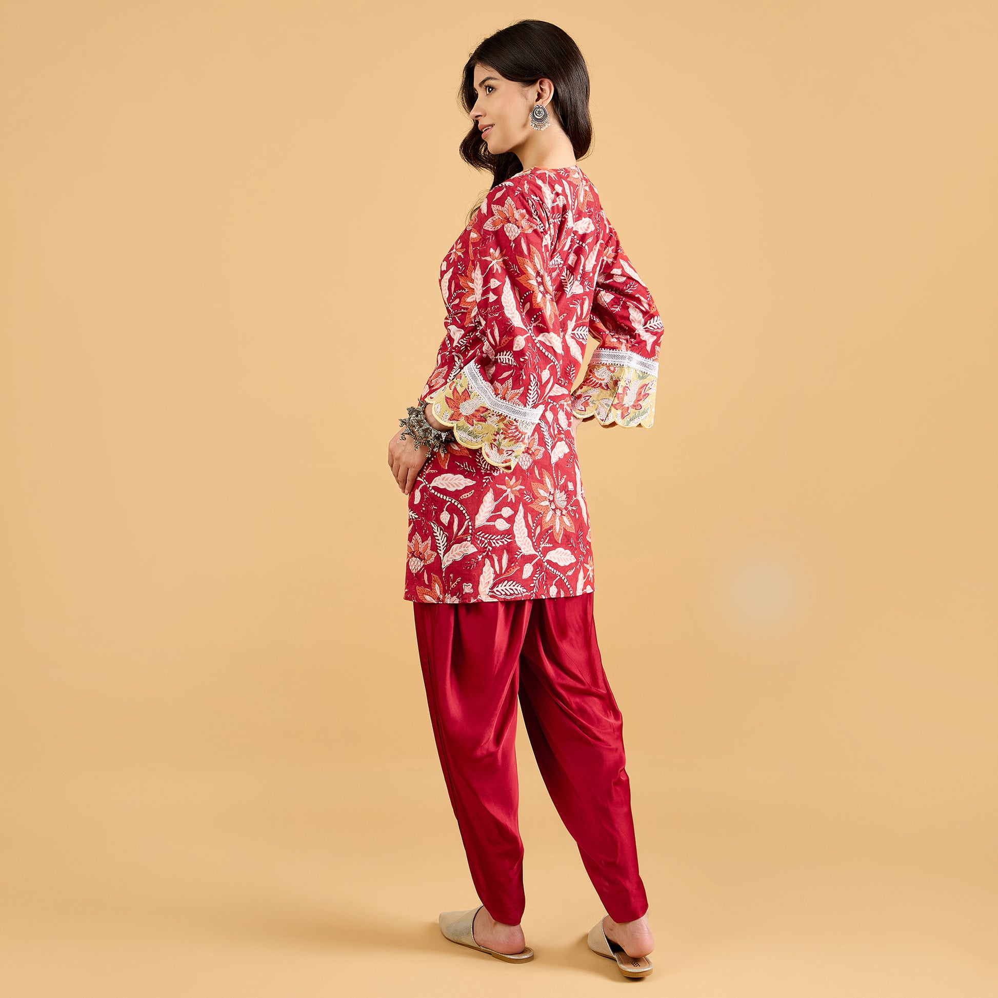 Give your ethnic wardrobe a fun twist with this dhoti suit set – a perfect blend of tradition and trend. The kurta is crafted in soft hand block printed cotton, finished with delicate lace detailing at the neckline and sleeves along with cut work embroidery detailing at the sleeves hem for that extra feminine touch. Paired with a flowy modal satin dhoti, it brings in just the right amount of drama and comfort.