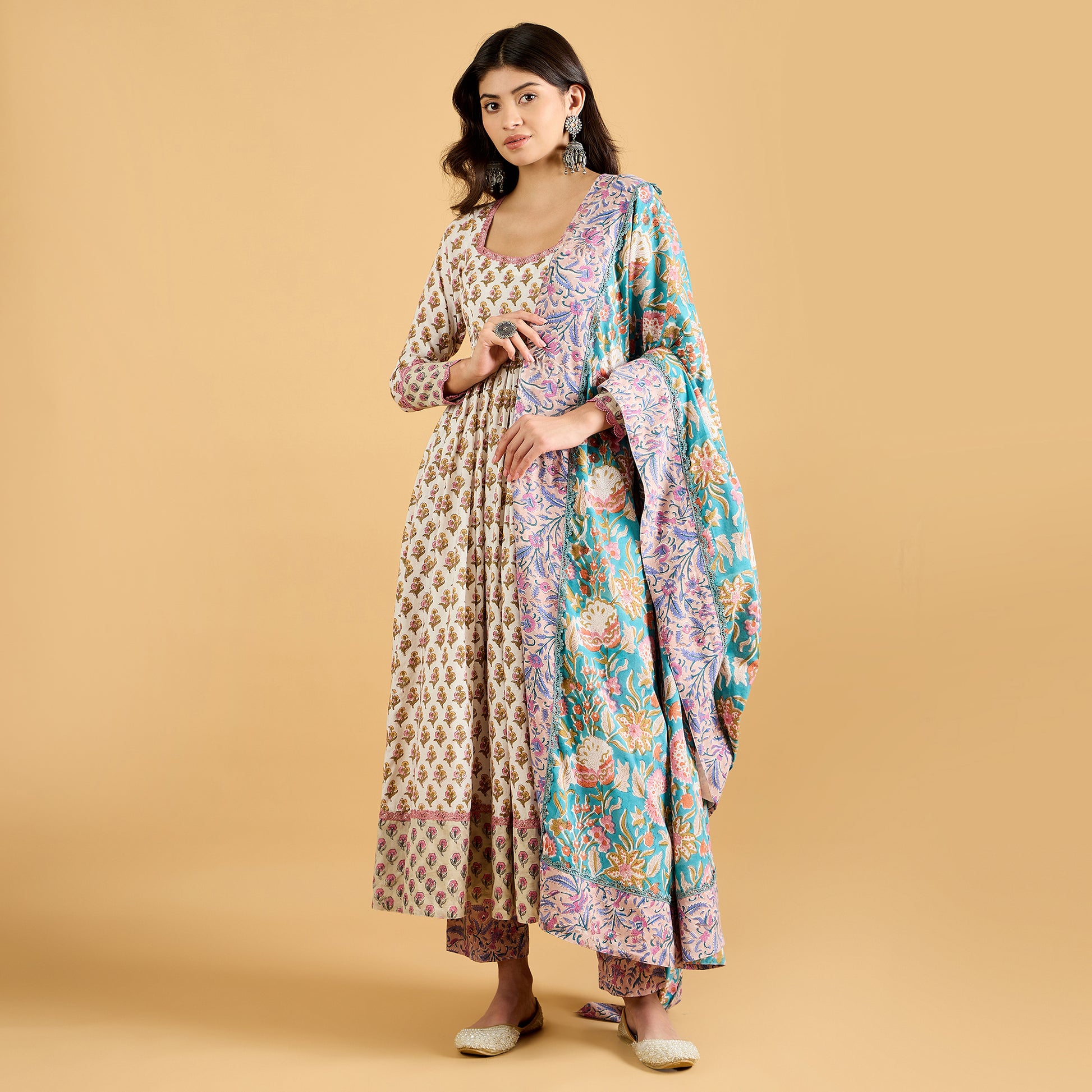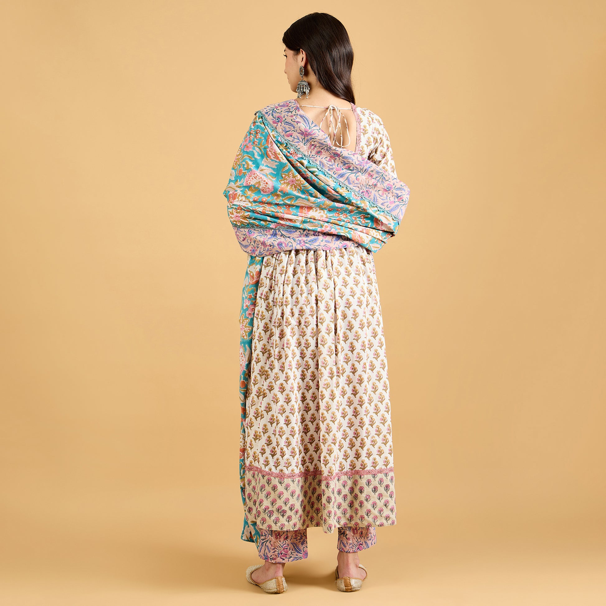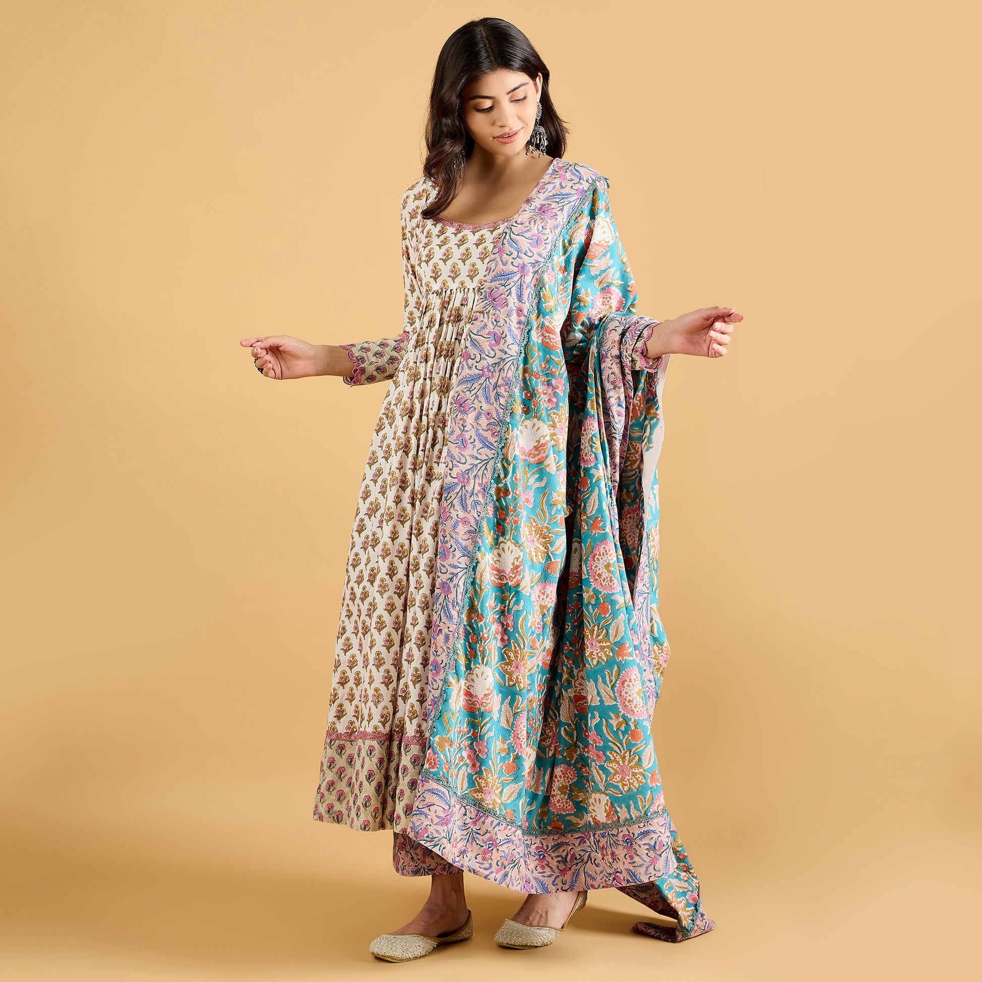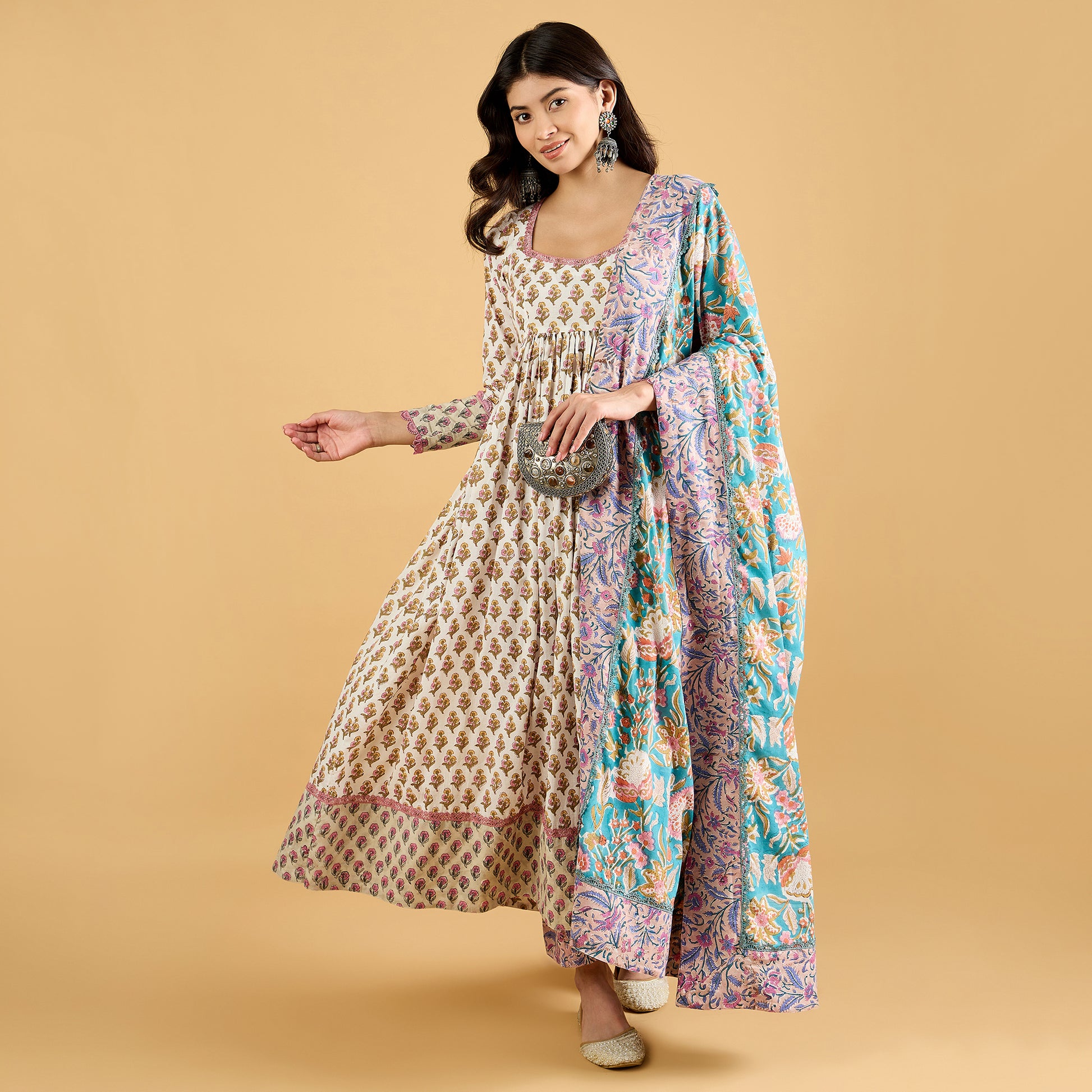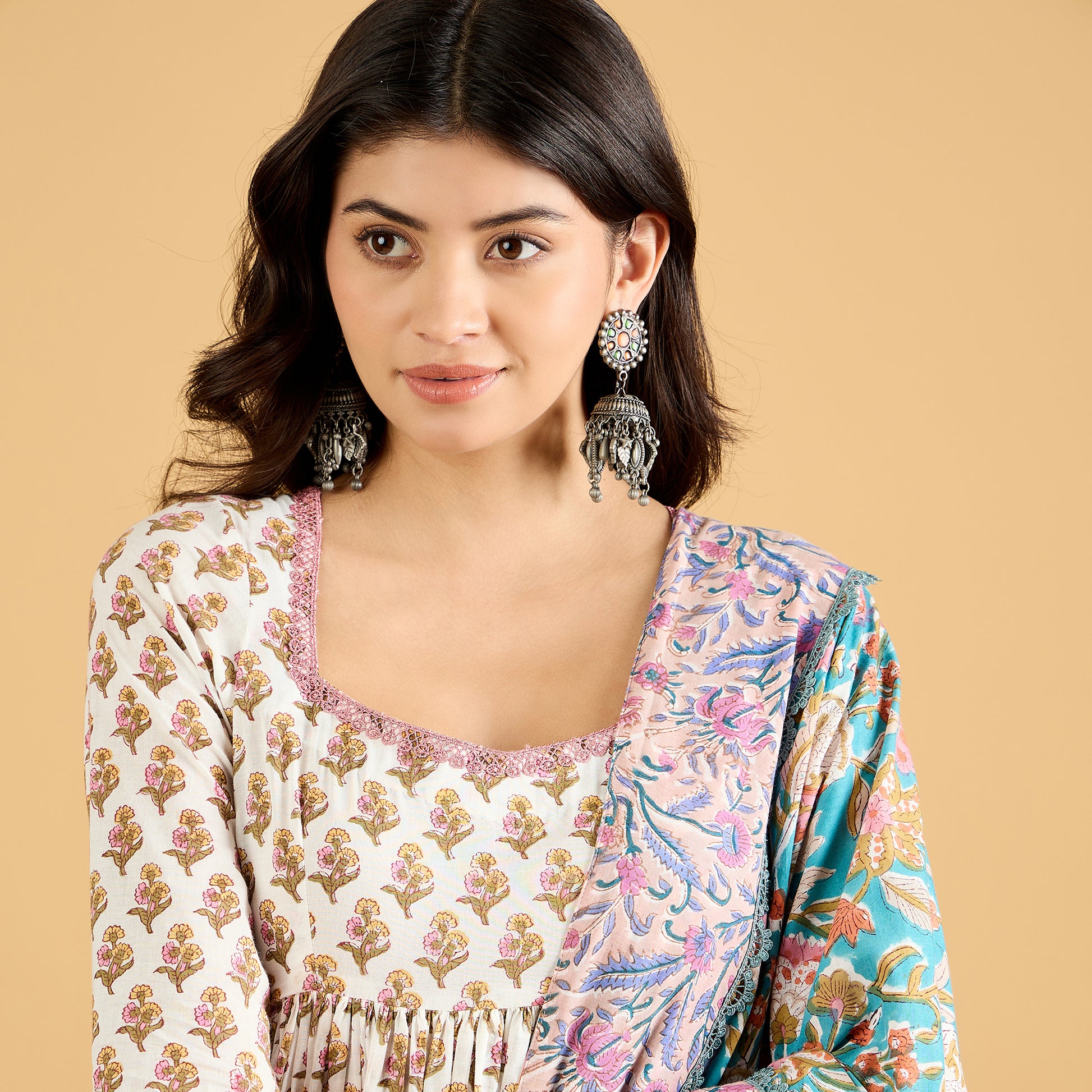 A Handblock printed cotton Anarkali kurta with lace detailing at neckline & hem along with border detailing at the hem with contrast block printed cotton pants and dupatta.