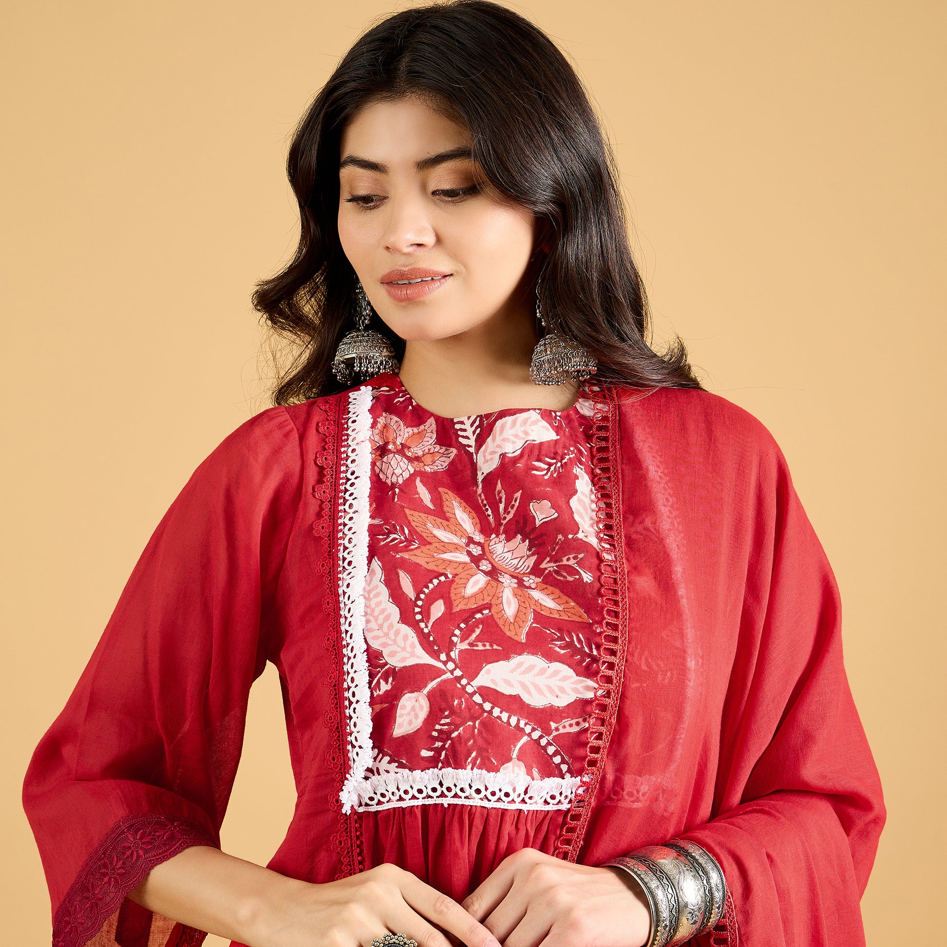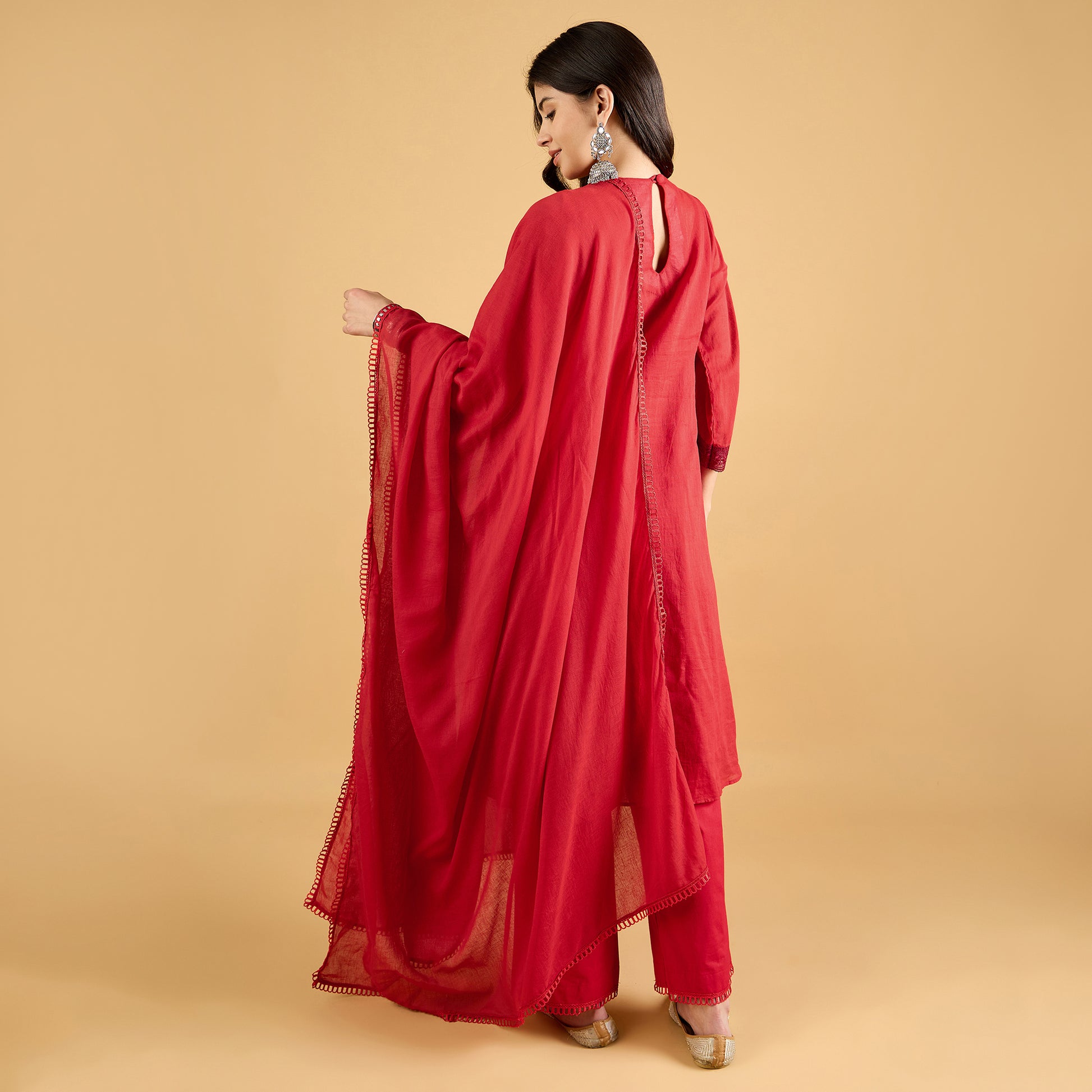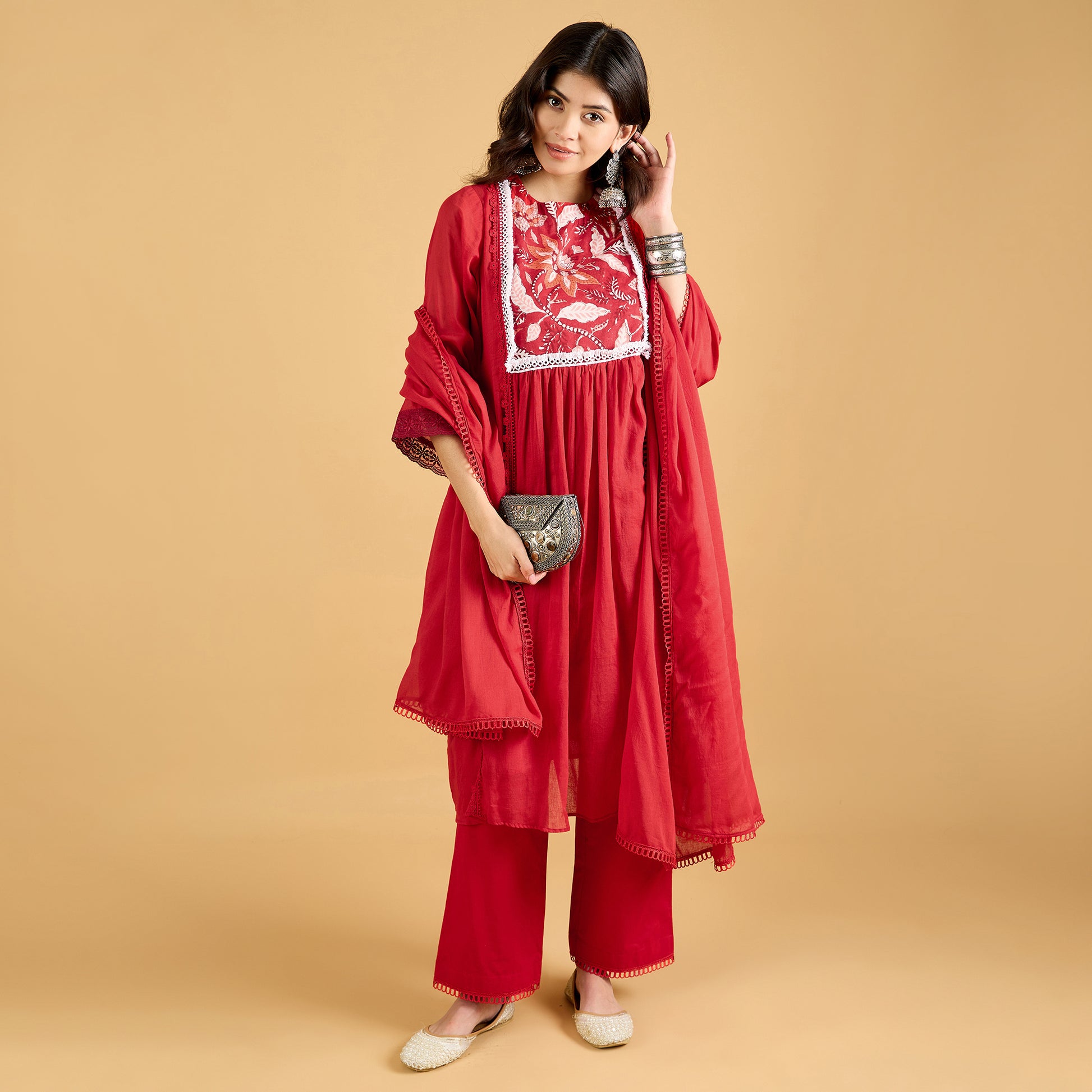 A cotton mulmul kurta with lace and fabric detailing paired with poplin cotton pants and mulmul dupatta, both adorned with lace.