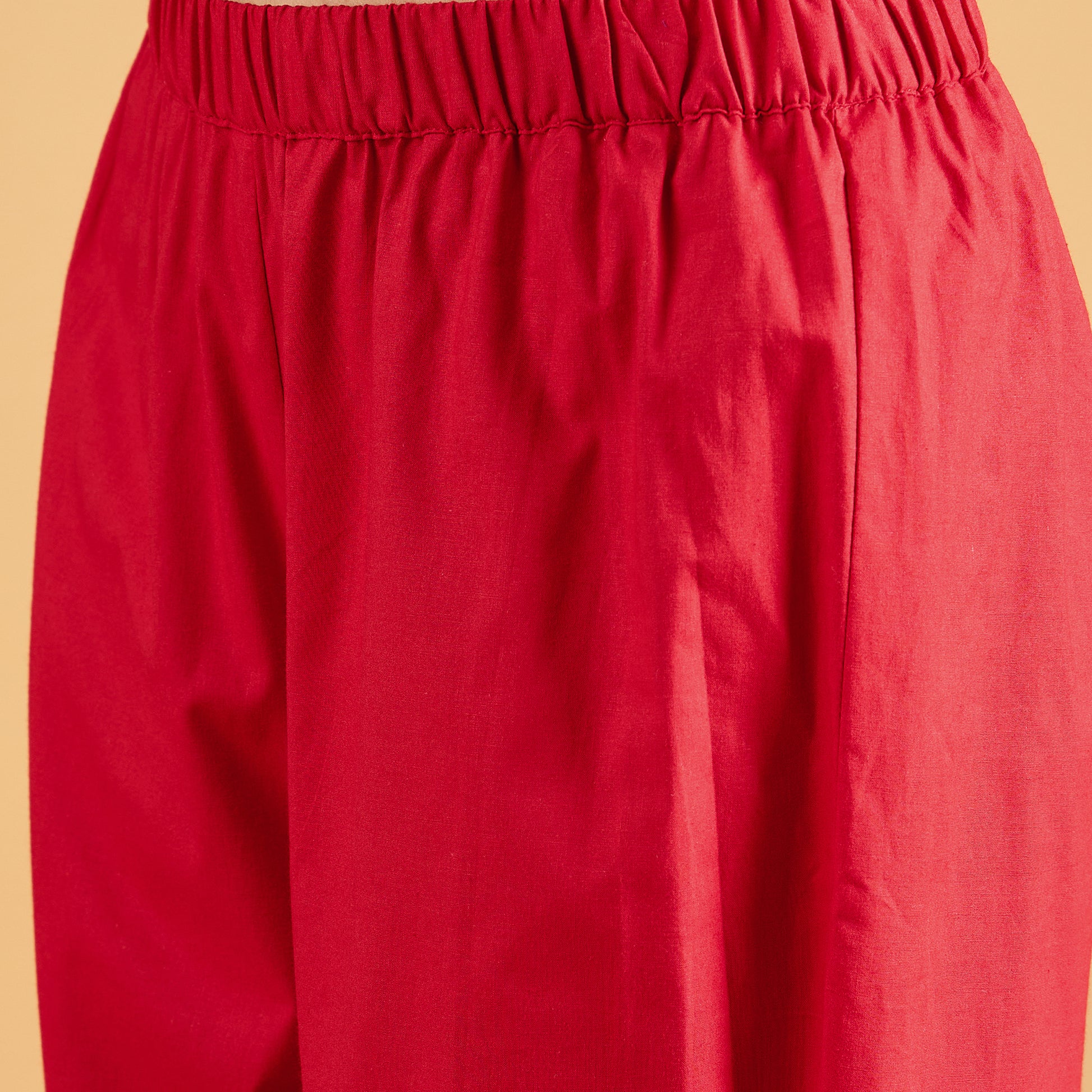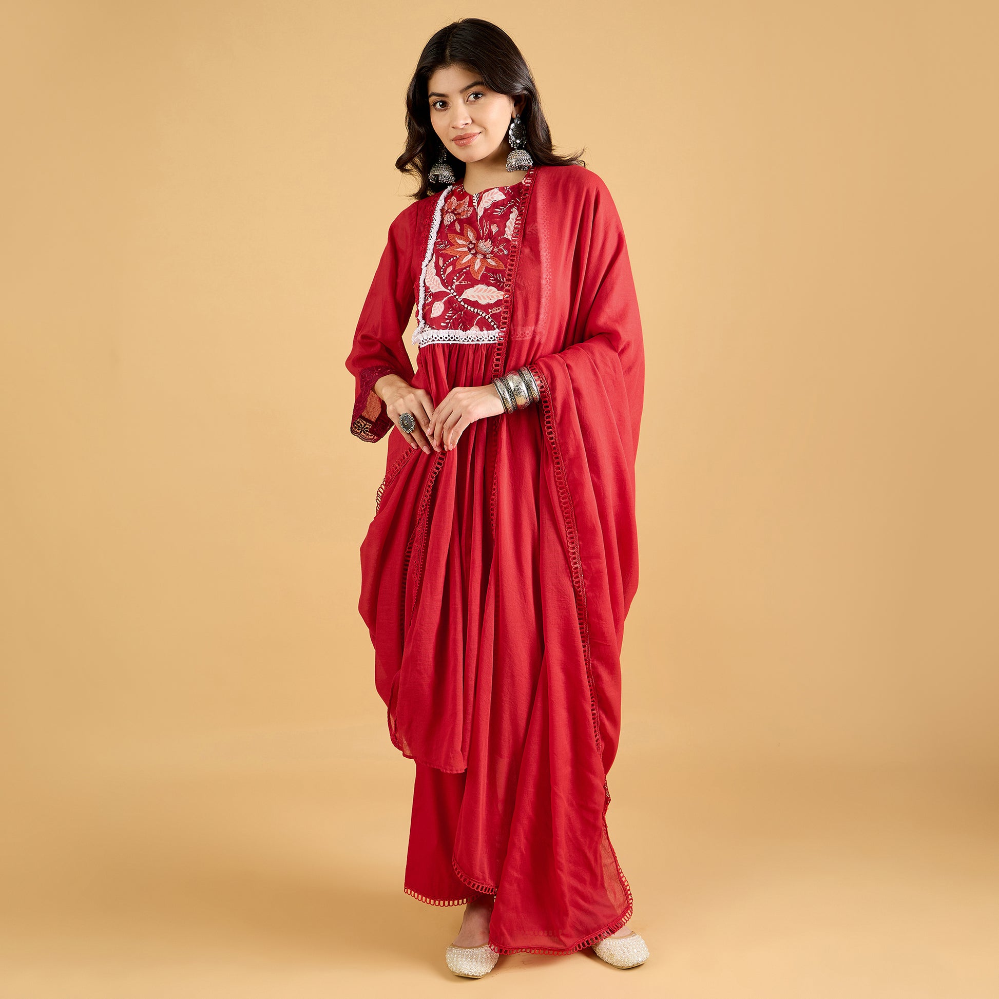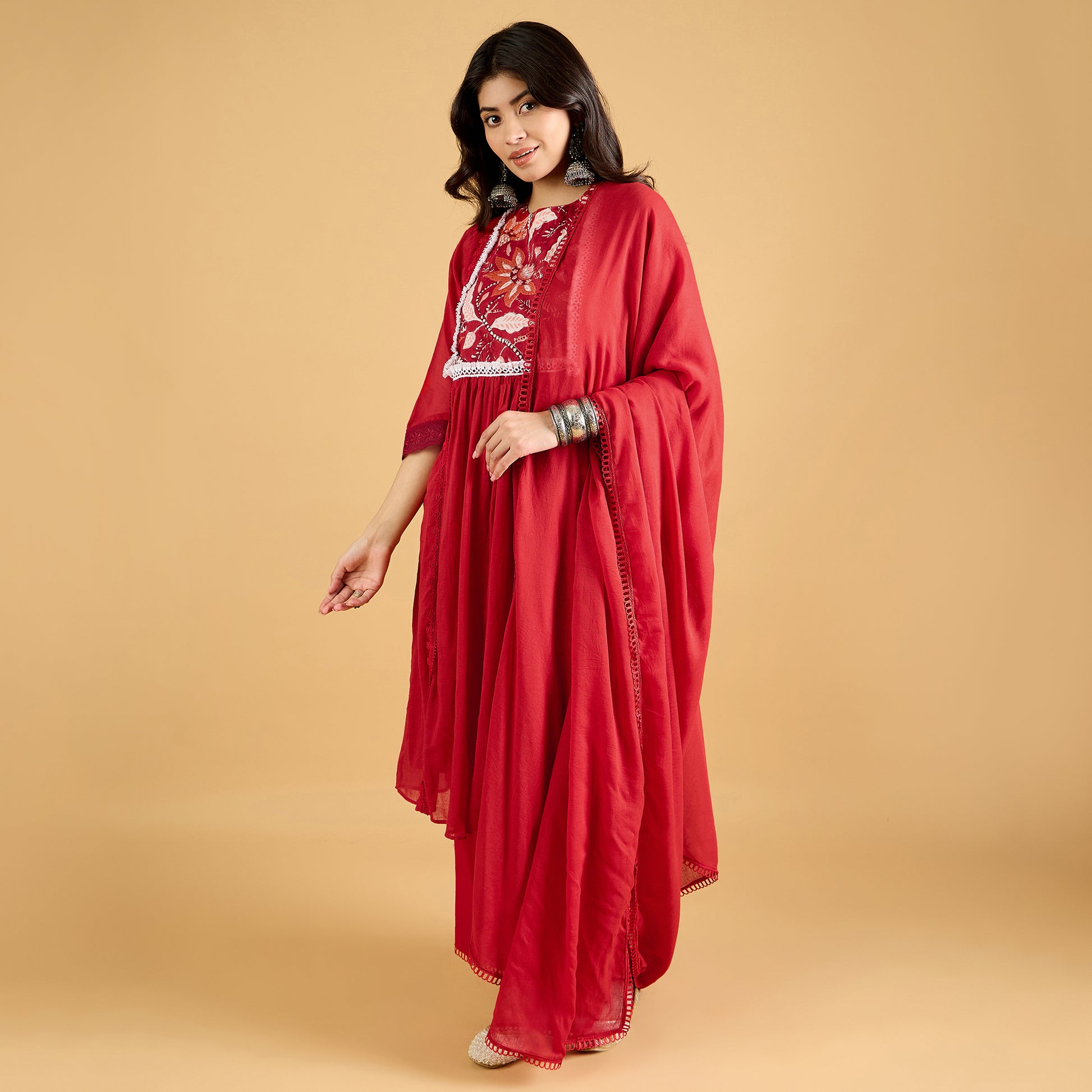 A cotton mulmul kurta with lace and fabric detailing paired with poplin cotton pants and mulmul dupatta, both adorned with lace.
