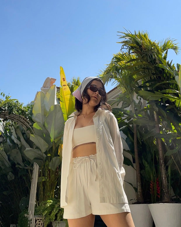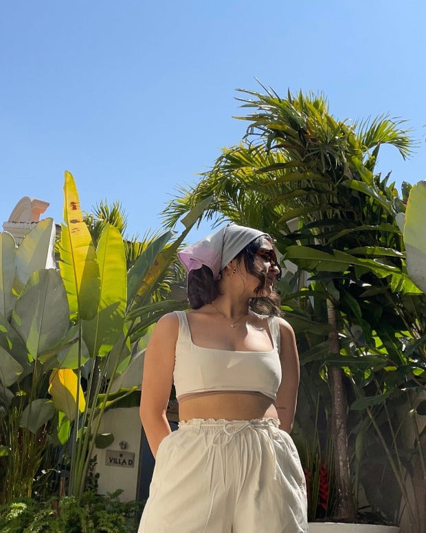 Crop top with square neckline and wide straps .Ties at the back.