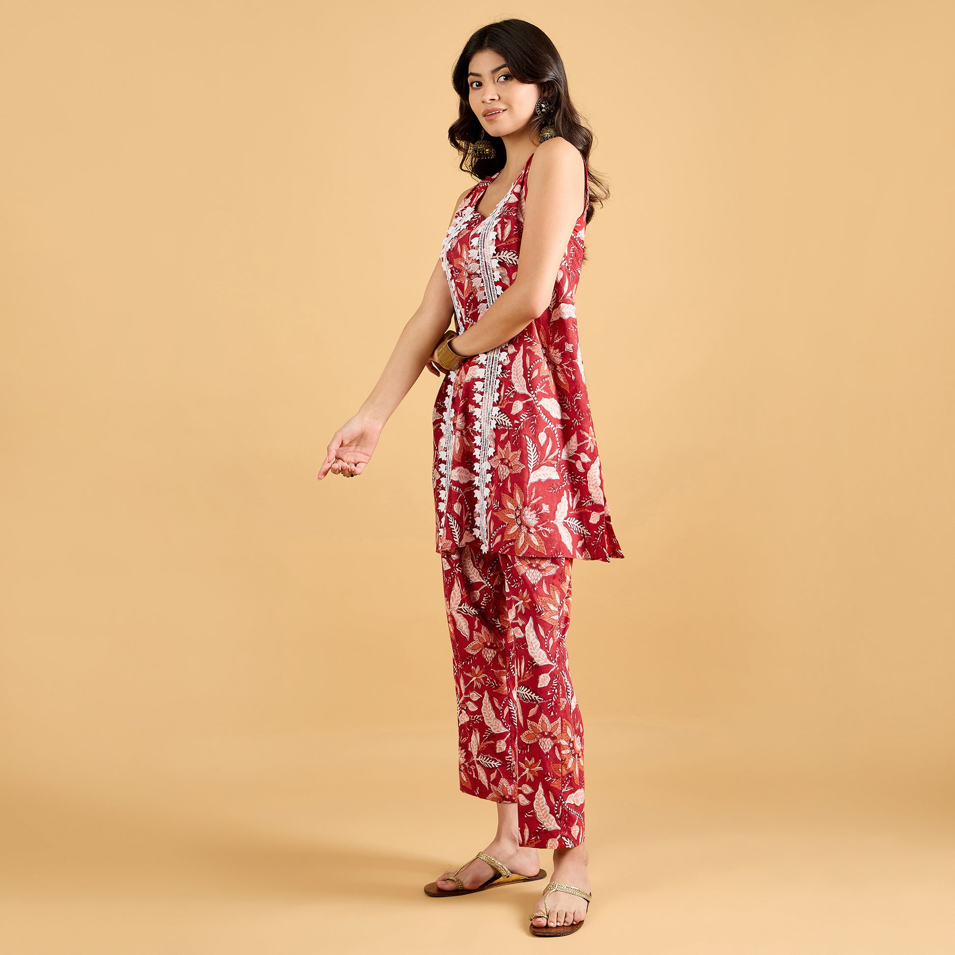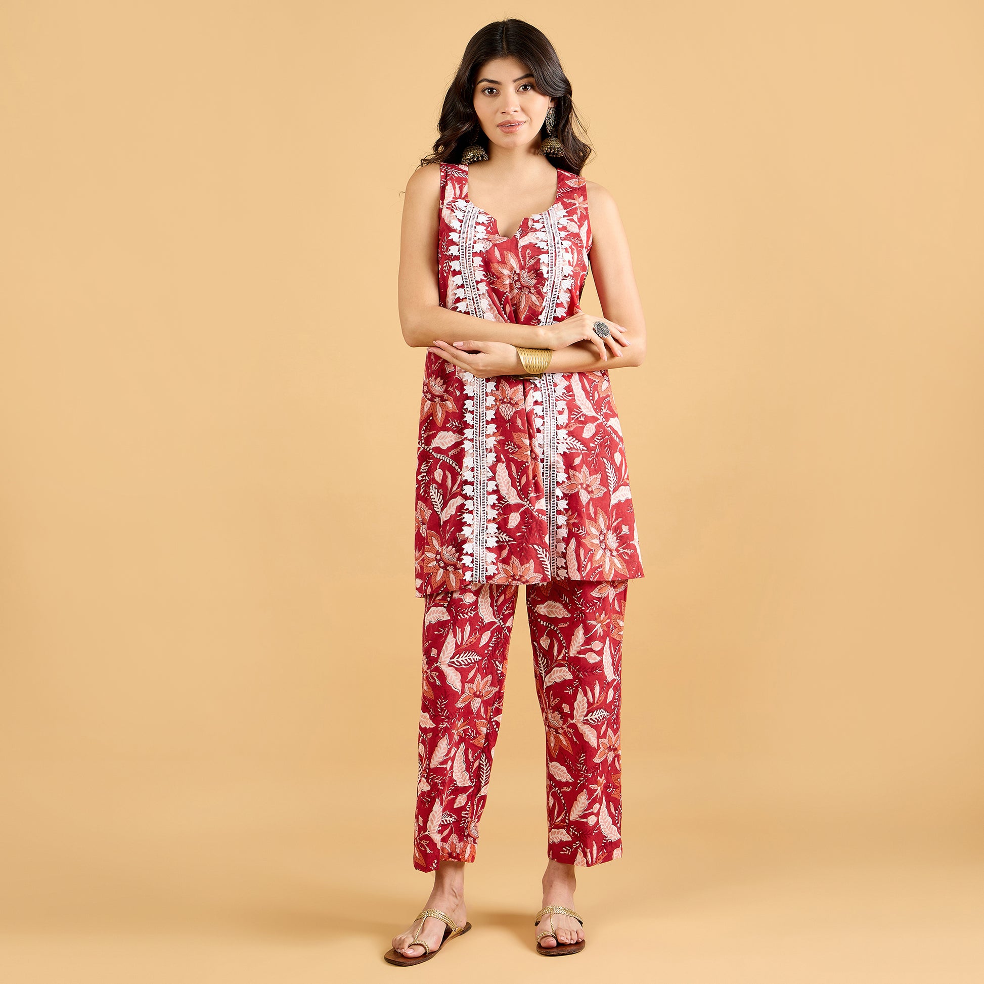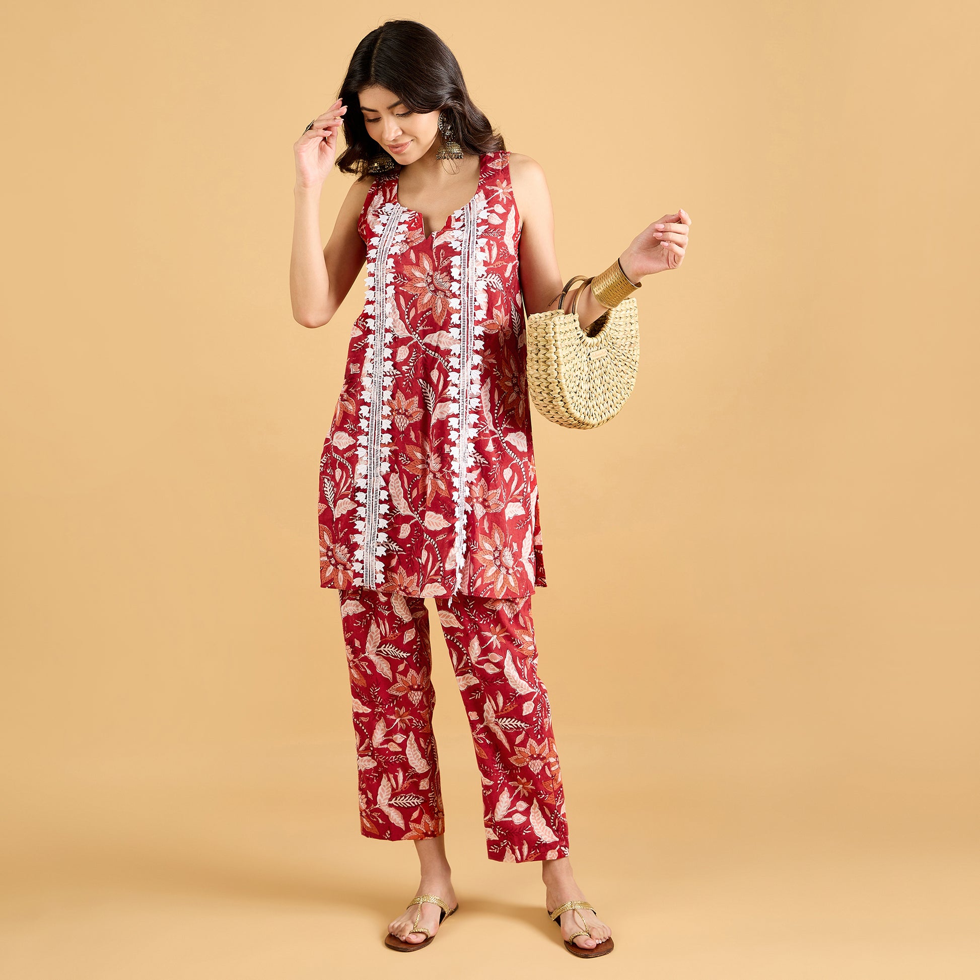 Easy, breezy, and full of charm – this co-ord style suit set in hand block printed cotton is your go-to for effortless everyday style. Made with soft, breathable fabric and finished with delicate lace detailing, it’s got that perfect balance of comfort and chic. Whether you’re heading out for errands or catching up over coffee, this set keeps you looking fresh and feeling great.