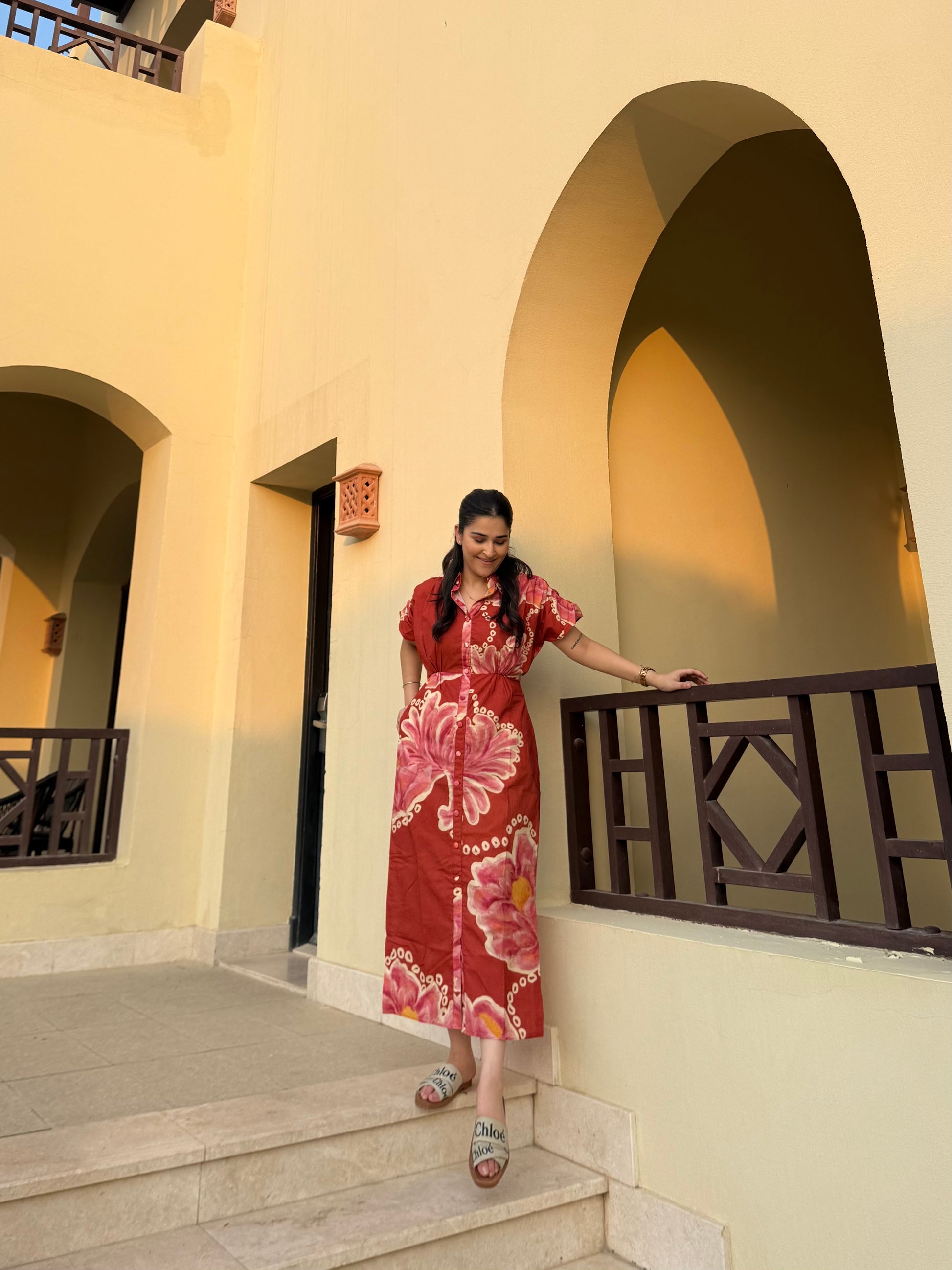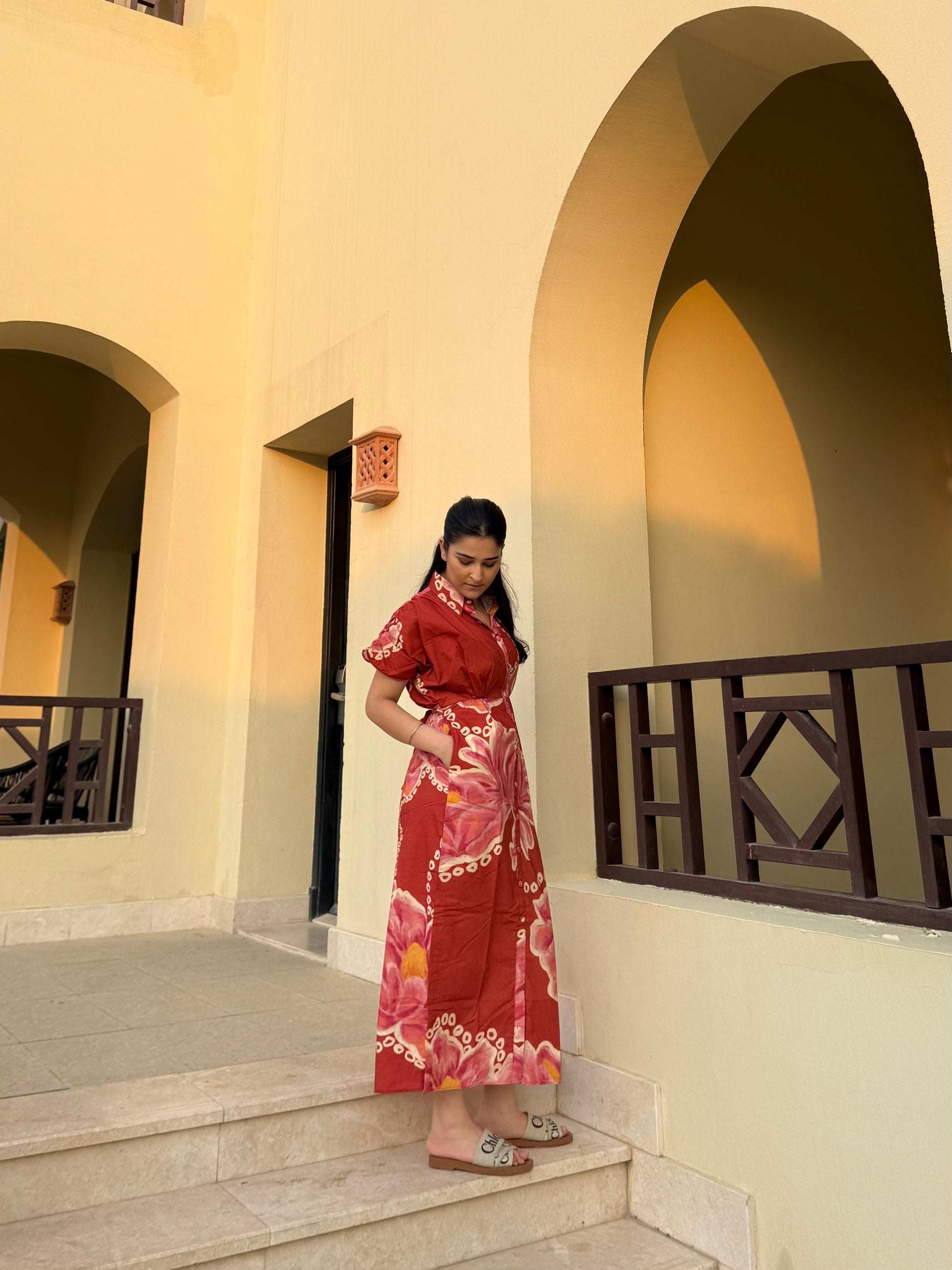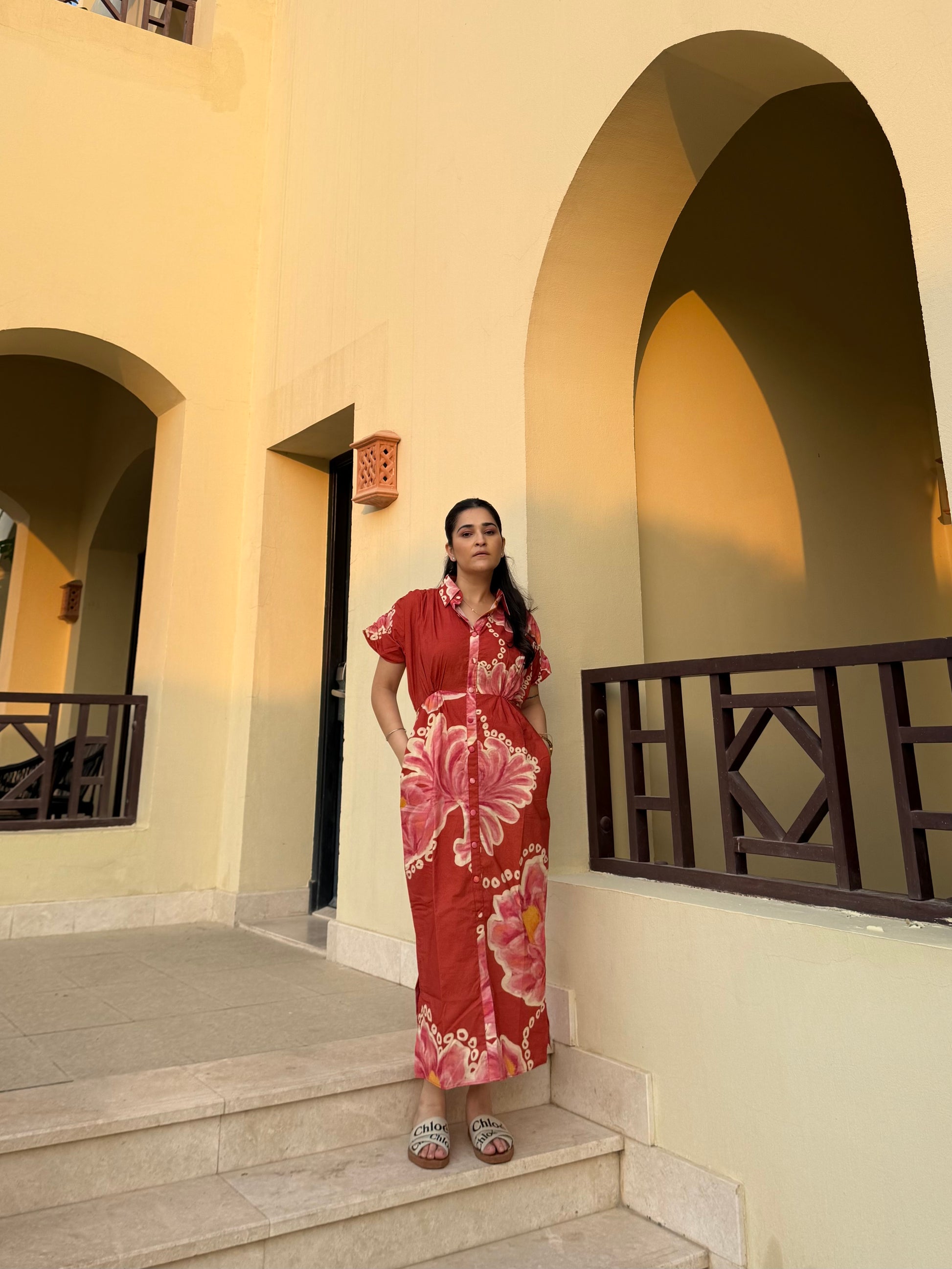This straight fit cotton dress is all about relaxed vibes with a touch of something special. Made from soft, breathable cotton and finished with a handcrafted print, it’s perfect for everyday wear — whether you’re running errands or meeting up with friends.The dress features cool statement sleeves and shoulder details that make it stand out without trying too hard. Tie-up accents at the waist back add a fun and snatched twist. Oh, and yes — it has pockets.