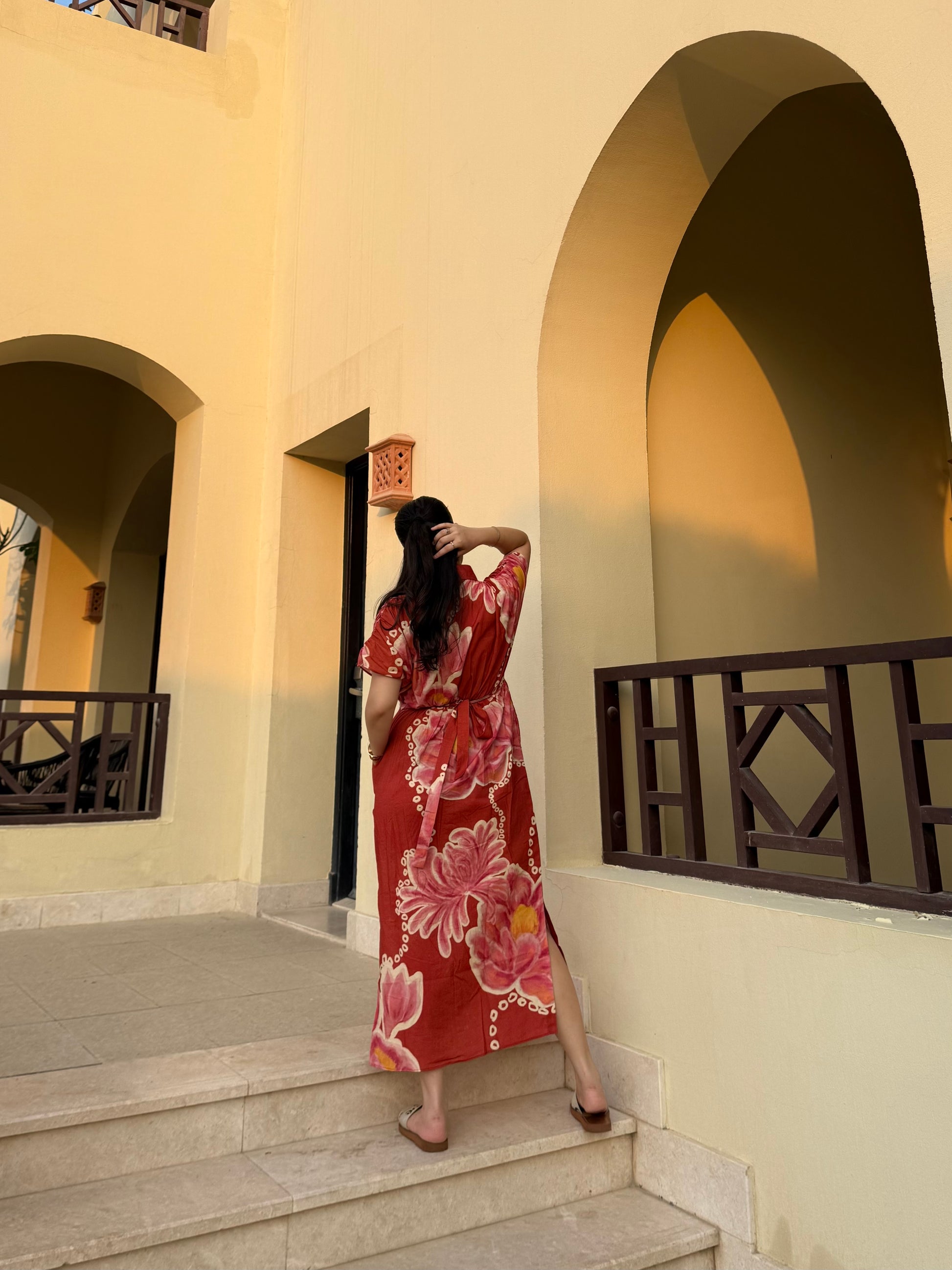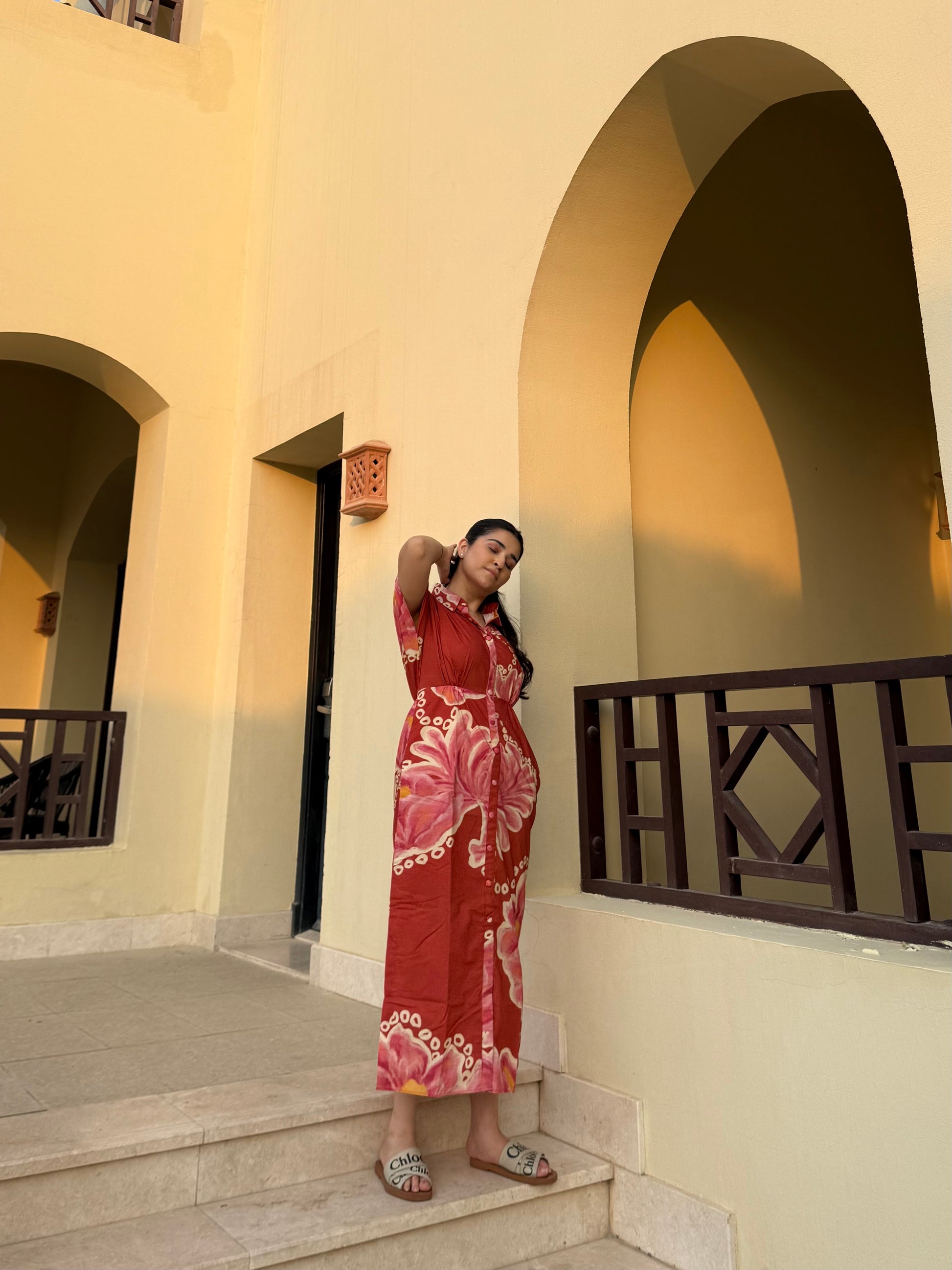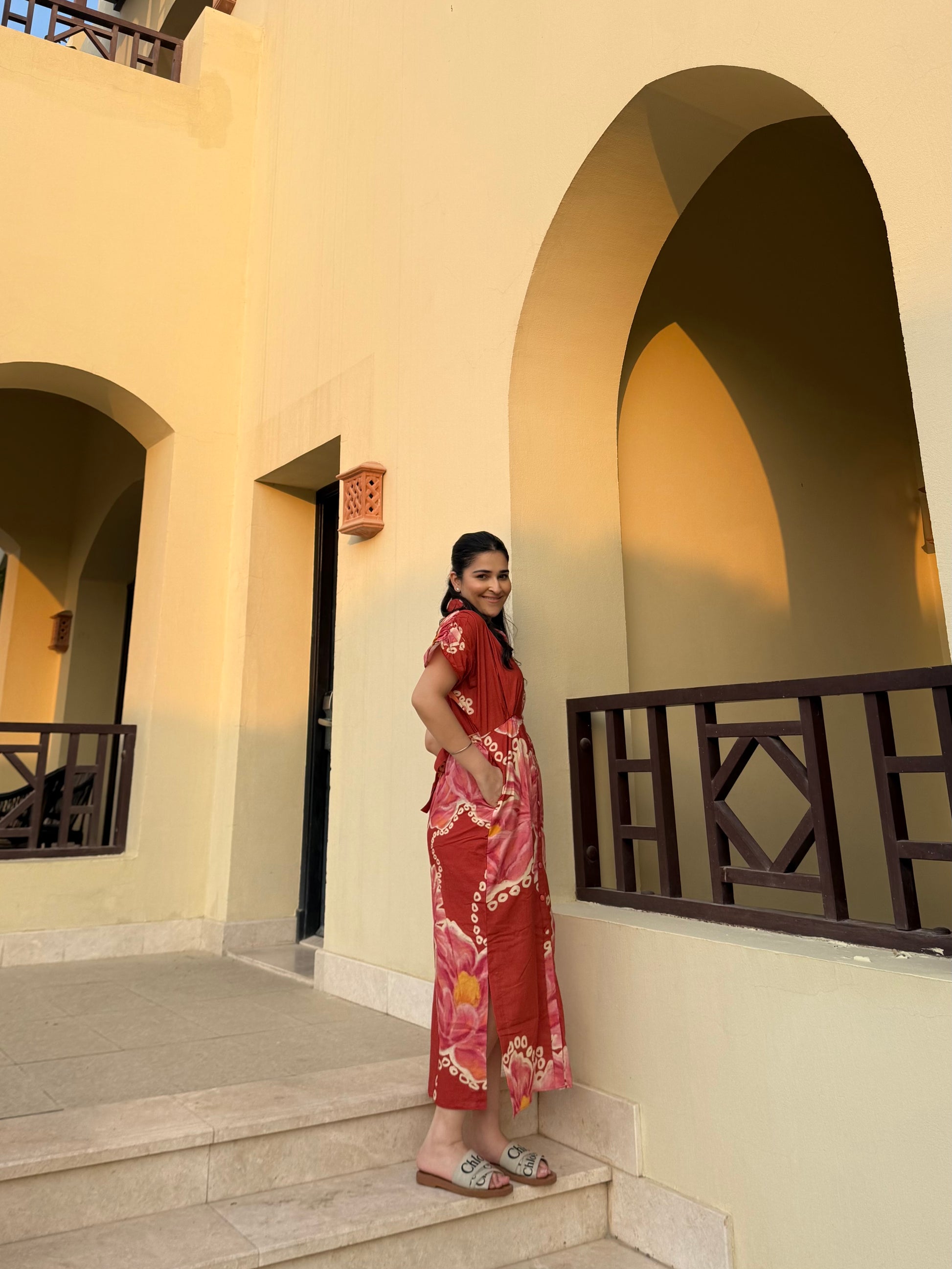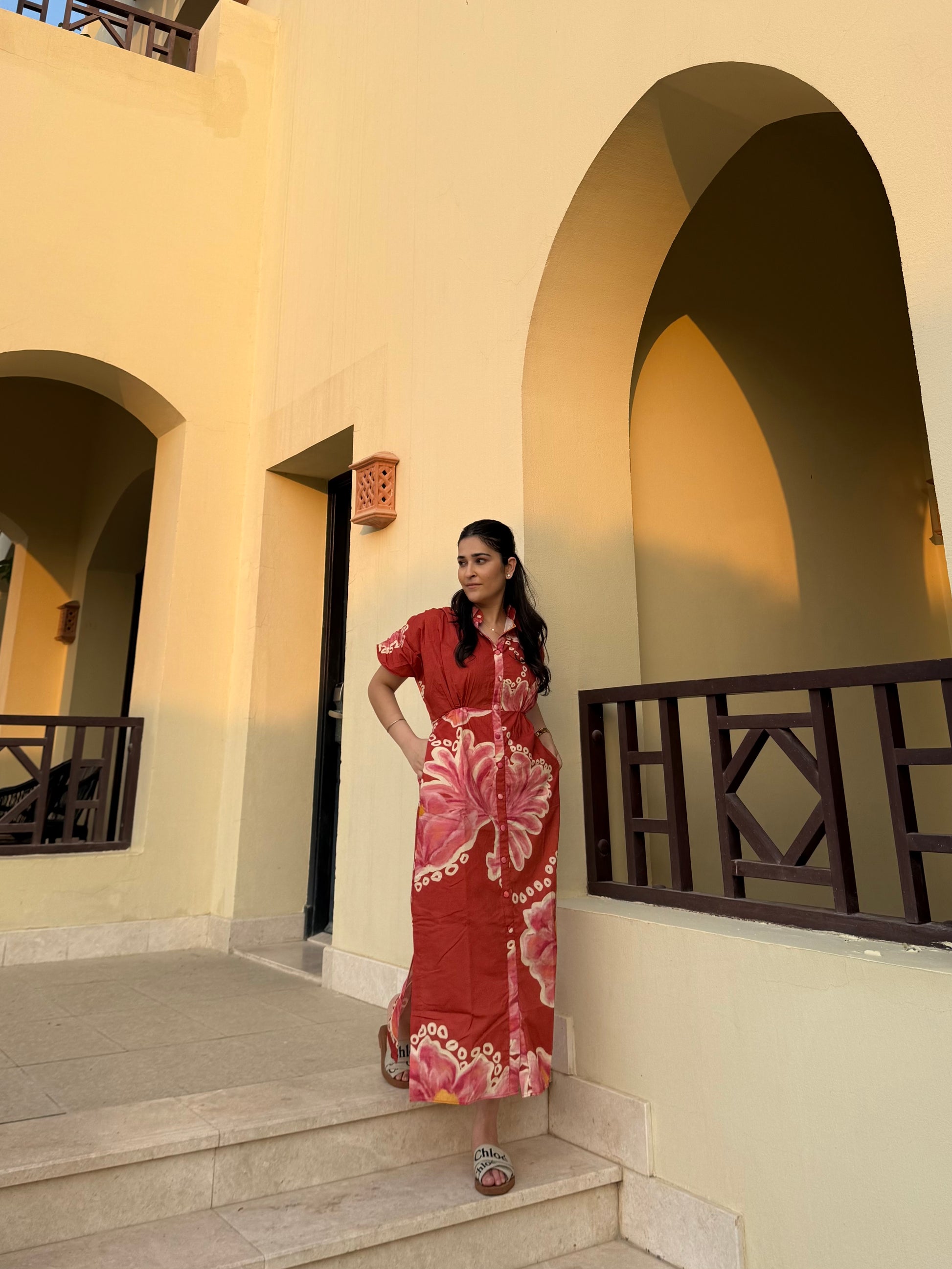 This straight fit cotton dress is all about relaxed vibes with a touch of something special. Made from soft, breathable cotton and finished with a handcrafted print, it’s perfect for everyday wear — whether you’re running errands or meeting up with friends.The dress features cool statement sleeves and shoulder details that make it stand out without trying too hard. Tie-up accents at the waist back add a fun and snatched twist. Oh, and yes — it has pockets.