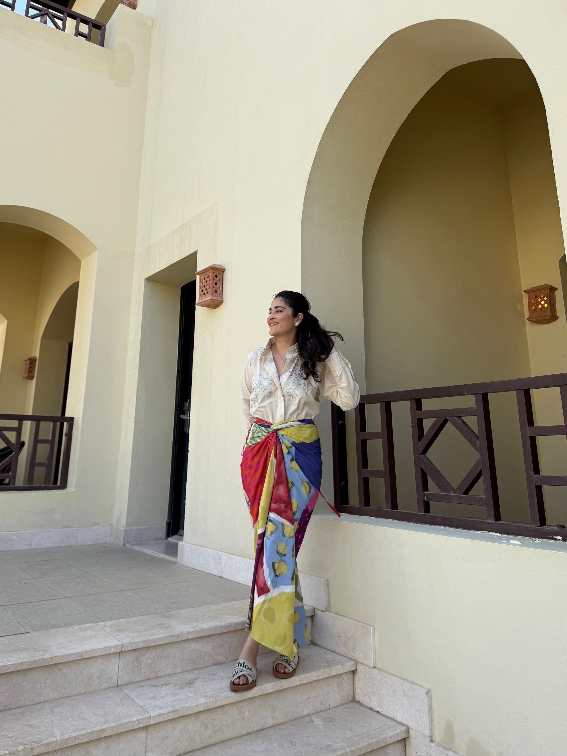 This two-piece set brings together the ease of soft cotton with the joy of bold print and delicate detail. The tie-up drape skirt wraps around you with a flattering, fuss-free fit, made in vibrant printed cotton that feels like sunshine. It sways with every step, like it knows you’re headed somewhere fun. The embroidered shirt adds a gentle, handcrafted charm — simple, light, and just dressy enough to go from a slow evening coffee to a last-minute dinner plan. Whether you wear the set together or mix it with your everyday faves, it’s made for those in-between moments that turn into memories.