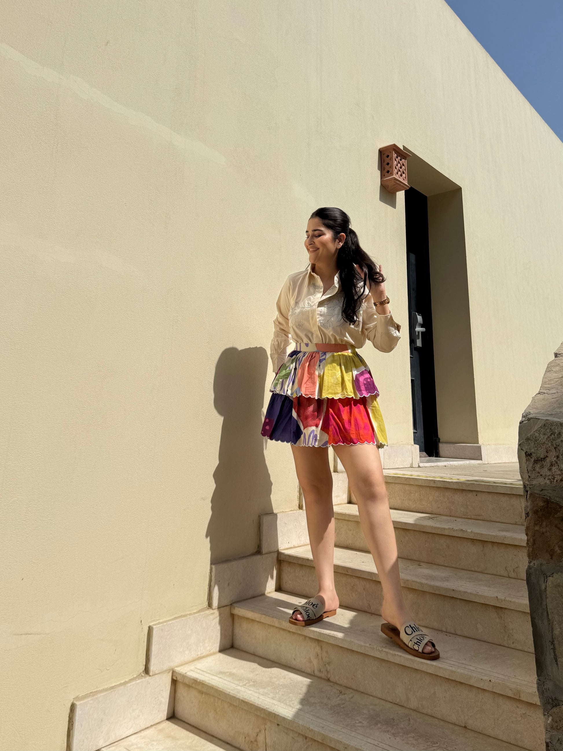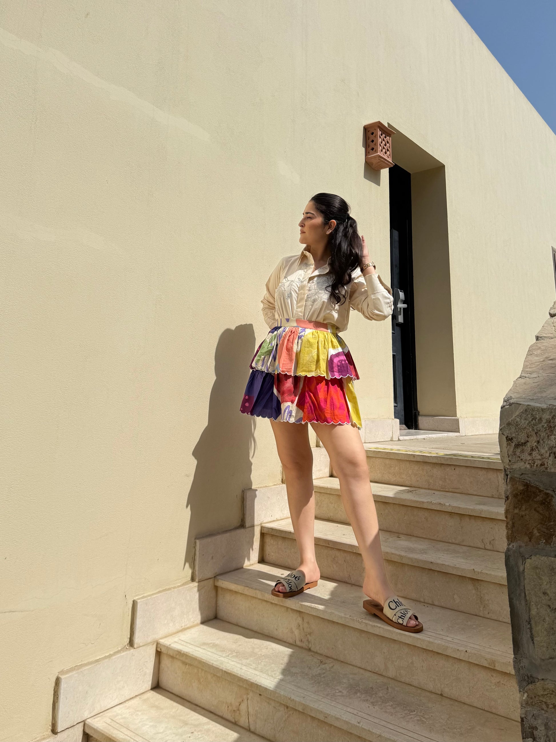 Say hello to your new favorite set — cute, comfy, and made to make plans in. This two-piece combo brings all the fun with a tiered mini skirt in a vibrant all-over print, finished with sweet scalloped edges that give it that extra twirl factor. The elasticated waist keeps things easy, whether you’re out for brunch, at the beach, or dancing barefoot somewhere sunny. On top, the embroidered cotton shirt adds a breezy, handcrafted vibe — slightly structured but totally relaxed, so you can style it buttoned up, half-tucked, or tied at the waist. Worn together, it’s an effortless outfit. Worn apart? Endless possibilities.