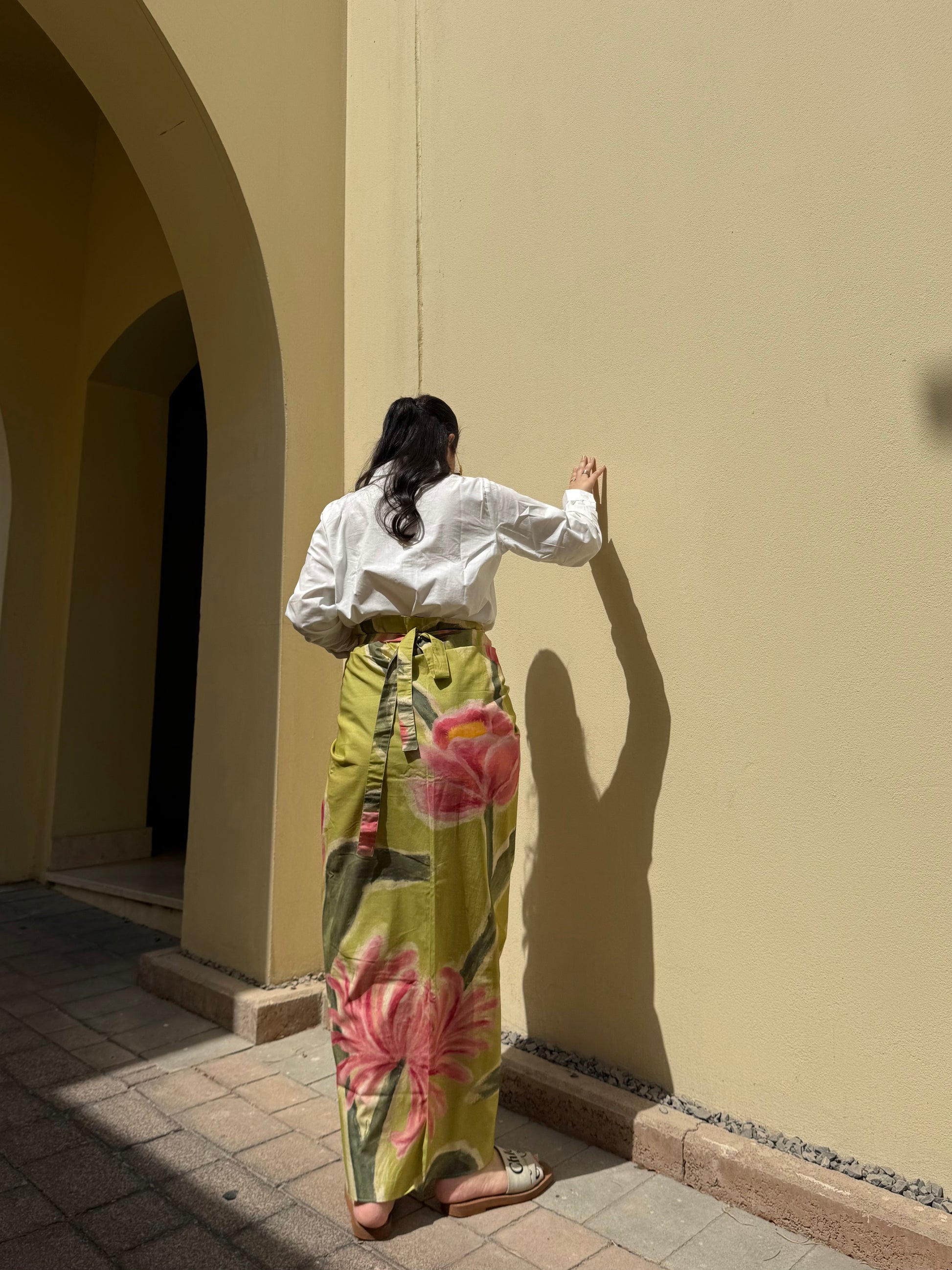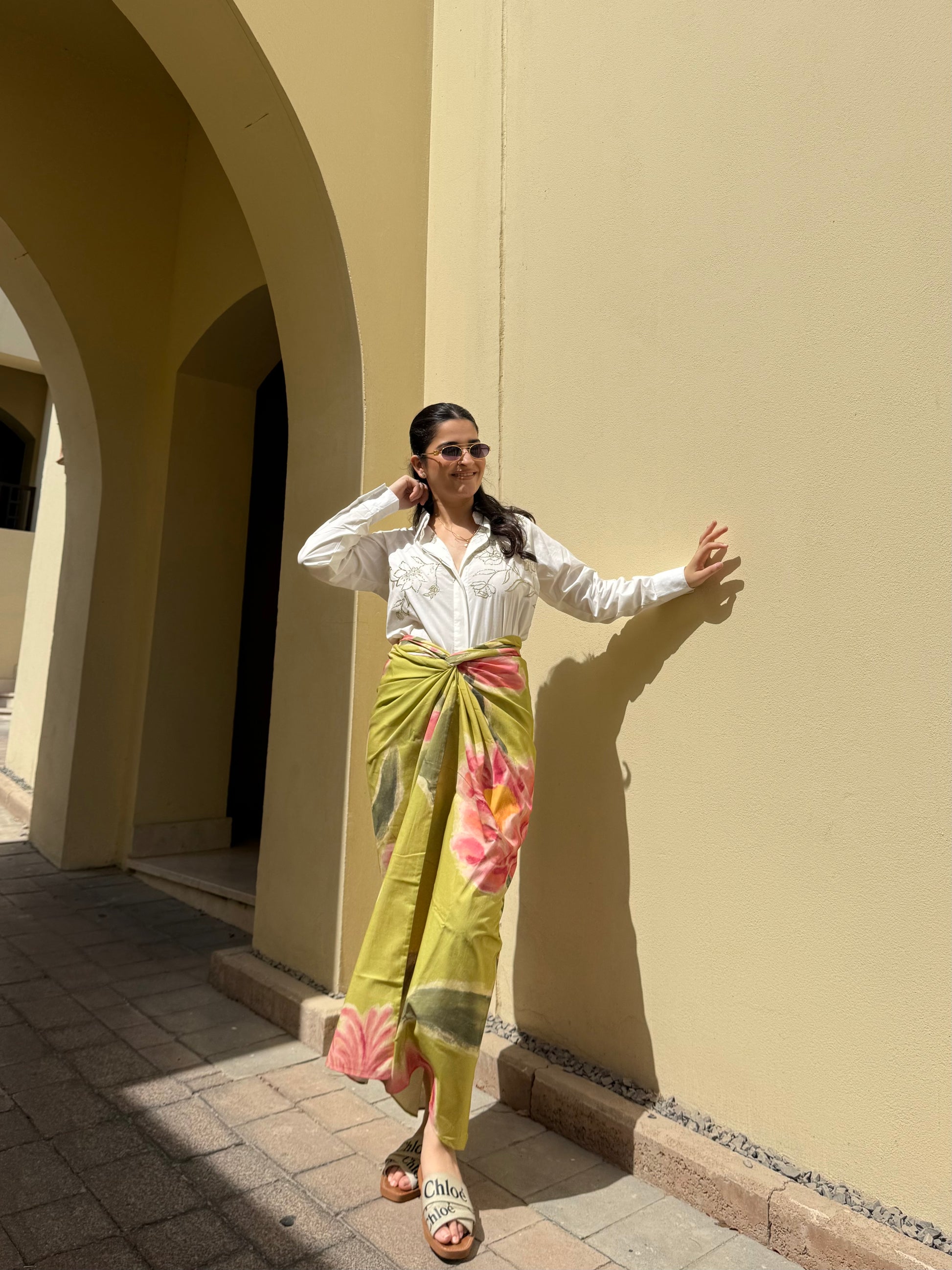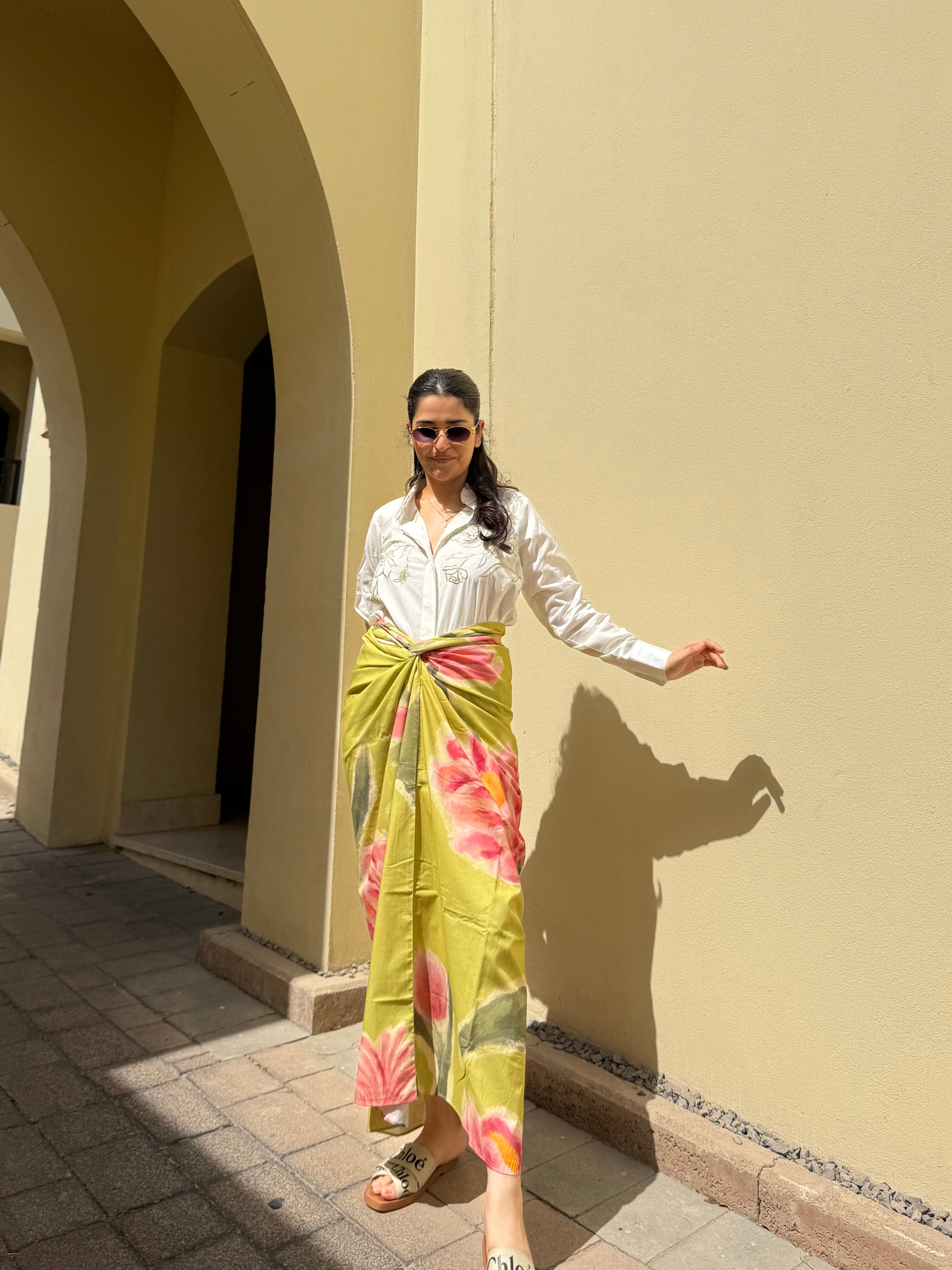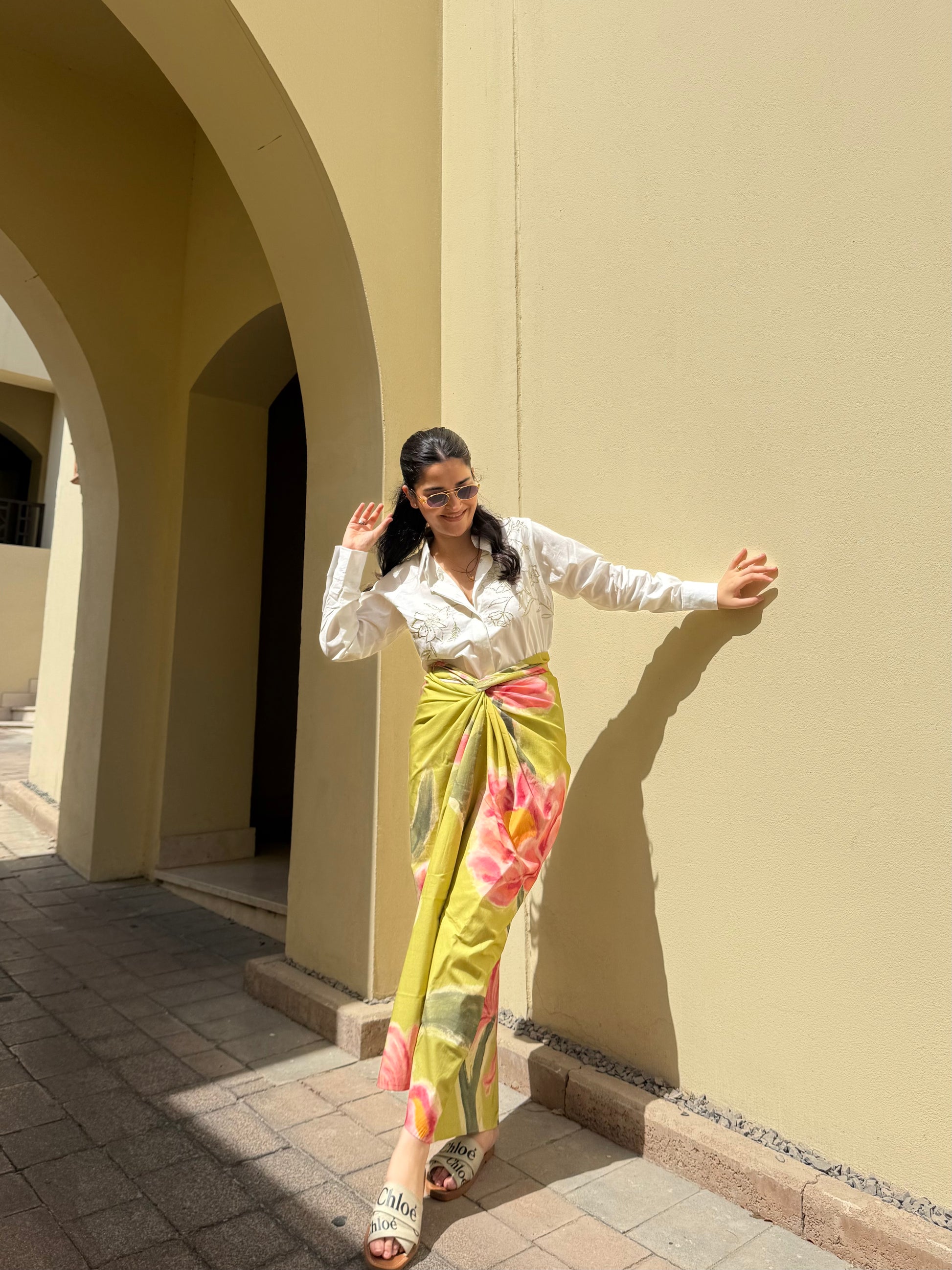 This two-piece set brings together the ease of soft cotton with the joy of bold print and delicate detail. The tie-up drape skirt wraps around you with a flattering, fuss-free fit, made in vibrant printed cotton that feels like sunshine. It sways with every step, like it knows you’re headed somewhere fun. The embroidered shirt adds a gentle, handcrafted charm — simple, light, and just dressy enough to go from a slow evening coffee to a last-minute dinner plan. Whether you wear the set together or mix it with your everyday faves, it’s made for those in-between moments that turn into memories.